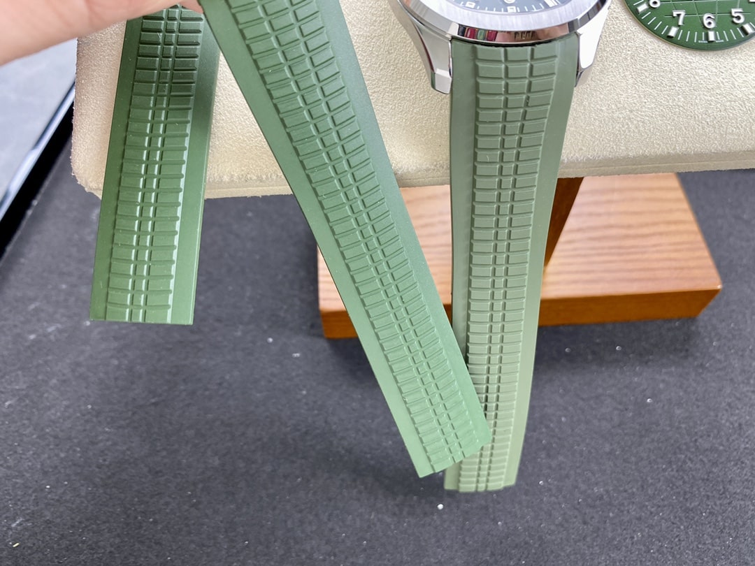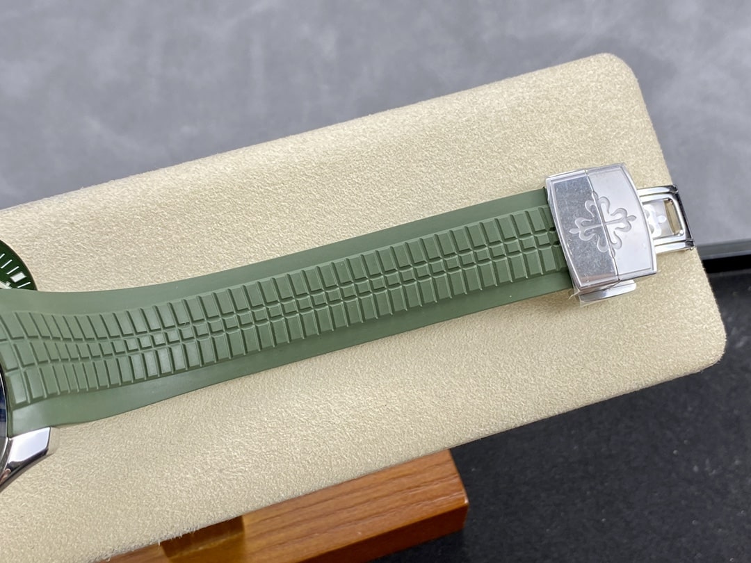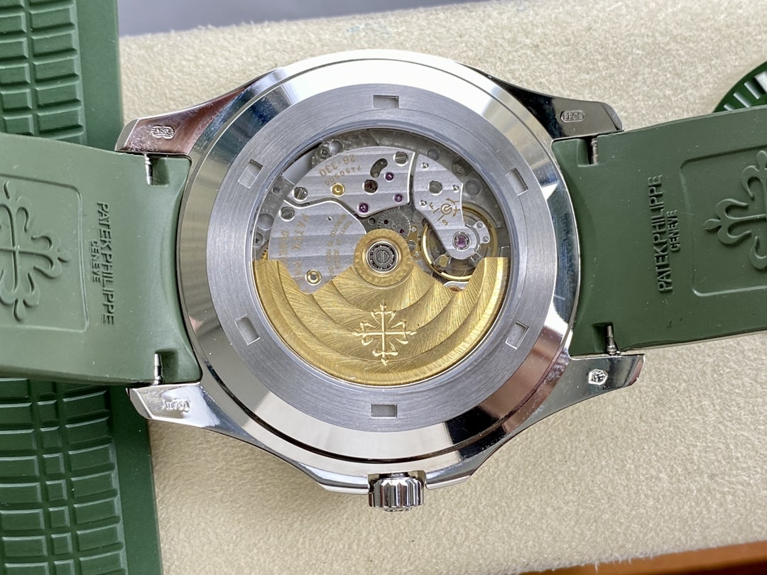 除此之外客戶還需求更改代用橡膠錶帶,錶帶的話倒不是什麼重要的問題,因為錶帶也是可以佩戴假的.然後更換代用錶帶的話就是顏色上會淺綠色一點,因為正品的錶帶也是淺綠色的.這個改不改就看個人需求的,不改也是可以的,如果想要更美觀更符合正品的味道那就改.然後底蓋是背透機芯,可以看到此次3K廠百達翡麗搭載了最新款的SC330機芯也是同步正品使用的機芯.如果擔心甲板存在問題,也是可以更改代用甲板的去消化不對版的甲板.