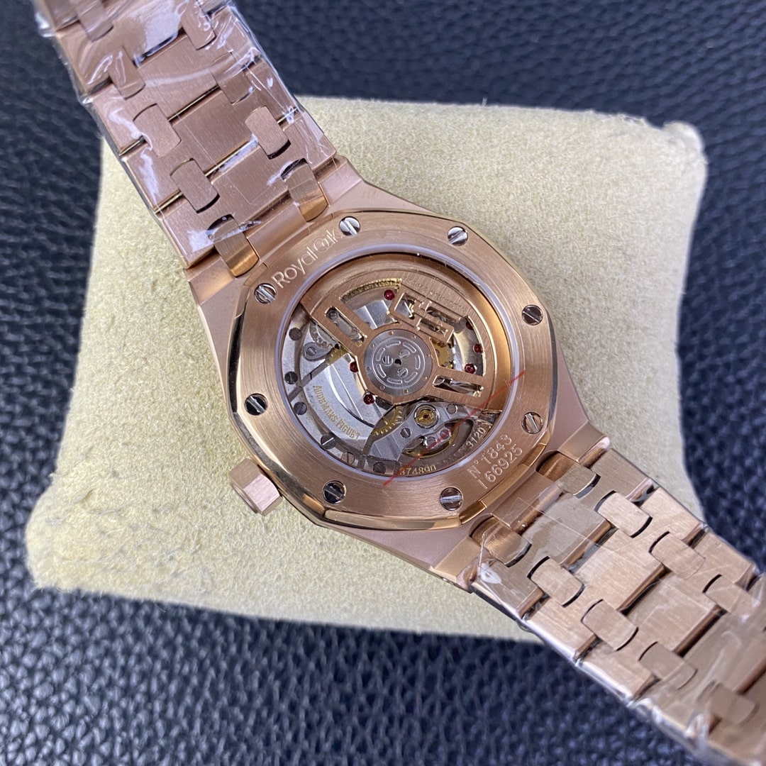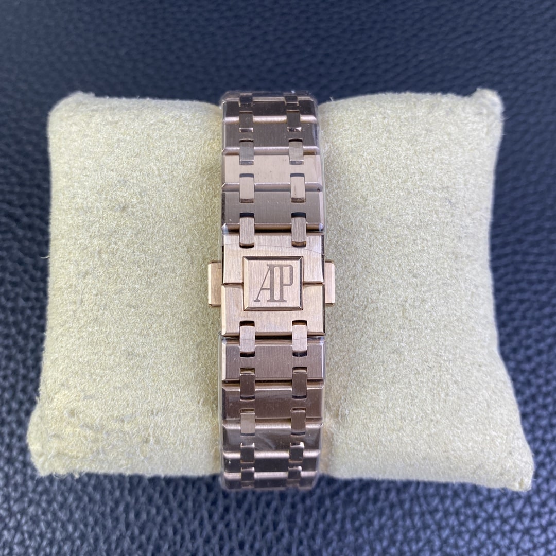 值得一提的是,Ref. 15550ST的機芯采用了精準可靠的全自動機械機芯,確保了腕表的準確走時和穩定性能。機芯的22K玫瑰金專屬擺陀上鐫刻著「50th Anniversary」的字樣,通過鏤空雕刻技術展現出50周年標誌和Audemars Piguet標誌的精細紋飾,與表殼的緞面打磨和亮面拋光相得益彰。除了以上的改進和細節設計,Ref. 15550ST還在表帶上進行了重新設計。首四個鏈節從平行四邊形變成了梯形,表帶的寬度逐漸遞減,創造出流線美感和更加舒適的佩戴體驗。鏈節的纖薄設計使整個腕表更加輕盈,不僅符合時尚潮流,也增加了佩戴的舒適度。