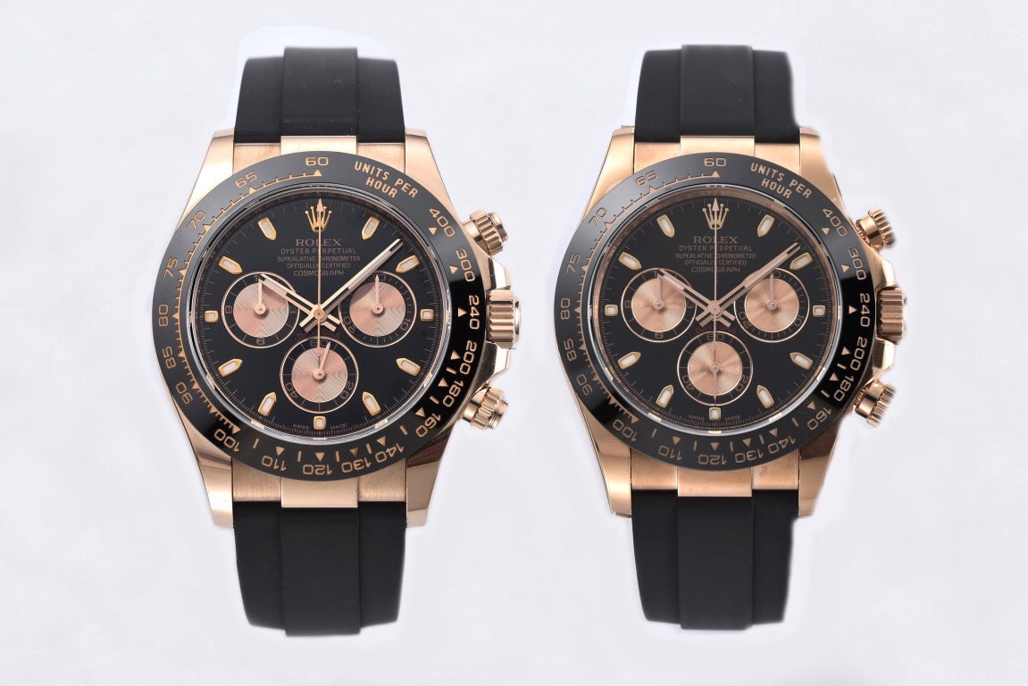 大家好,本期高仿手錶博客評測給大家帶來的是C廠地通拿對比正品,由Clean廠全新推出的勞力士m116515ln玫瑰金膠帶地通拿作為本期對比的主角.這也是C廠最近新出的款式,相較於我們錶友來說又多了一種困難選擇性.畢竟現在高仿市面上出的地通拿款式越來越多了,無論什麼廠家還是什麼版本終究都會有人去購買,而我們錶友想要追求一些完美主義,頂級品質的高仿Daytona那最好的是多去對比一些廠家的做工,特別是細節處理方面,也有利於我們學習到更多的復刻錶知識.那我們就來看看這一隻玫瑰金膠帶地通拿在對比正品是否達到一定的仿真度.