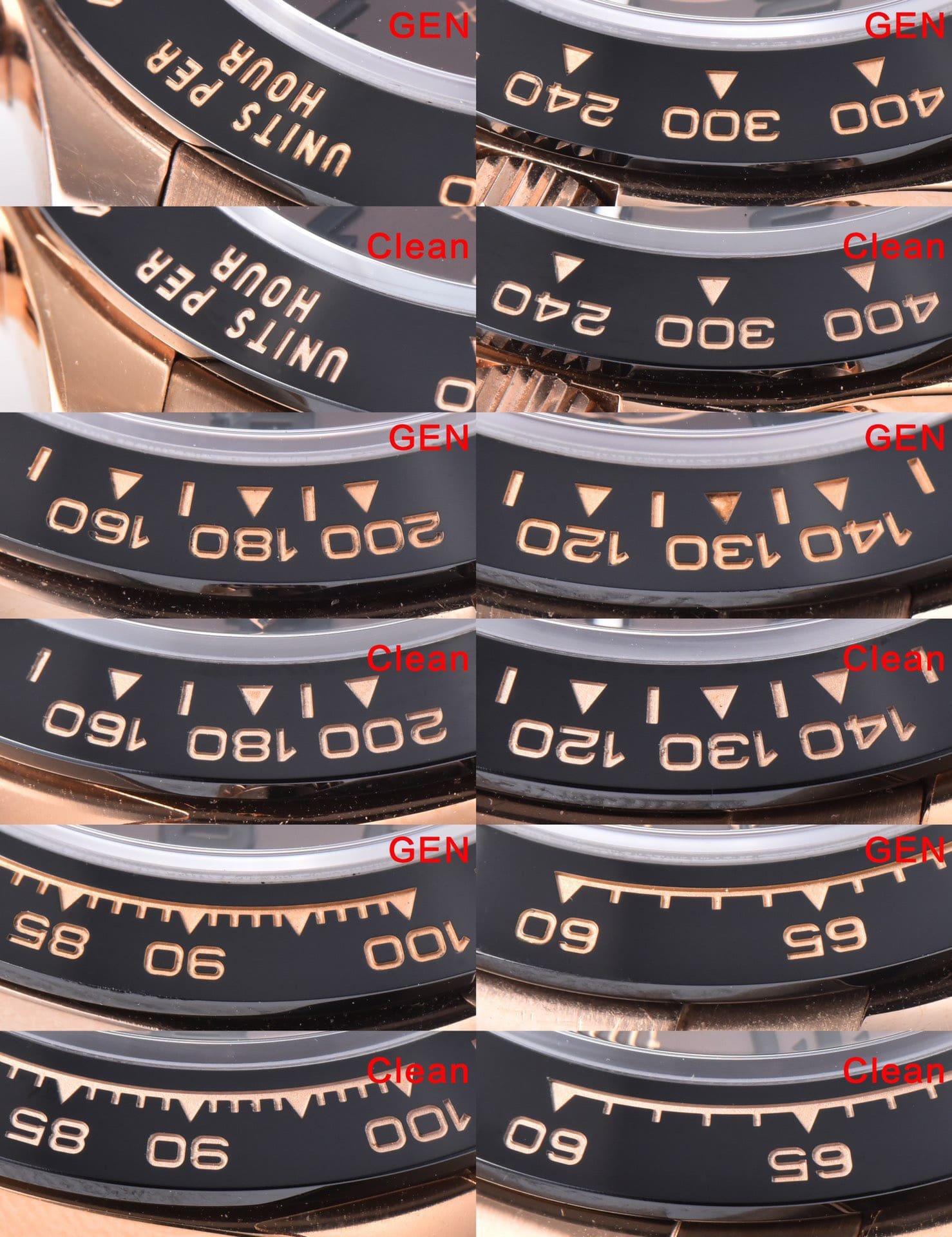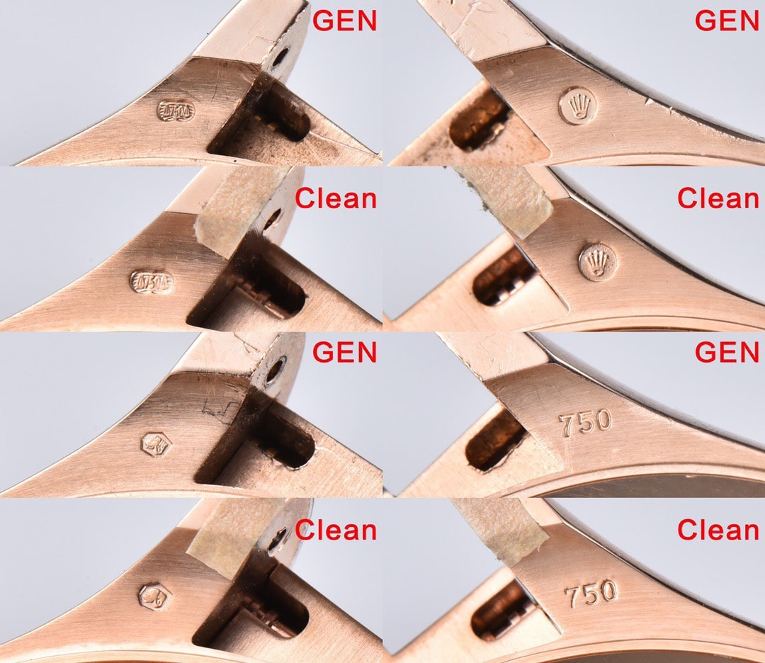 圖片左邊為原裝正品,右邊則是Clean廠地通拿膠帶款式.正品是一共有兩個同款版本選擇,是關於材質方面,18K金玫瑰金與18CT永恆玫瑰金材質,兩者都是一樣,只不過18K玫瑰金材質會比較足18K金,而永恆玫瑰金參金量就比較少.而對於高仿勞力士就沒有那麼多的講究,都是統一使用904L精鋼材質,在進行PVD電鍍工藝打造與正品一致的玫瑰金色值,目前PVD電鍍是能夠還原百分之95左右,基本上也算是無色差的狀態.其中C廠在電鍍過程中是把錶殼-錶扣-把頭部分分為散件進行電鍍,並非是一整個錶直接電鍍.散件電鍍是為了能夠更好的全方位電鍍,做到不漏剛的跡象.