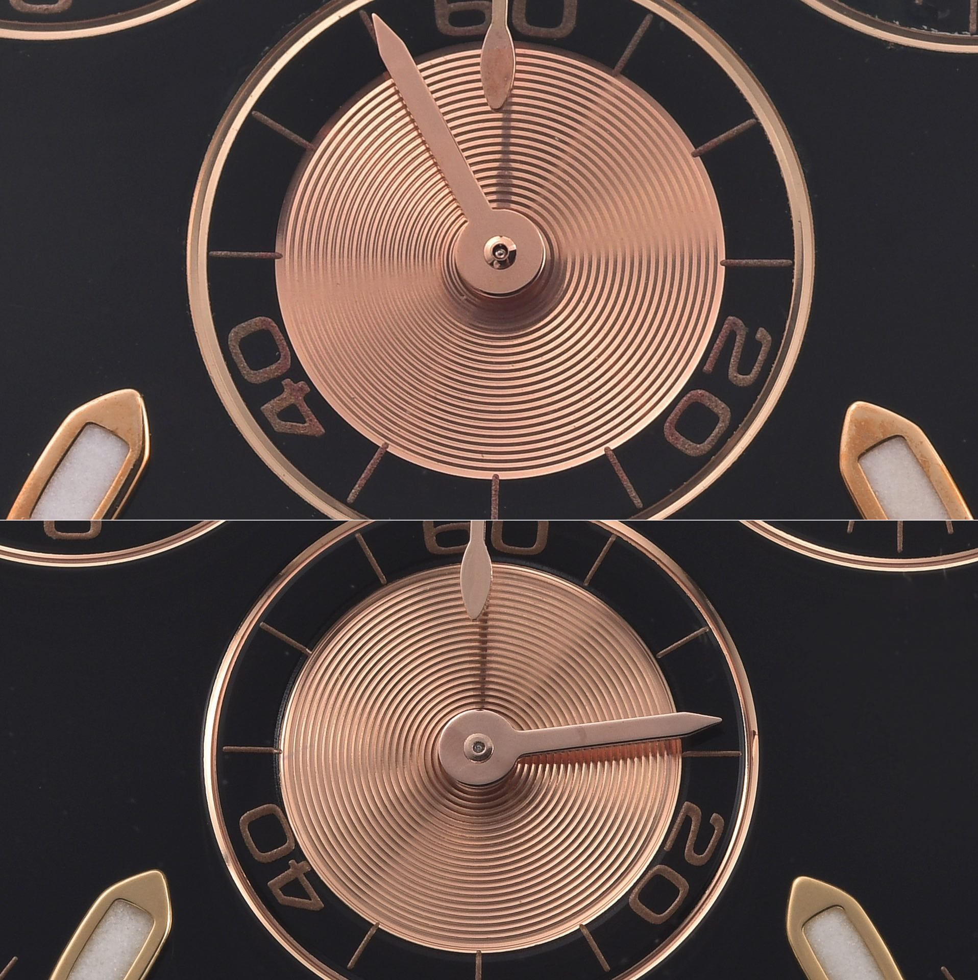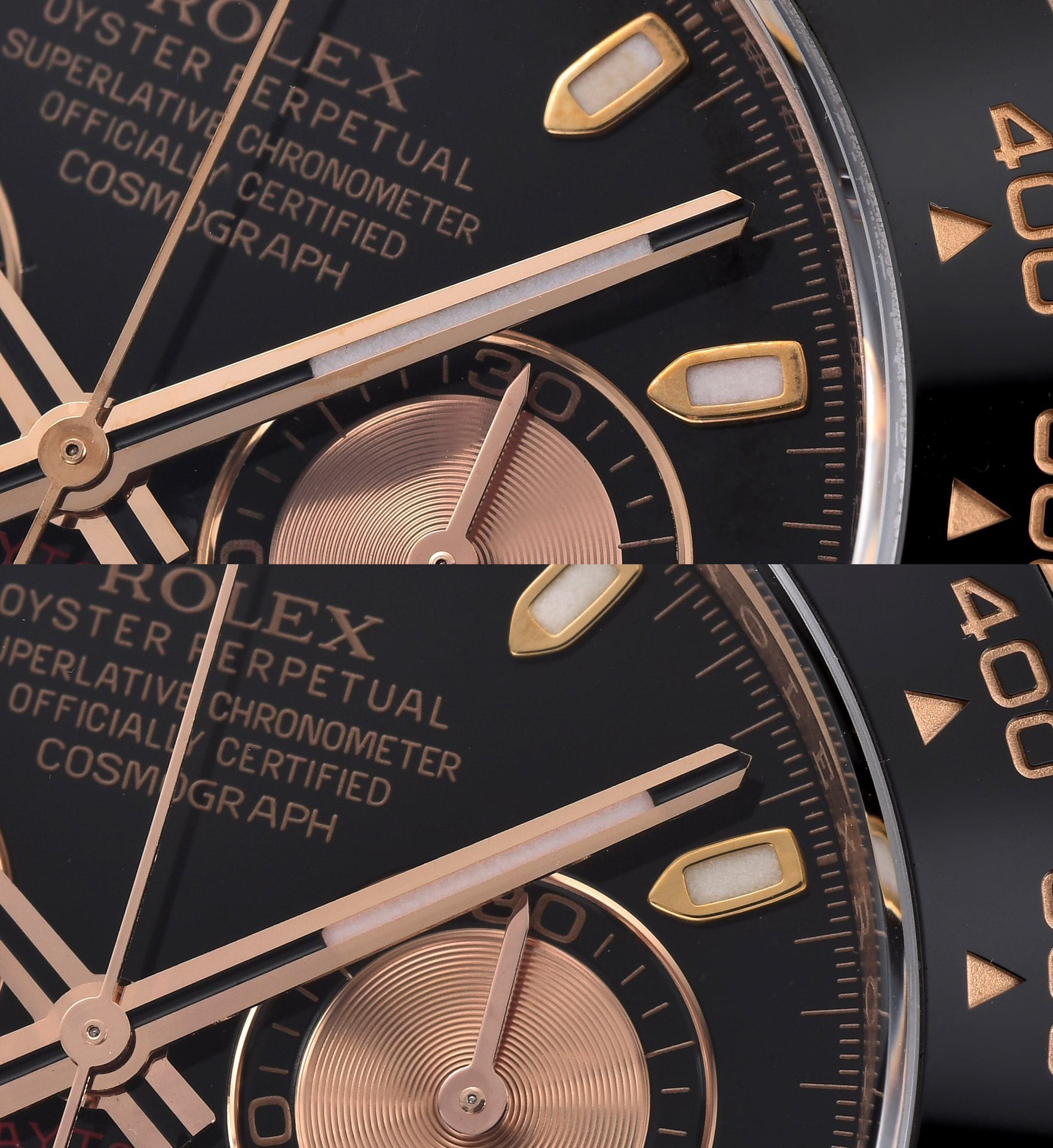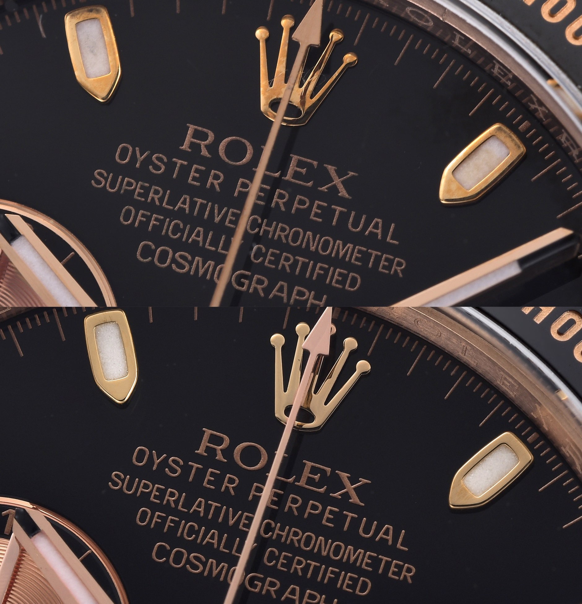 然後印刷的字面,就沒有多大的問題,整體的還原度和字面大小規範程度都是一致的.而此次Clean廠做到最對版的部分就是指針跟三個計時小圈.指針部分的上的玫瑰金色對比正品完全是可以達到百分之98左右的.和原版一樣三色一體的指針,包括中軸部分的鏤空設計,都沒有多大問題.而計時小圈部分的紋路,光盤紋理的設計,外圈的金屬包邊工藝.都是做的相當接近,這一點確實是C廠拿手絕活了.整錶的夜光部分是刻度條丁與指針部分發出,看上去的質感帶有顆粒狀,這才是對版的夜光處理.材質方面用的是瑞士進口同款熒光劑填充.