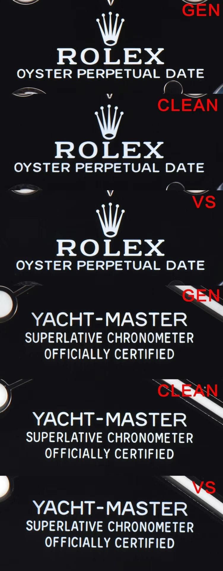 喺表扣部分,Clean厂嘅外觀弧度更加符合原裝,展現出更好嘅整體美感。而VS工廠嘅表扣外觀弧度則稍嫌不足,無法完全還原原裝嘅設計。我哋亦對比咗表殼底面嘅貴金屬刻字同日曆字體。Clean厂嘅表殼底面貴金屬刻字清晰立體,同原裝十分相似。而VS工廠嘅表殼底面貴金屬刻字則稍嫌粗糙,無法達到Clean厂嘅水平。另外,Clean厂嘅日曆字體更具立體感,令人感受到油墨嘅層次效果。而VS工廠嘅日曆字體略嫌不足,無法完全還原原裝嘅立體感。