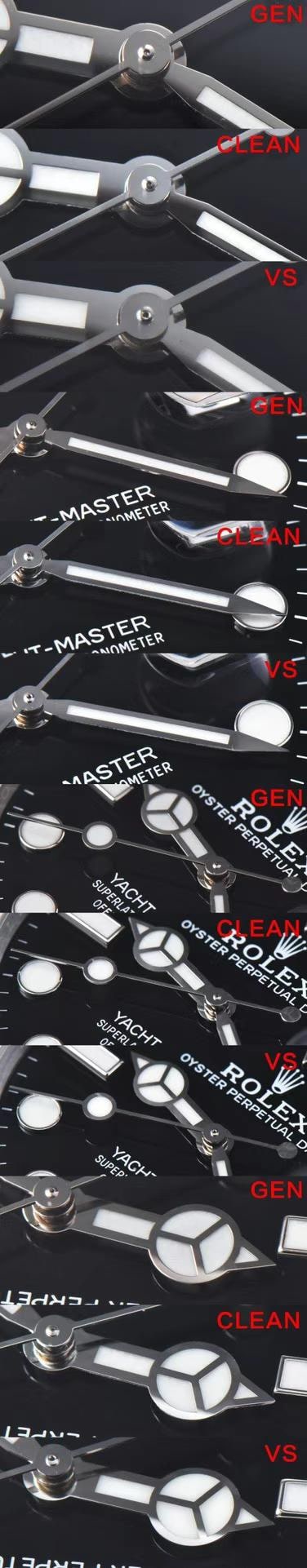 指針亦係對比中嘅一個關鍵點。Clean厂嘅指針呈現出更立體嘅效果,增加咗整體錶盤嘅層次感。而VS工廠嘅指針喺立體感方面不足,令錶盤整體顯得平平無奇。呢個進一步彰顯咗Clean厂喺細節處理上嘅優勢。另外,我哋亦注意到VS工廠嘅秒針軸存在嚴重嘅錯誤,呢個會影響整個手錶嘅運作。相比之下,Clean厂嘅秒針軸設計正確,確保咗手錶嘅準確運行。除此之外,Clean厂對玻璃嘅高度同圓角處理亦更加精細,呈現出更高嘅工藝水平。