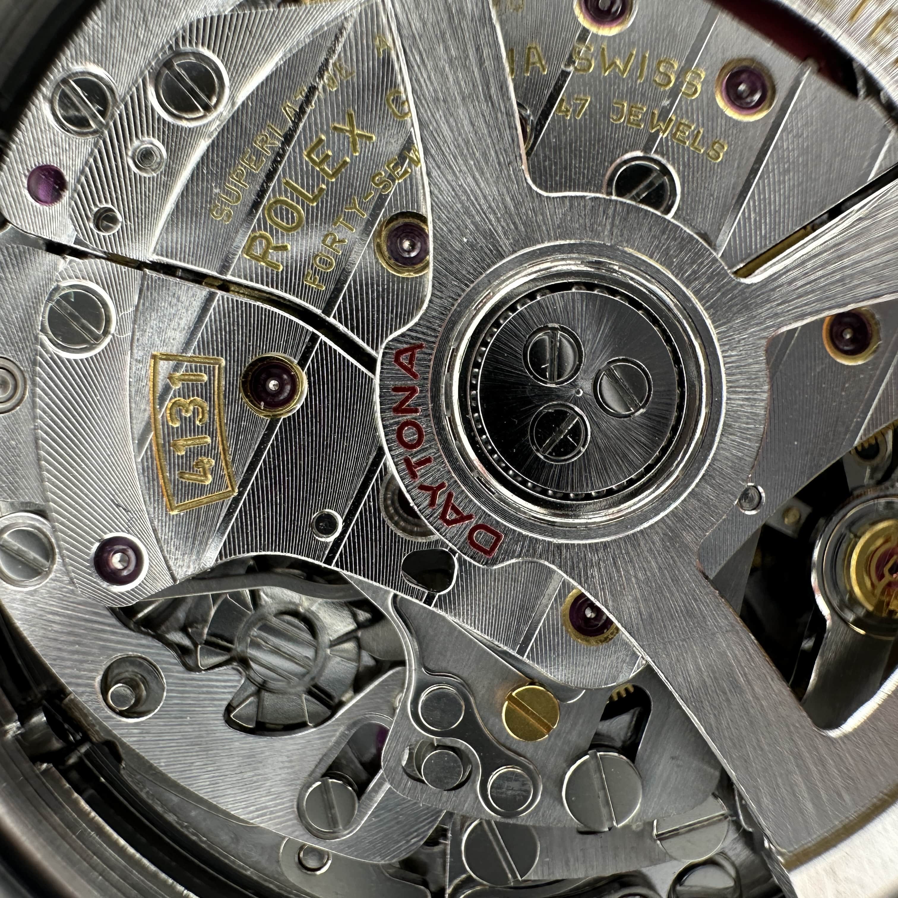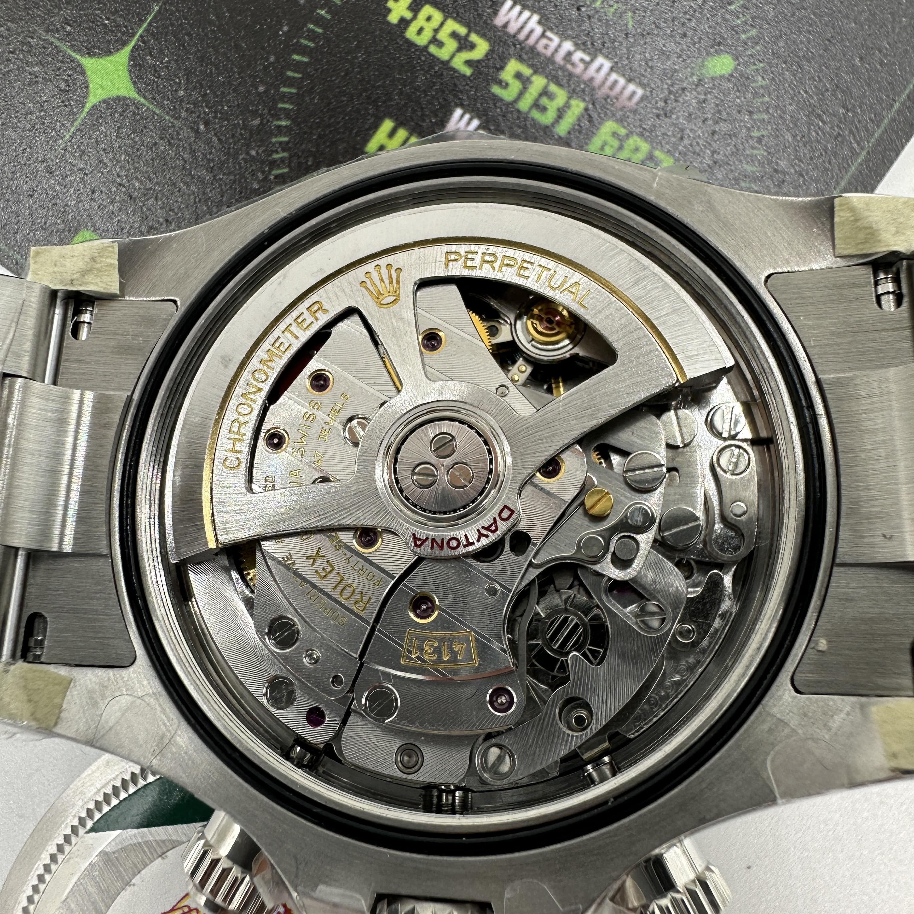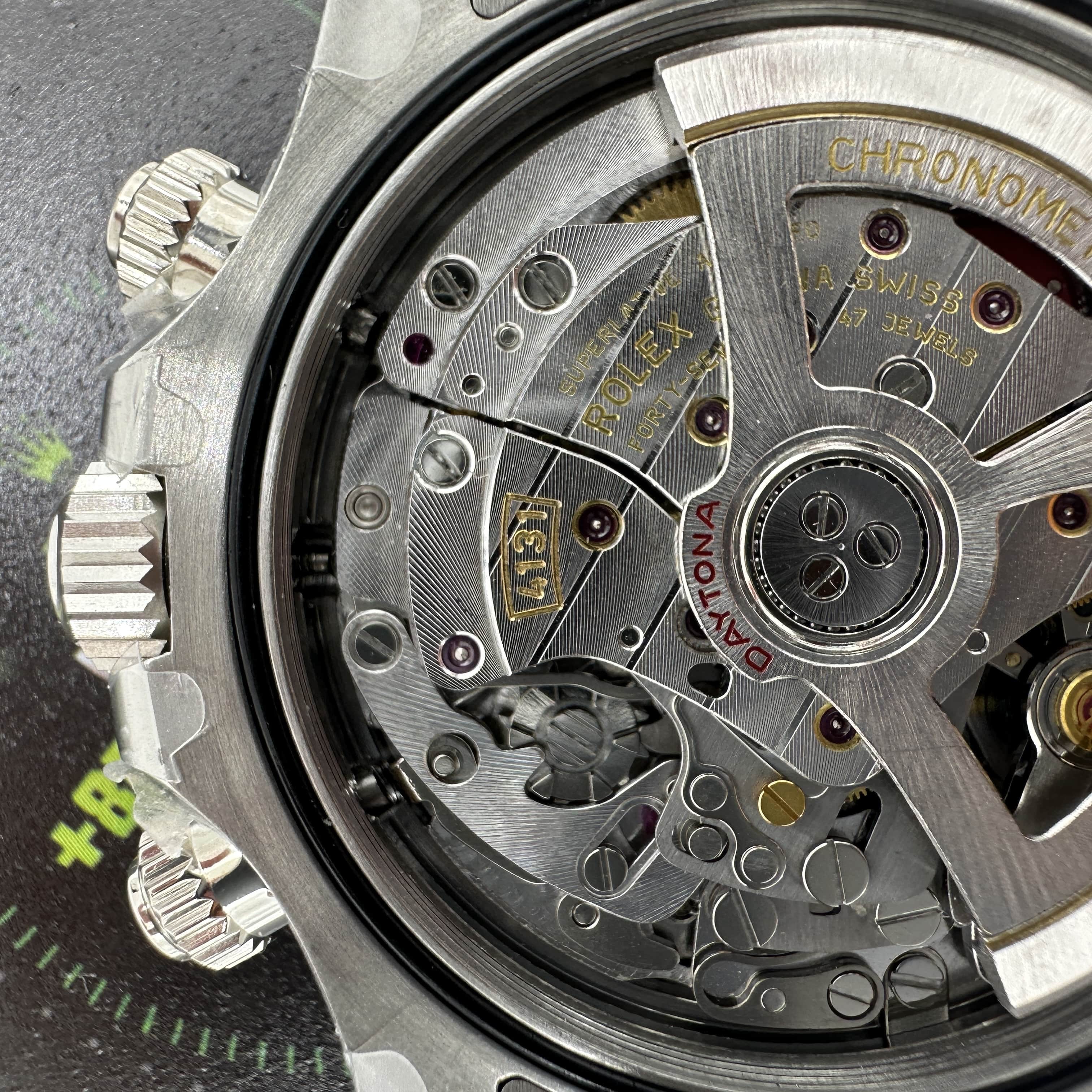 而上海4131機芯對比正品是否達到一定的仿真度?從整體的外觀結構擺輪位置,鏤空陀片,加上刻度的字面都是對版正品4131機芯的品質.包括大家非常注意的日內瓦打磨紋路都是標準還原.但我們需要了解的是關於擺輪內置的遊絲,上海4131機芯是使用到藍游絲,關於游絲的問題是取決於動力續航問題,無論外觀機芯做的再對版,使用的游絲不對版或是較為劣質的游絲都會影響到後續的蓄能時長.