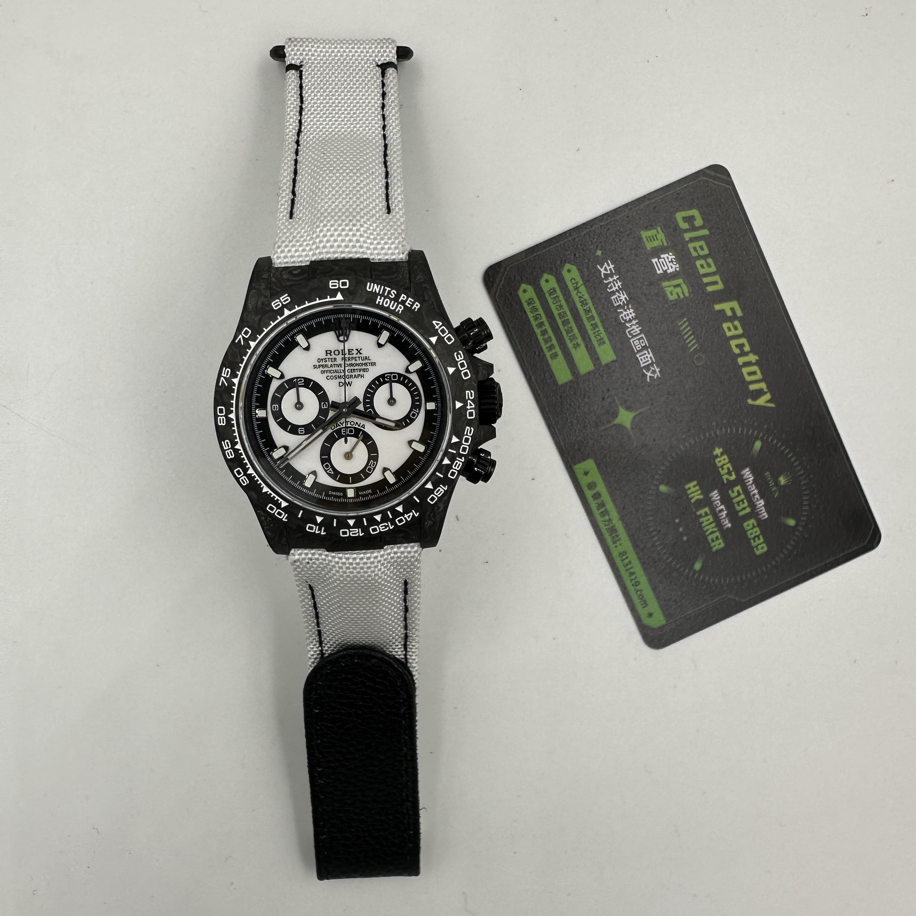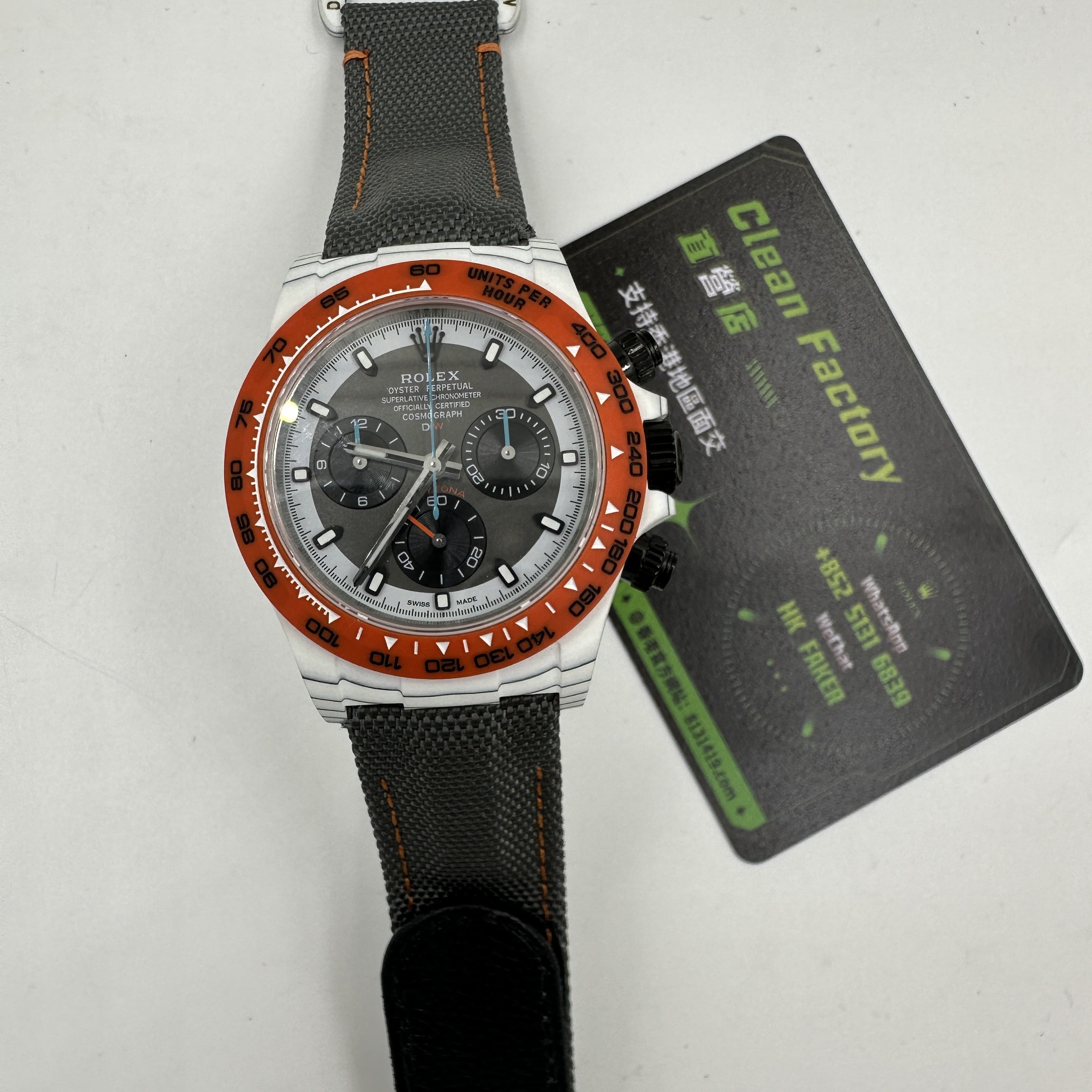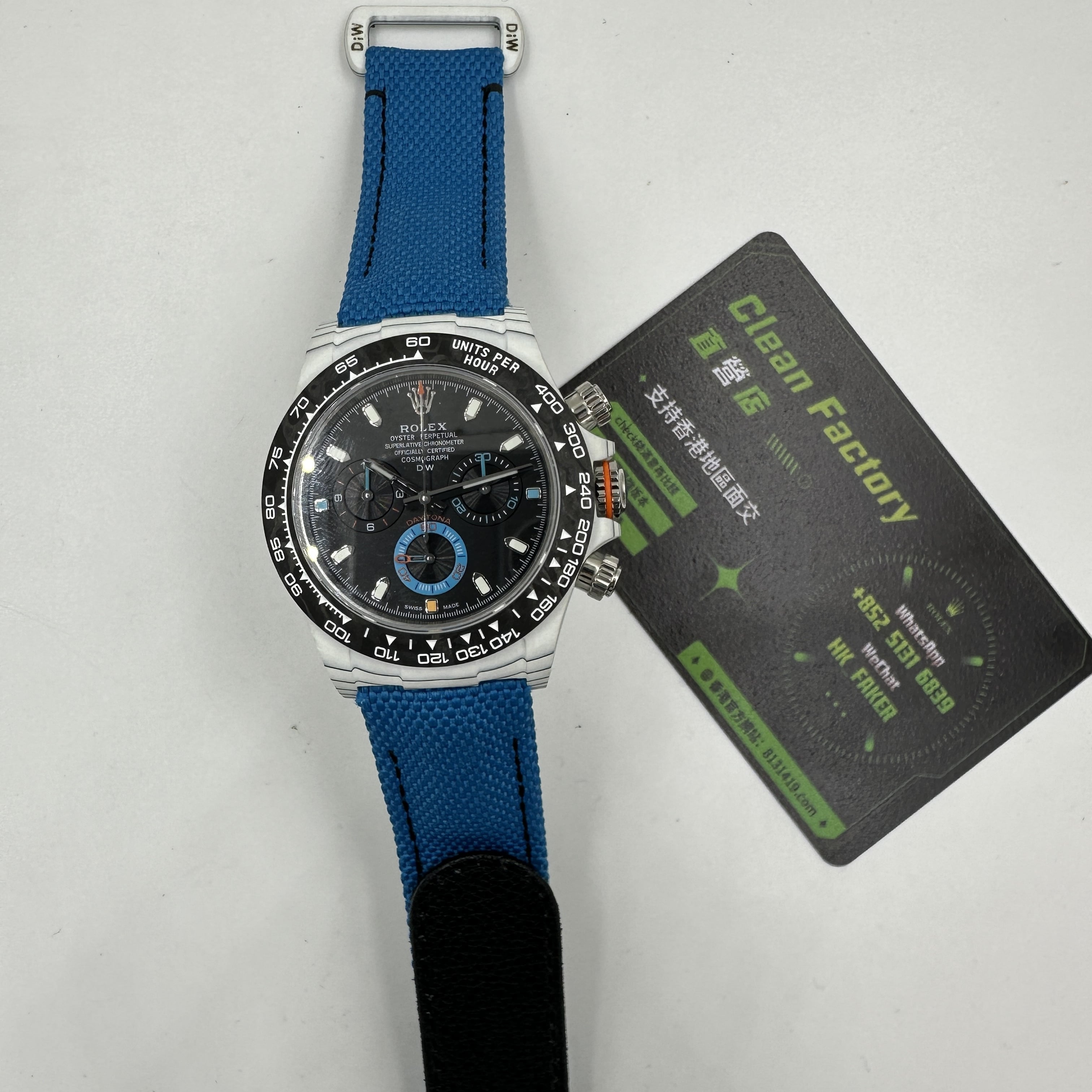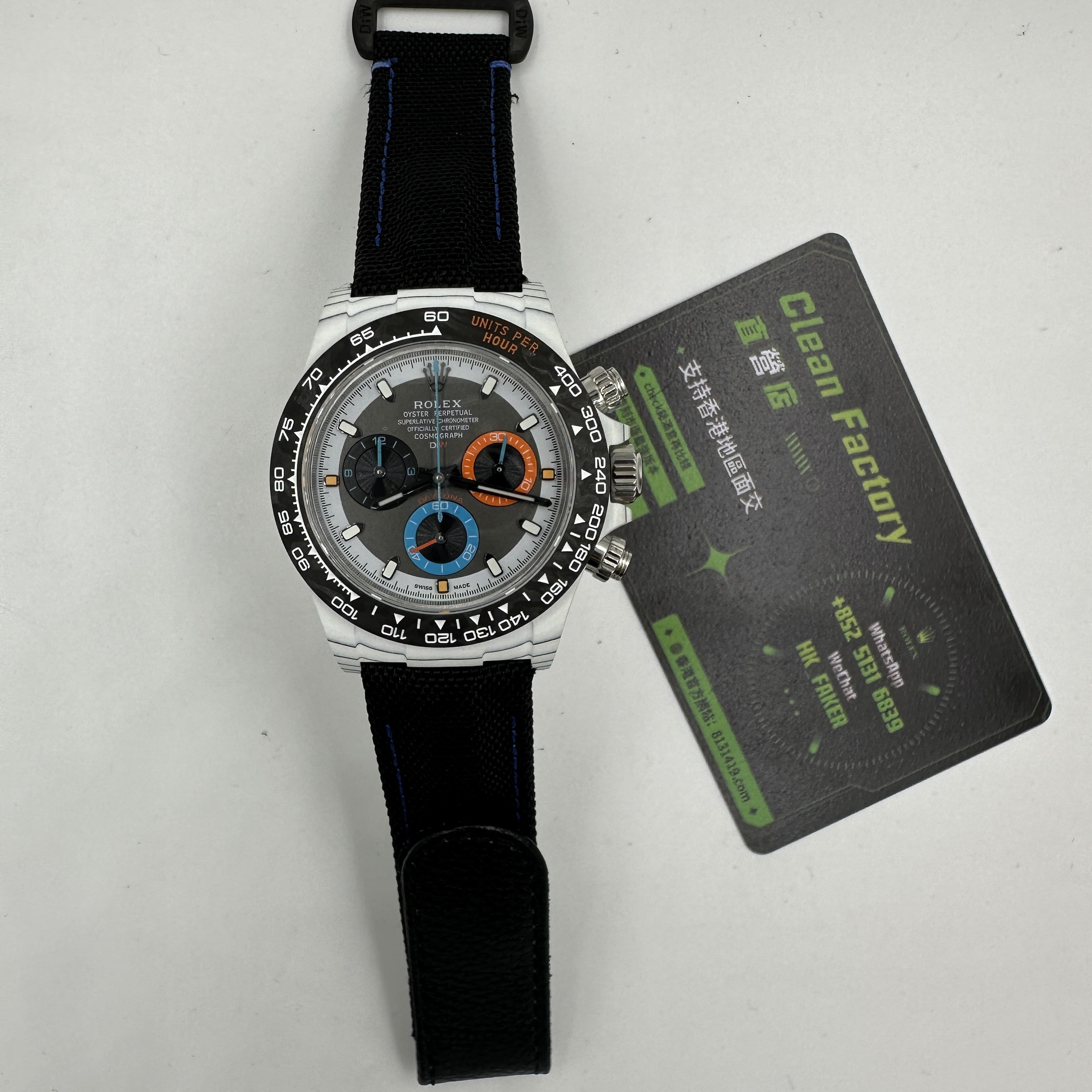 前面我們也與大家分享過關於Diw廠Daytona錶款的測評.在材質上同步DIW原裝正品一致使用到碳纖維打造錶殼,圈口,底蓋.整體的重量是可以做到53克到55克左右,上手的手感非常輕便,加上魔術特針織錶帶,佩戴時也能夠輕鬆快捷的取戴.而此次最重要的訊息是Diw廠勞力士地通拿全面降價的消息,這個降價會導致錶友們友兩種心態變化.此前Diw廠Daytona售價差不多是6000到6500港幣左右.