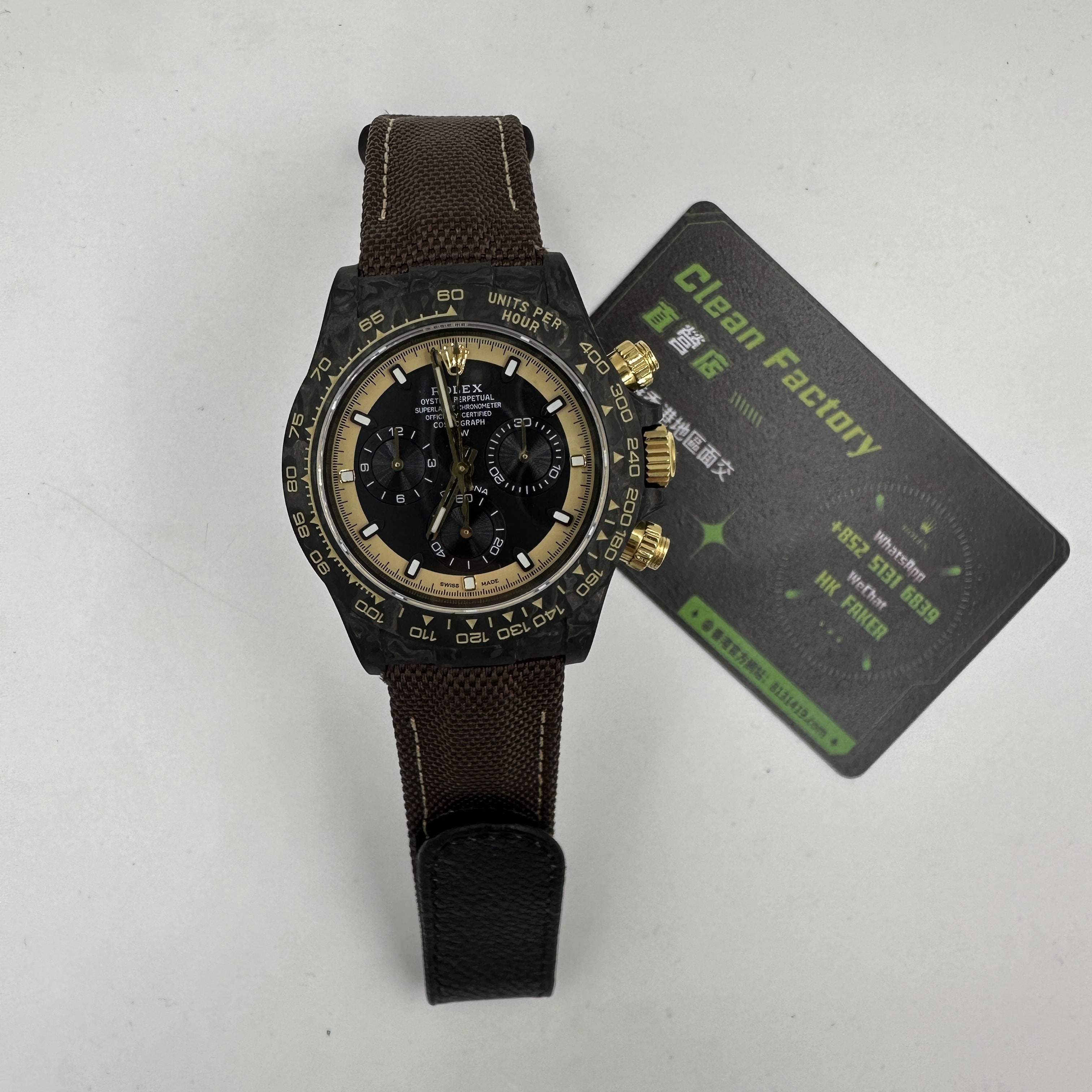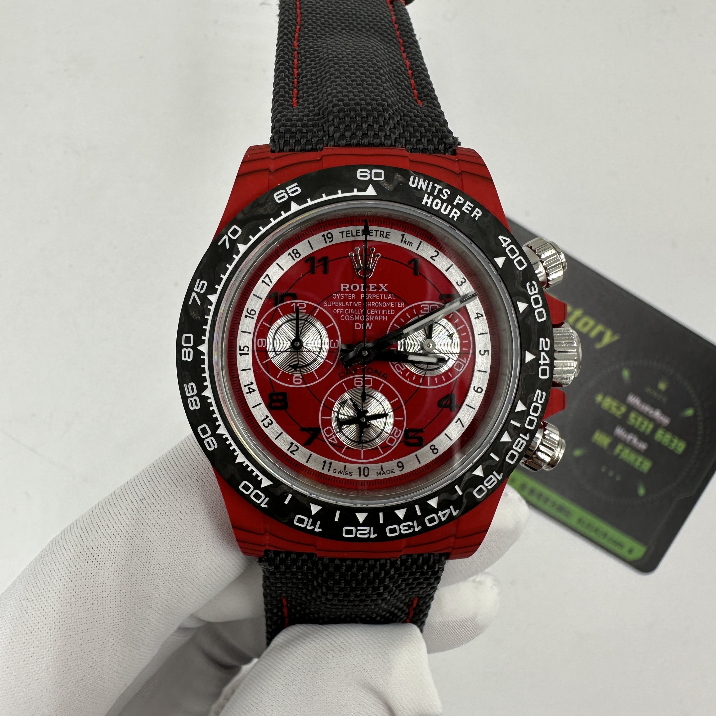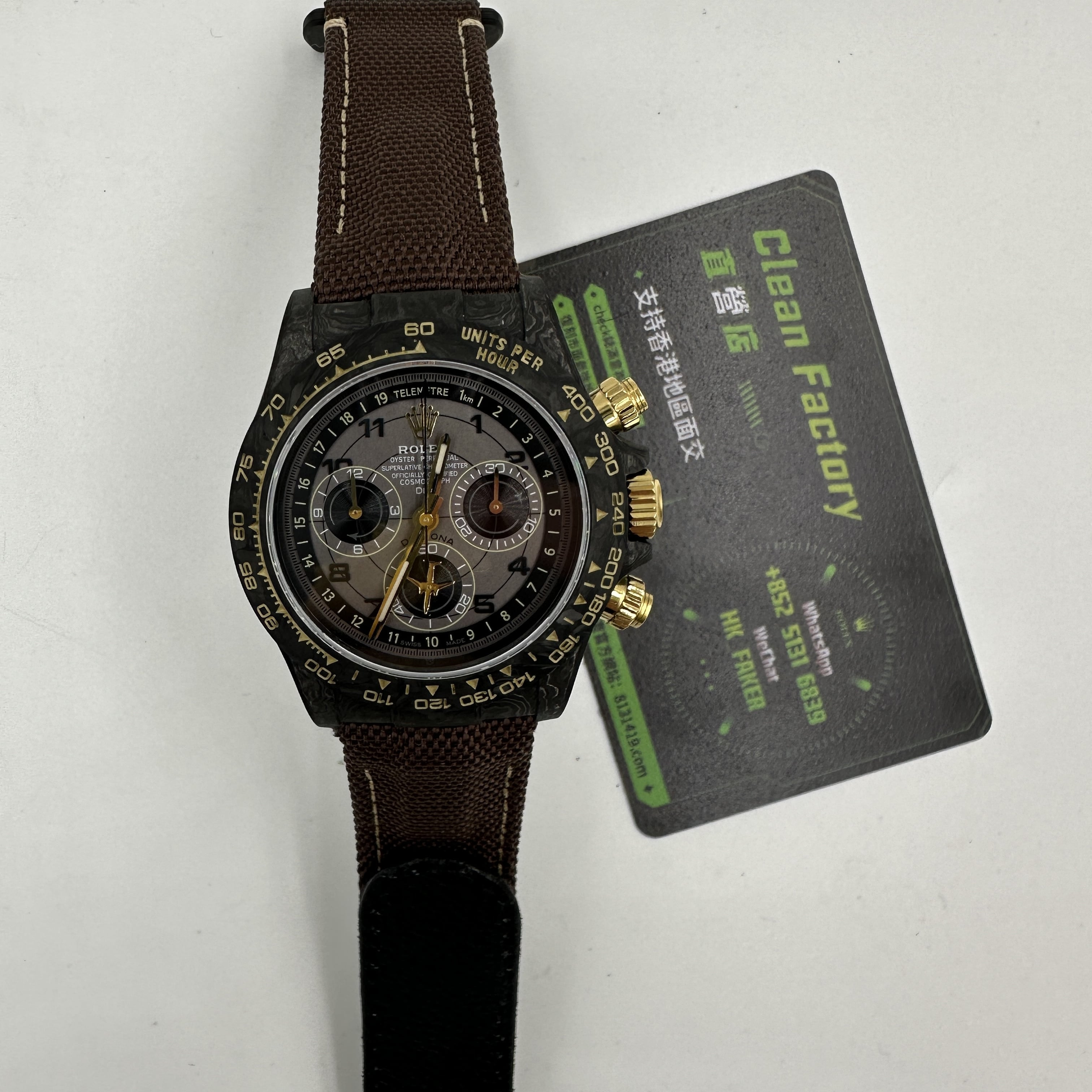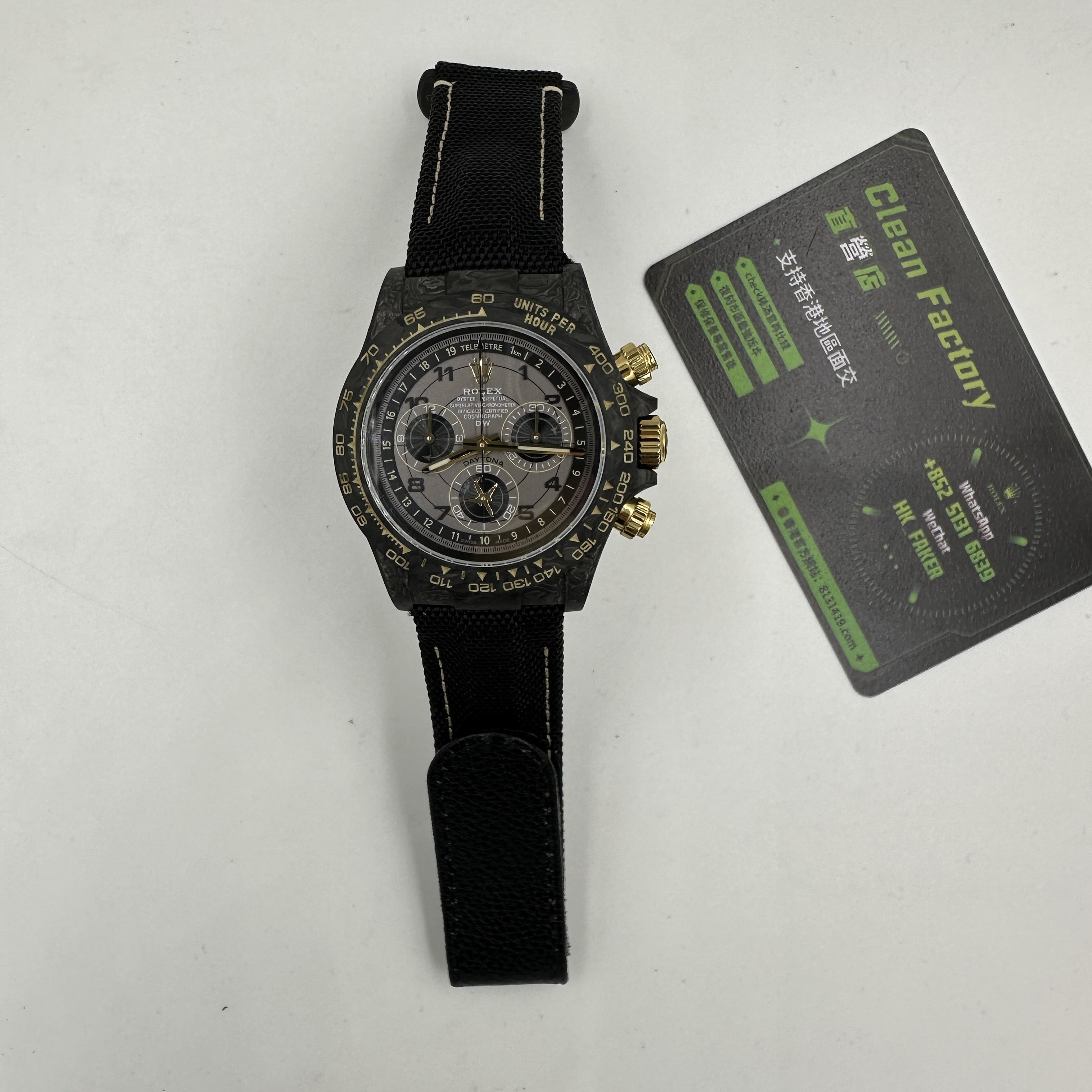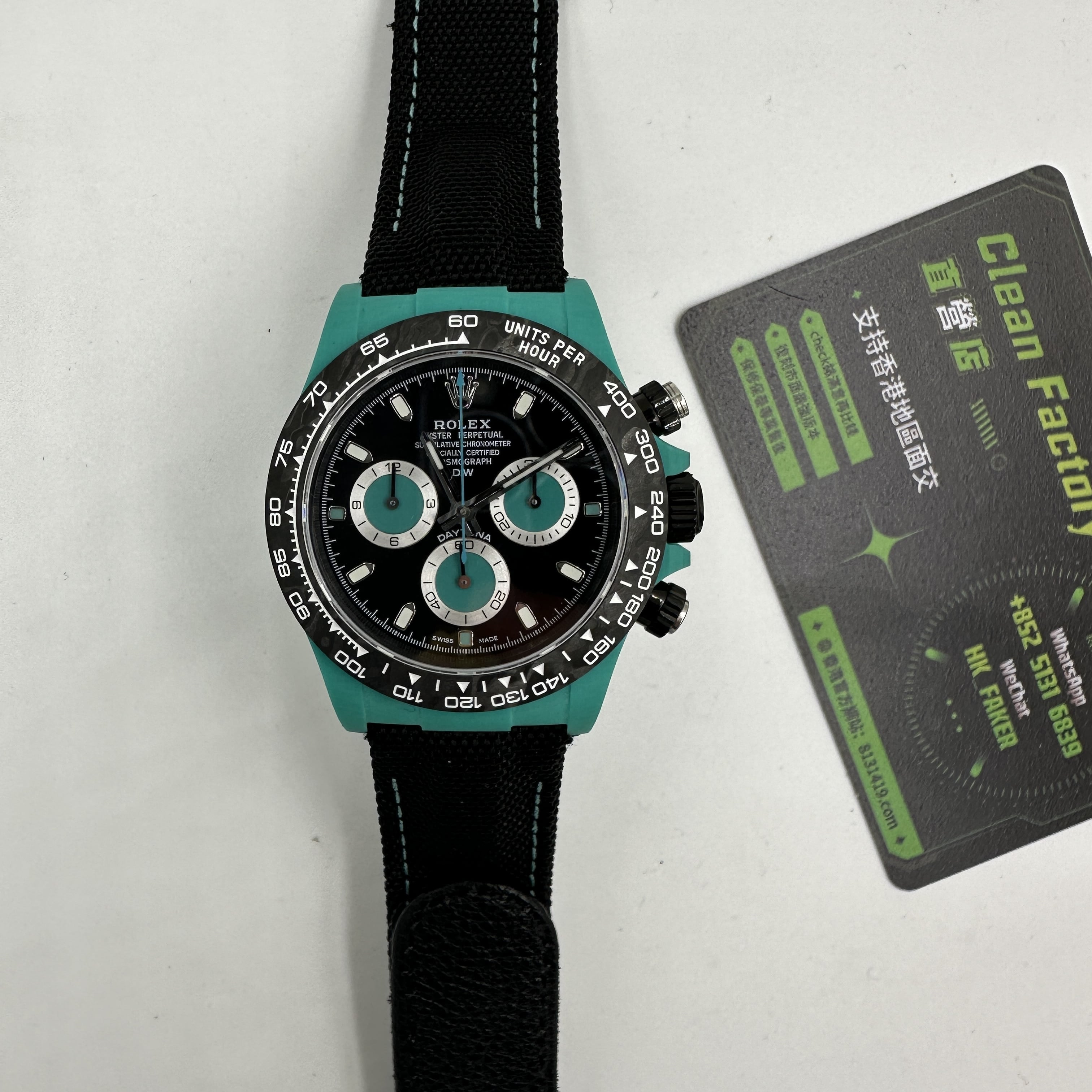 前面我們也與大家分享過關於Diw廠Daytona錶款的測評.在材質上同步DIW原裝正品一致使用到碳纖維打造錶殼,圈口,底蓋.整體的重量是可以做到53克到55克左右,上手的手感非常輕便,加上魔術特針織錶帶,佩戴時也能夠輕鬆快捷的取戴.而此次最重要的訊息是Diw廠勞力士地通拿全面降價的消息,這個降價會導致錶友們友兩種心態變化.此前Diw廠Daytona售價差不多是6000到6500港幣左右.