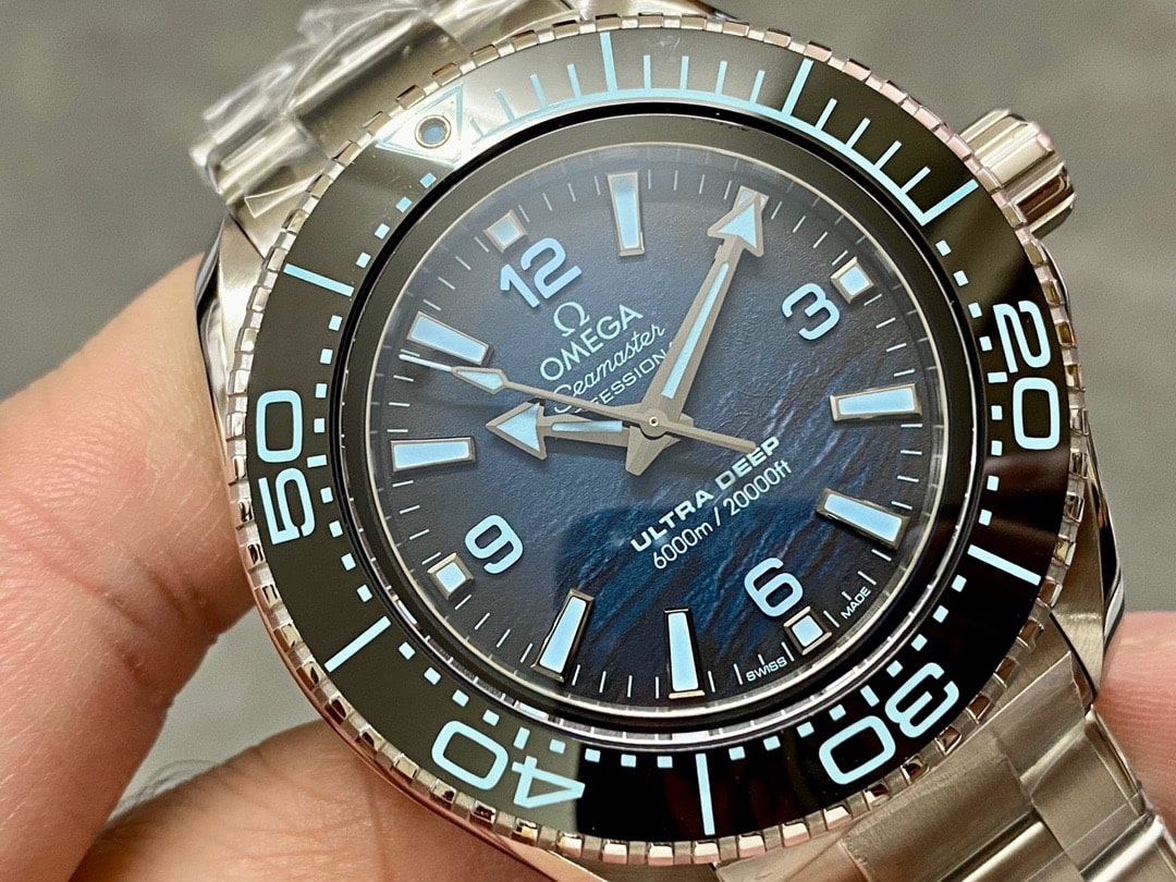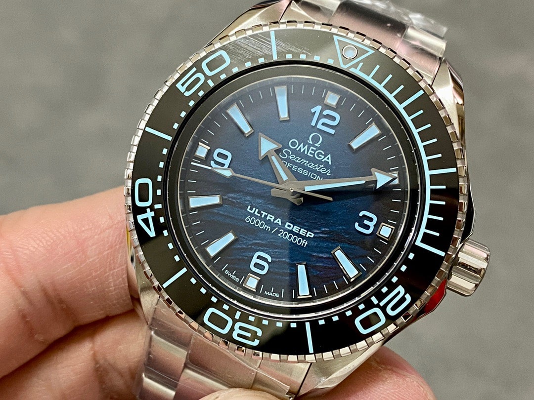 通過轉動圈口克用於辨識潛水的時間.標配了藍水晶高透玻璃鏡片,具有耐磨耐剮蹭的作用.其次這一隻VS廠歐米茄海馬比較引人矚目的是錶盤附有3D視覺感.是一種深海系列所獨有的盤面設計.海浪之間所產生的弧度和配色都是經過獨家特定而成.相較於正品之間的比對幾乎的做到無差別的還原.