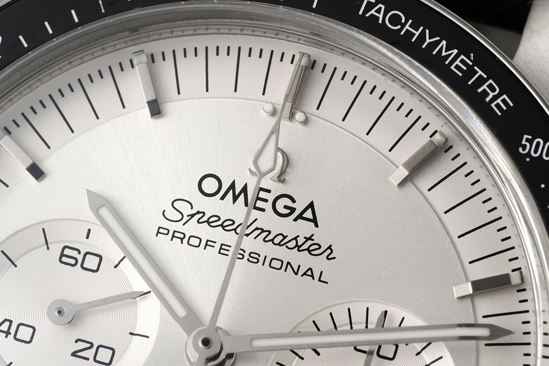時間顯示刻度條丁加上底盤部分的時分顯示,金屬材質圓角打磨立體感十足.12點鐘則是以立體LOGO刻度加上Omega印刷字面包括這一隻超霸系列的標語.從字面的細節處理中體現了Omega高仿的頂級工藝,RM廠依舊是穩定輸出,毫無瑕疵缺陷.指針部分分別也是以Moonshine18K金CNC電鍍工藝還原.