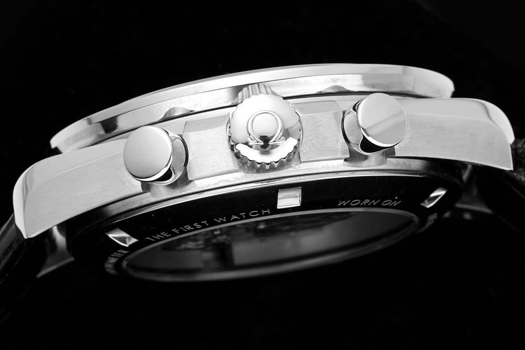 錶殼的打造類似拱形狀的弧度,厚實飽滿,分別在右邊部分配備了三個調教把頭.時間調教和計時功能應用.中間把頭刻度了Omega的標籤LOGO,清晰角度還原.圈口部分是陶瓷材質,測試的刻度字面由Omega-Ceragold技術製成,每一個阿拉伯數字所對應的位置都是同步原版一致,無誤差,位置對標對準的狀態.
