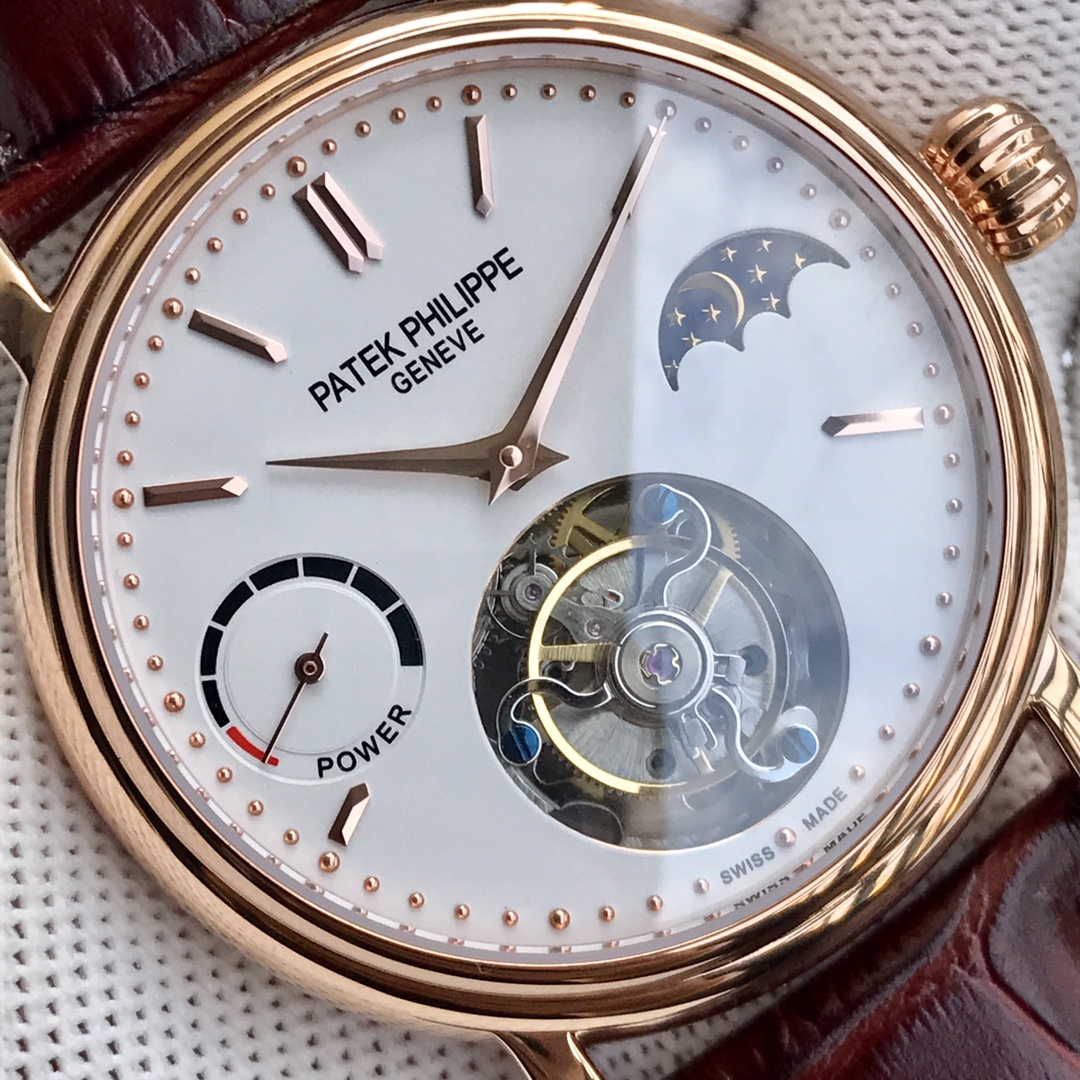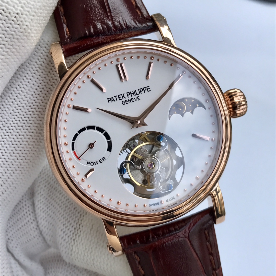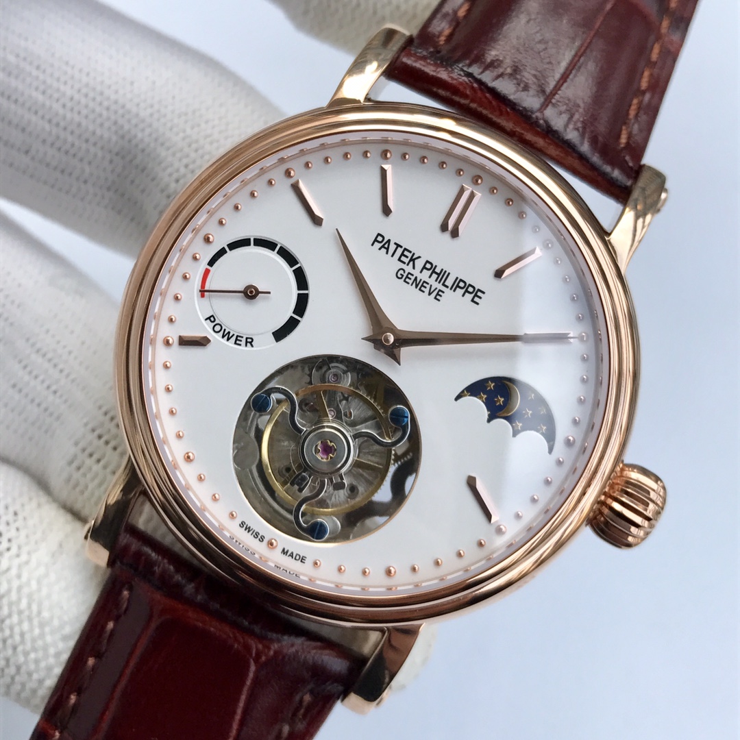 經典再現,百達翡麗(動能顯示)[拳頭](月相星辰)頂級手動同軸陀飛輪機芯原裝折疊扣Lin手動上鏈機械! 雕花透底,316鋼殼,直徑42mm. 厚度13mm,42小時儲蓄動力雙面藍寶石玻璃義大利真皮(原裝蝴蝶扣)