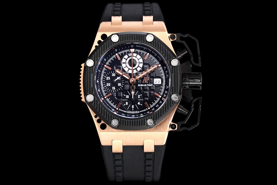 皇家橡樹離岸型Survivor限量版,全球限量1000只,上市就被秒殺搶購一空。 戴上它,就是正品! 自動上鏈計時機芯,316精鋼鑫錶殼,藍寶石水晶玻璃鏡面,錐形按鈕、中空的按鈕保護栓、錶冠及連結錶帶的煉節皆以精鋼製作。 44mm錶徑,鏤空的錶圈,黑色霧面錶盤具有愛彼獨家“Méga Tapisserie”超大型格紋裝潢。 江湖人稱“戰爭倖存者”或“大閘蟹”錶殼整體全部CNC處理,完美還原原裝結構,錶帶為氟橡膠材質,柔軟度與原裝吻合,彰顯男人霸氣,戰爭倖存者帶你披荊斬鐵! 所向披靡!