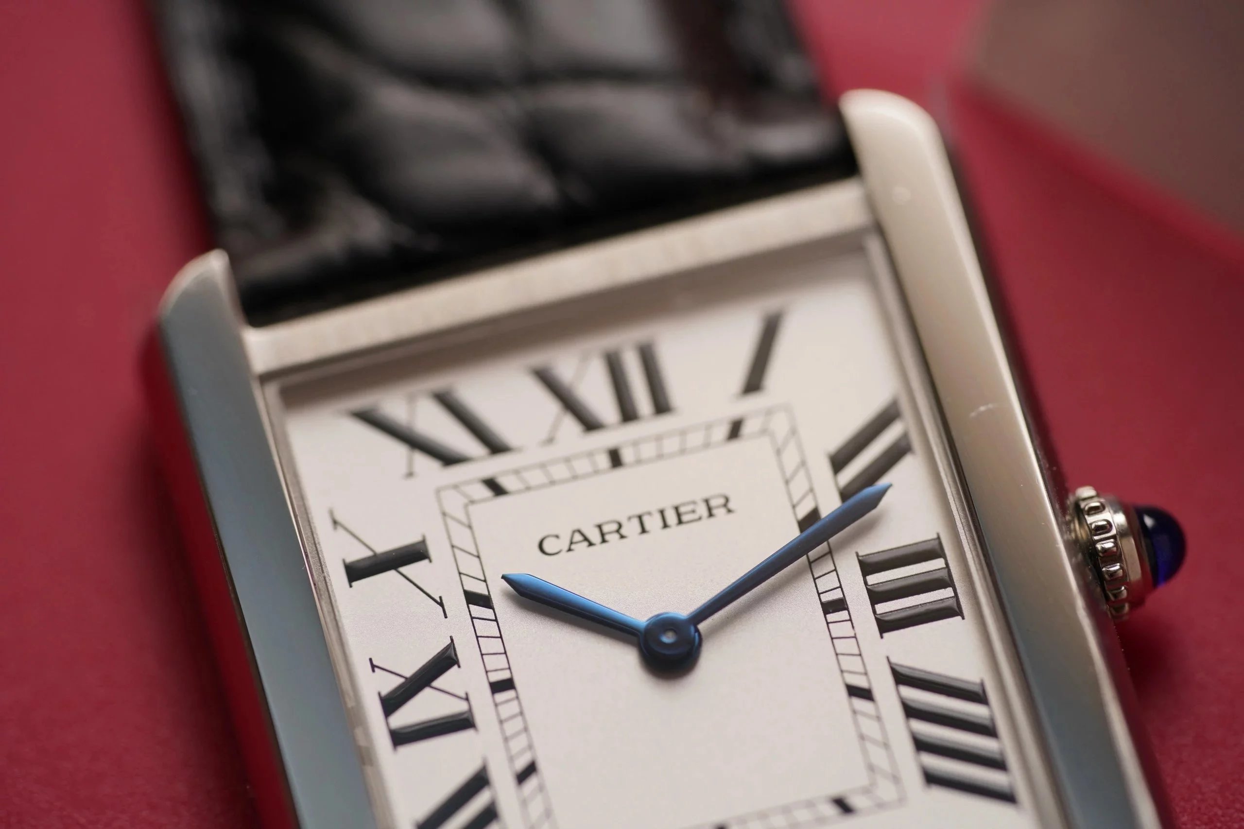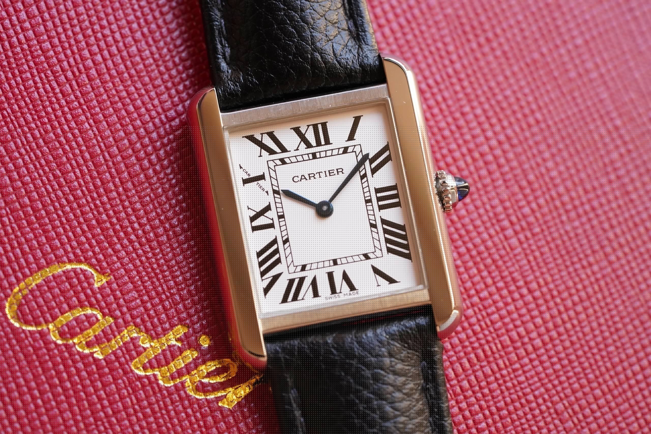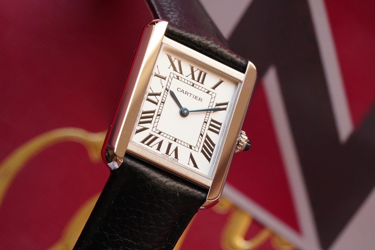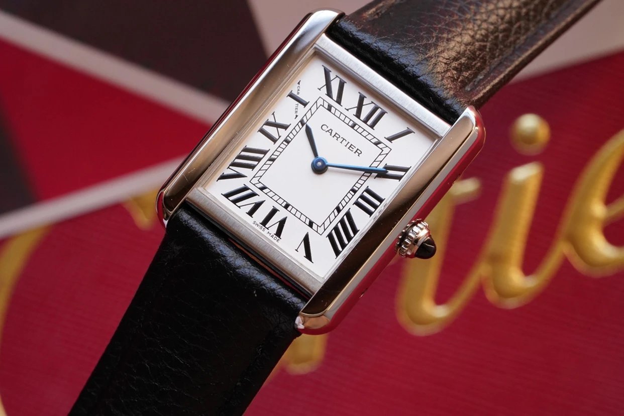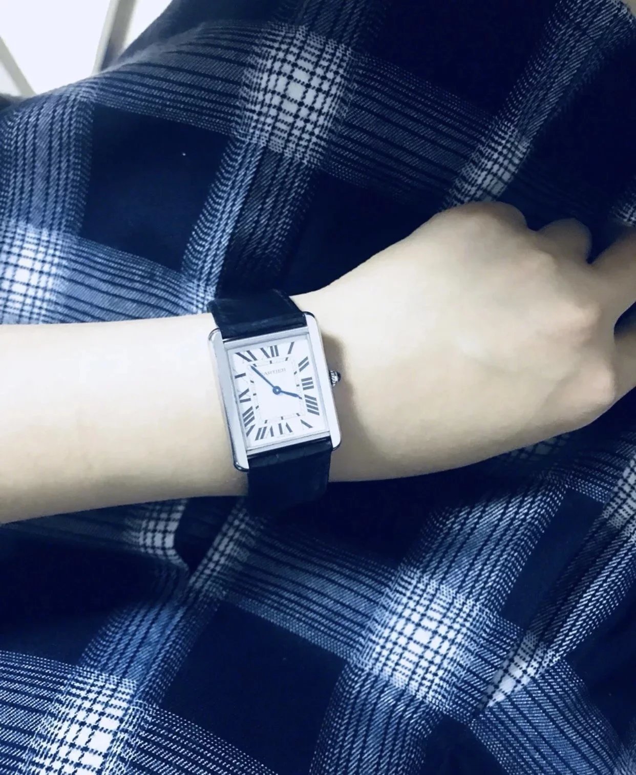 採用了經典的羅馬數字黑色時標、軌道式刻度標識的設計,這些元素可以追溯到1917年面世的第一代坦克,藍剛劍形指針,同樣12點處經典的卡地亞logo也將其名表的出身表露無遺。中號上手圖