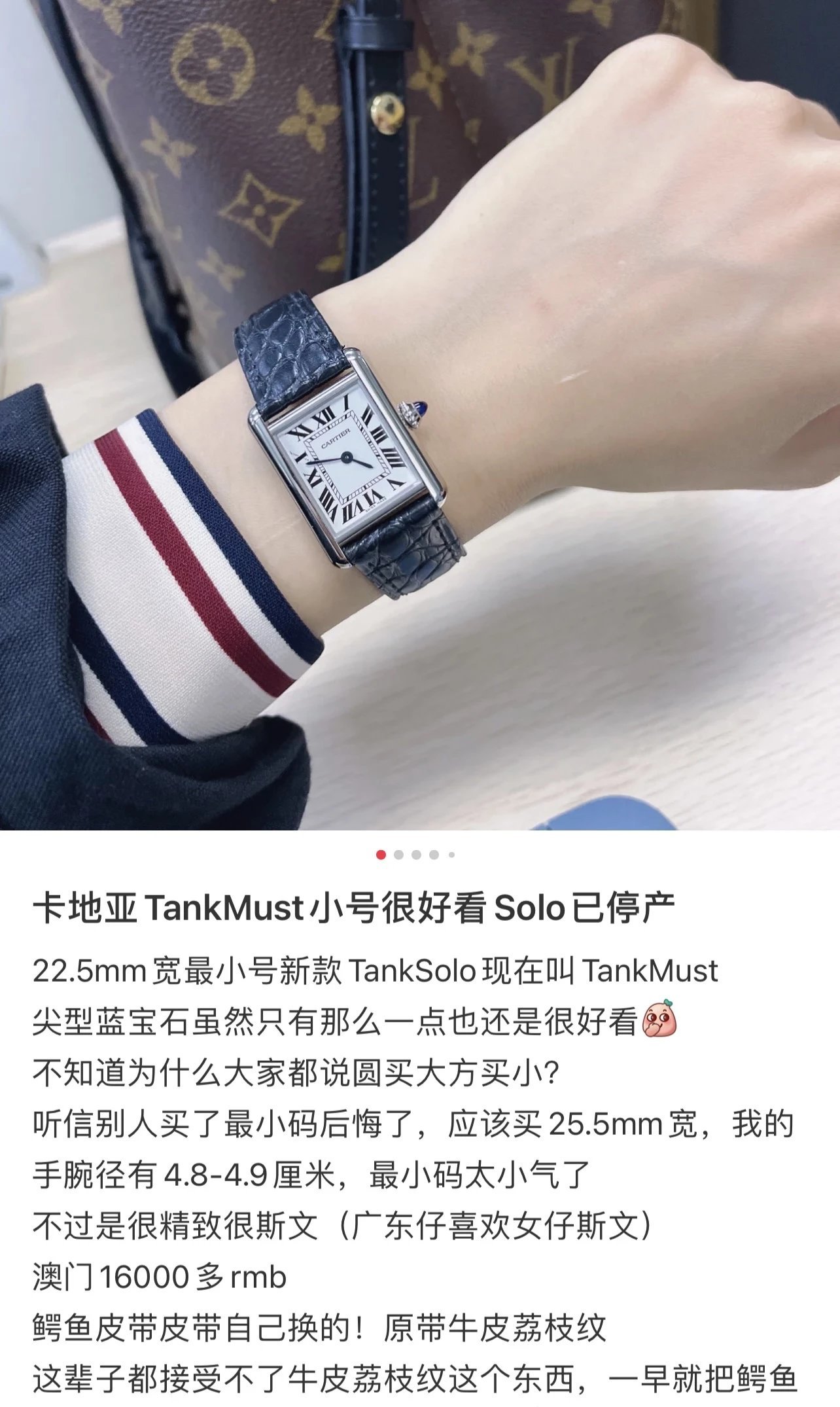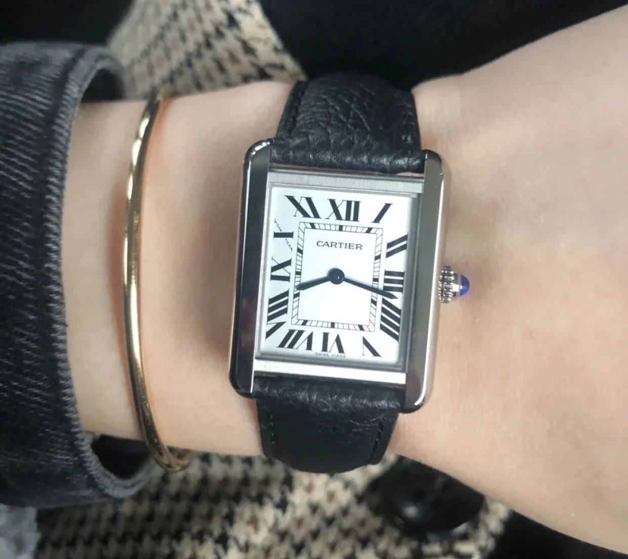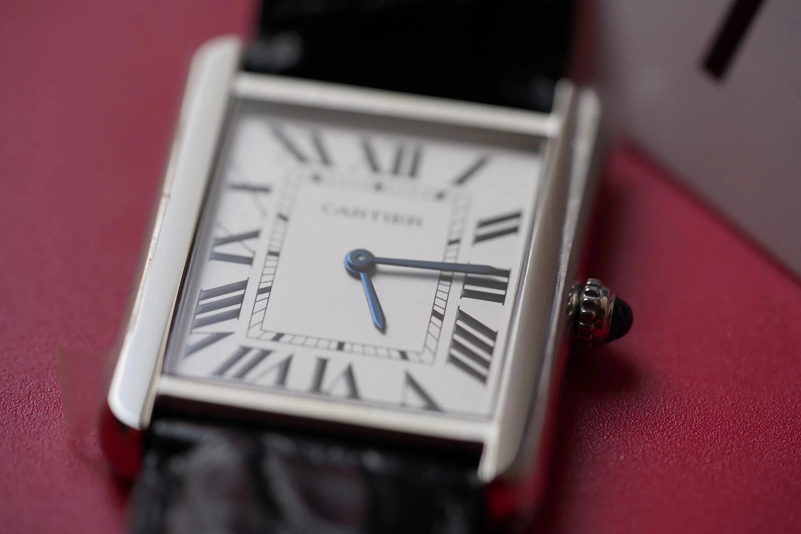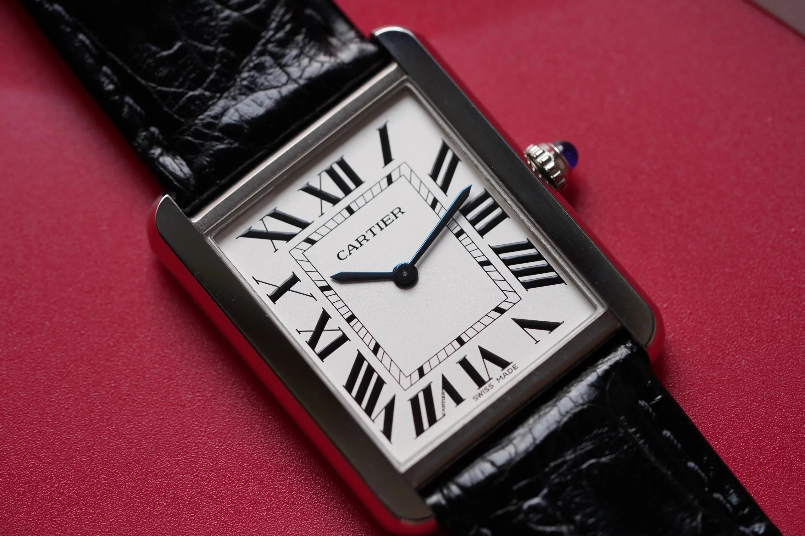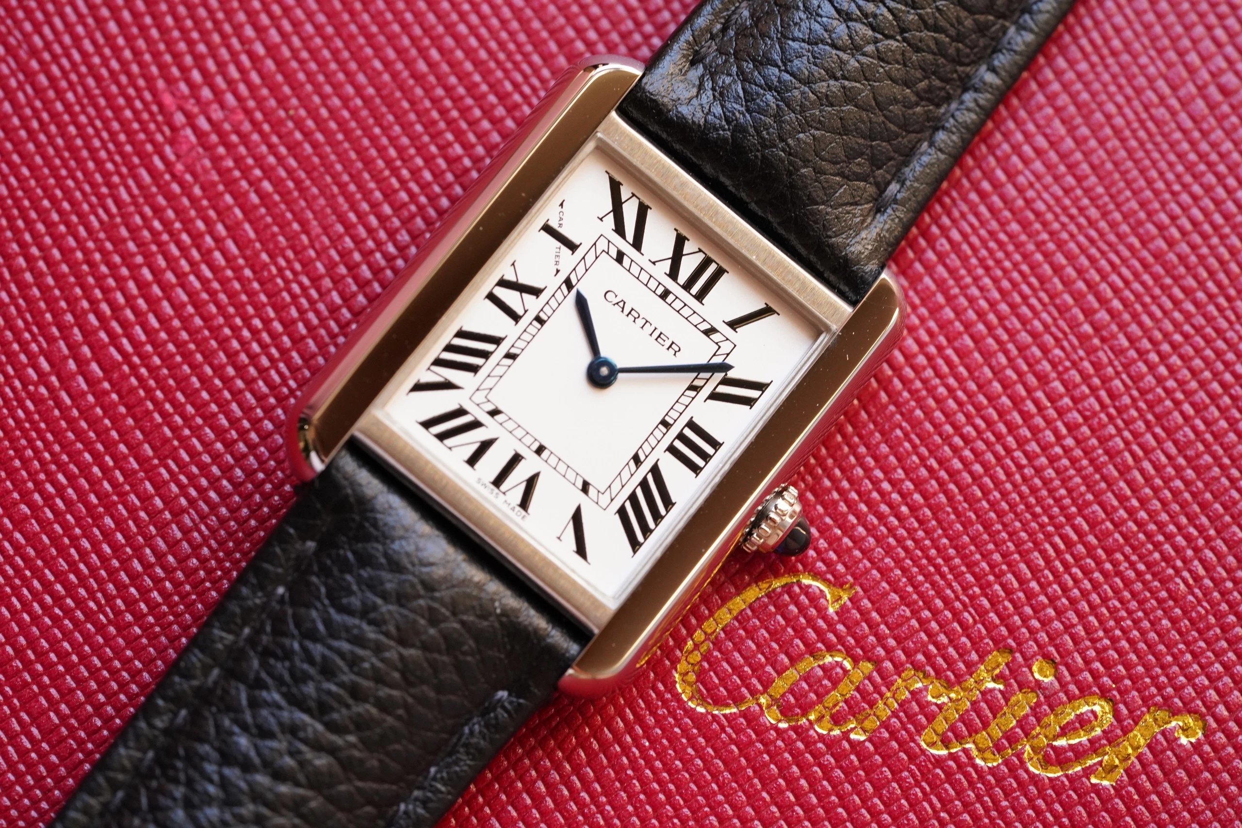 採用了經典的羅馬數字黑色時標、軌道式刻度標識的設計,這些元素可以追溯到1917年面世的第一代坦克,藍剛劍形指針,同樣12點處經典的卡地亞logo也將其名表的出身表露無遺。中號上手圖