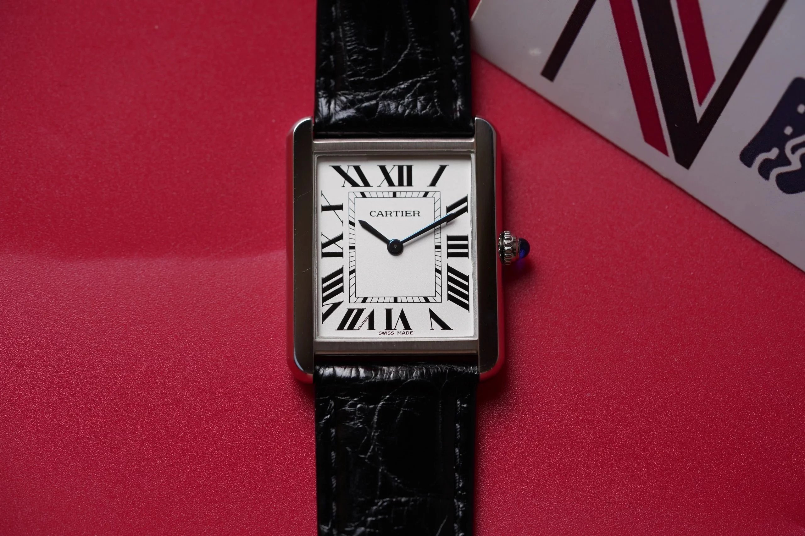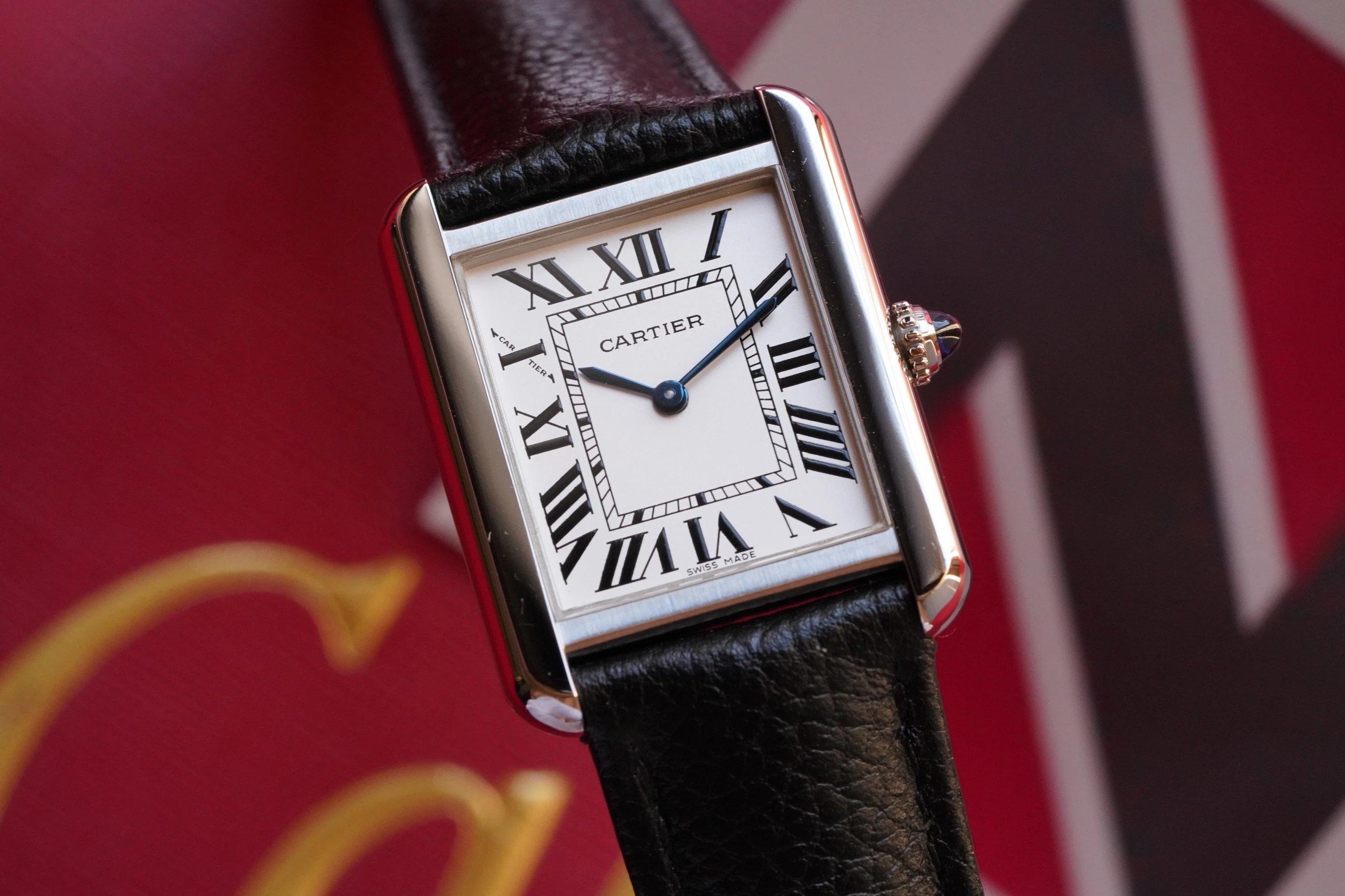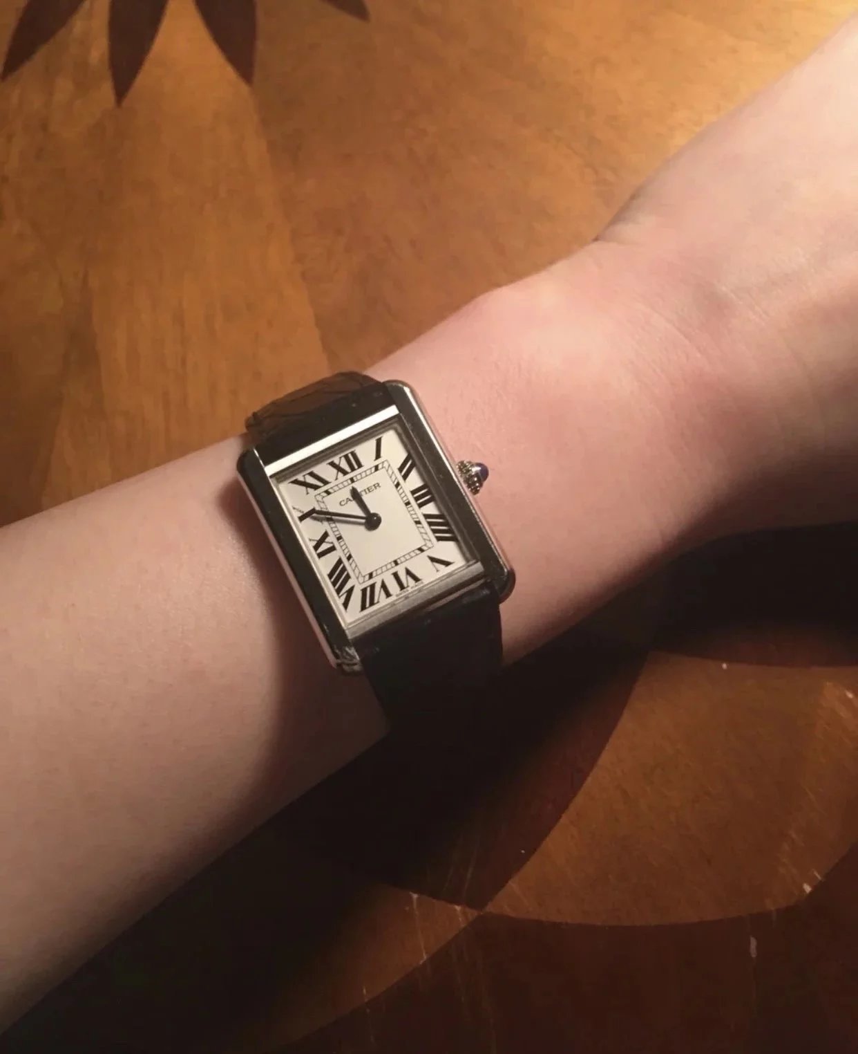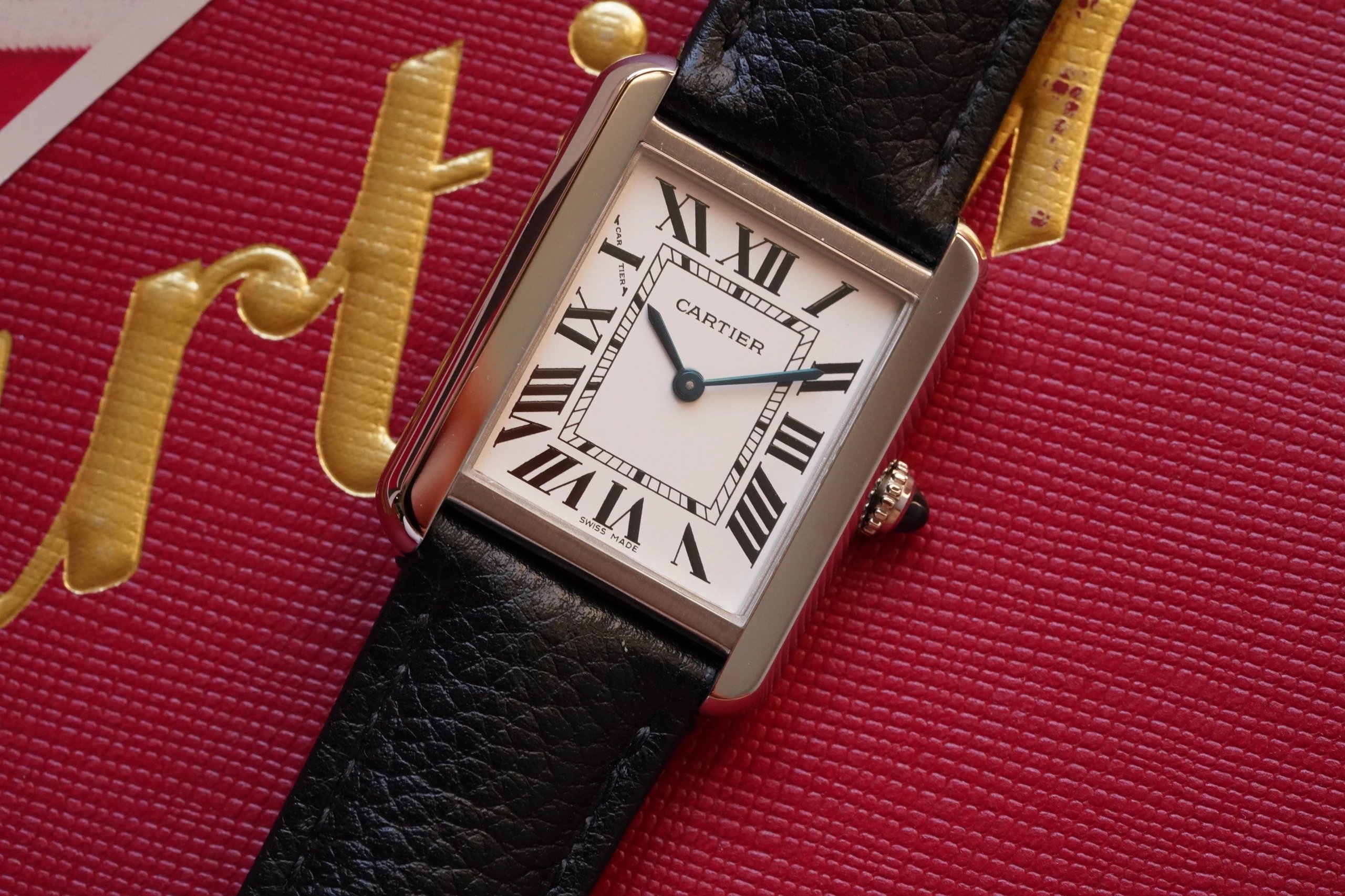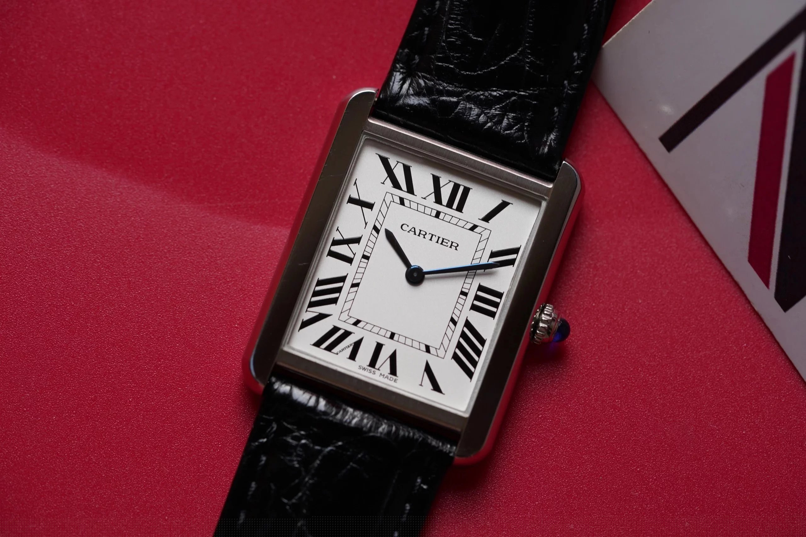 採用了經典的羅馬數字黑色時標、軌道式刻度標識的設計,這些元素可以追溯到1917年面世的第一代坦克,藍剛劍形指針,同樣12點處經典的卡地亞logo也將其名表的出身表露無遺。中號上手圖