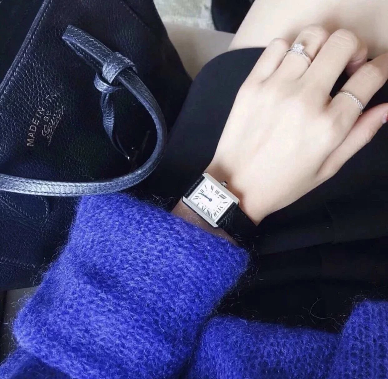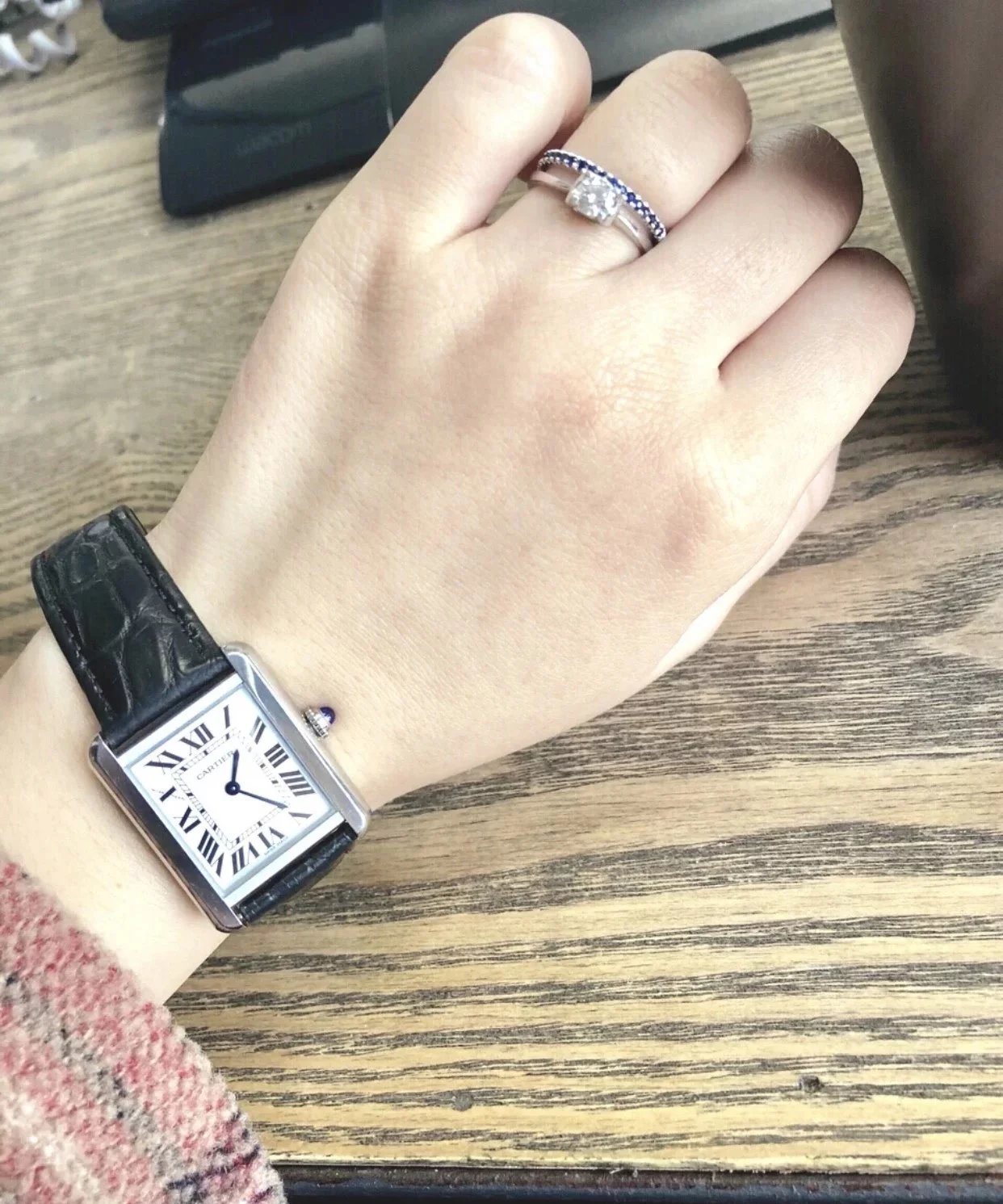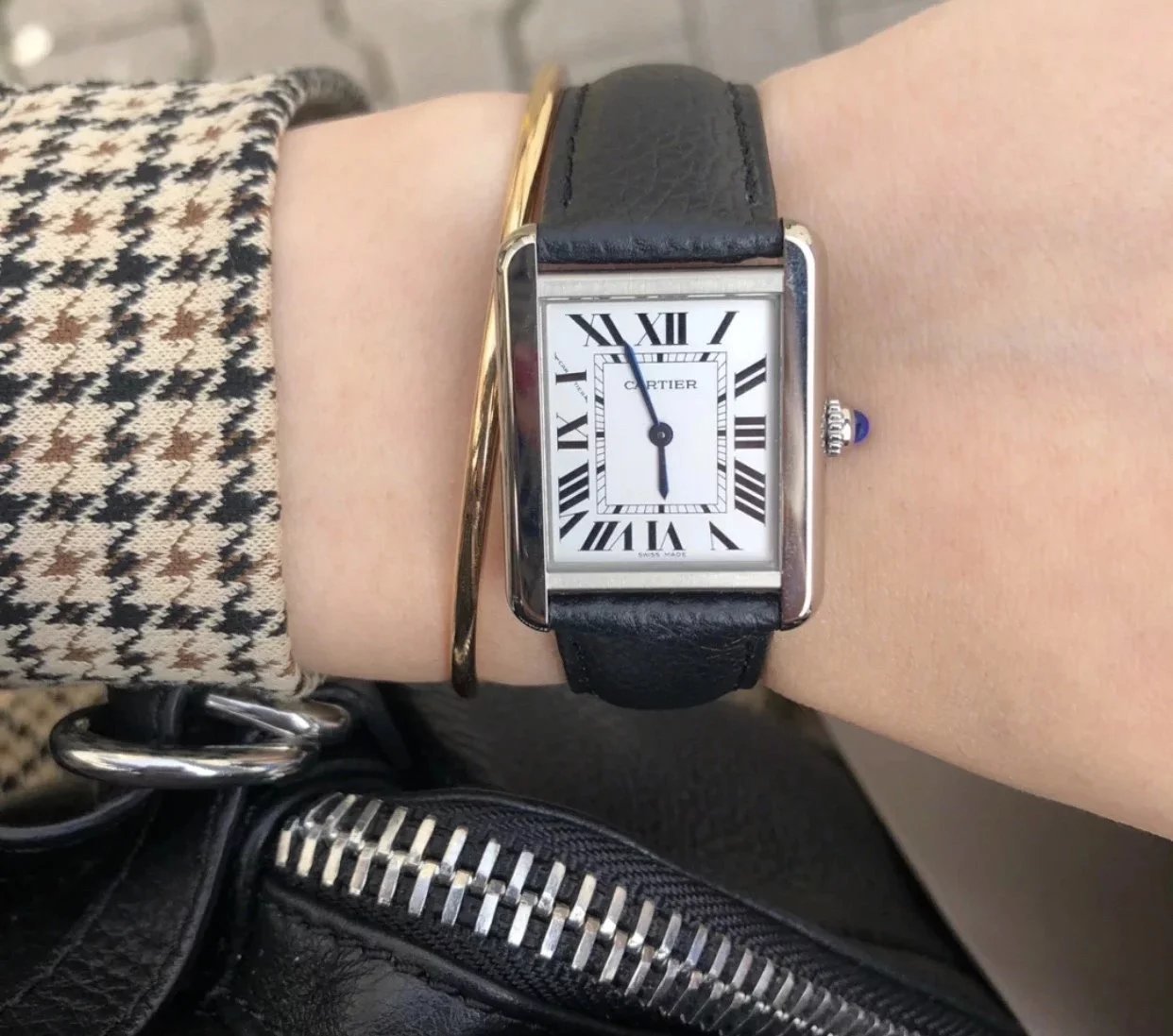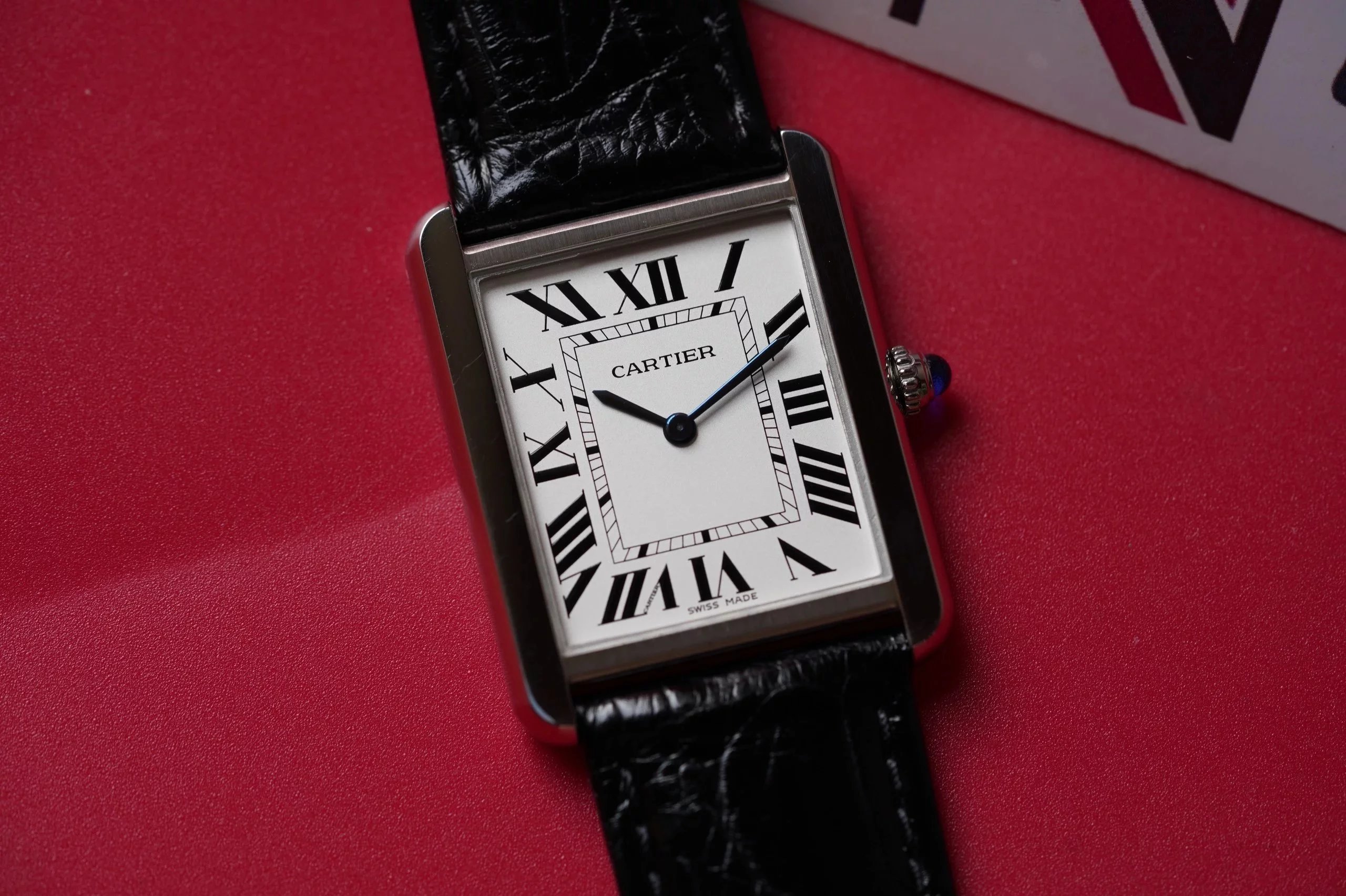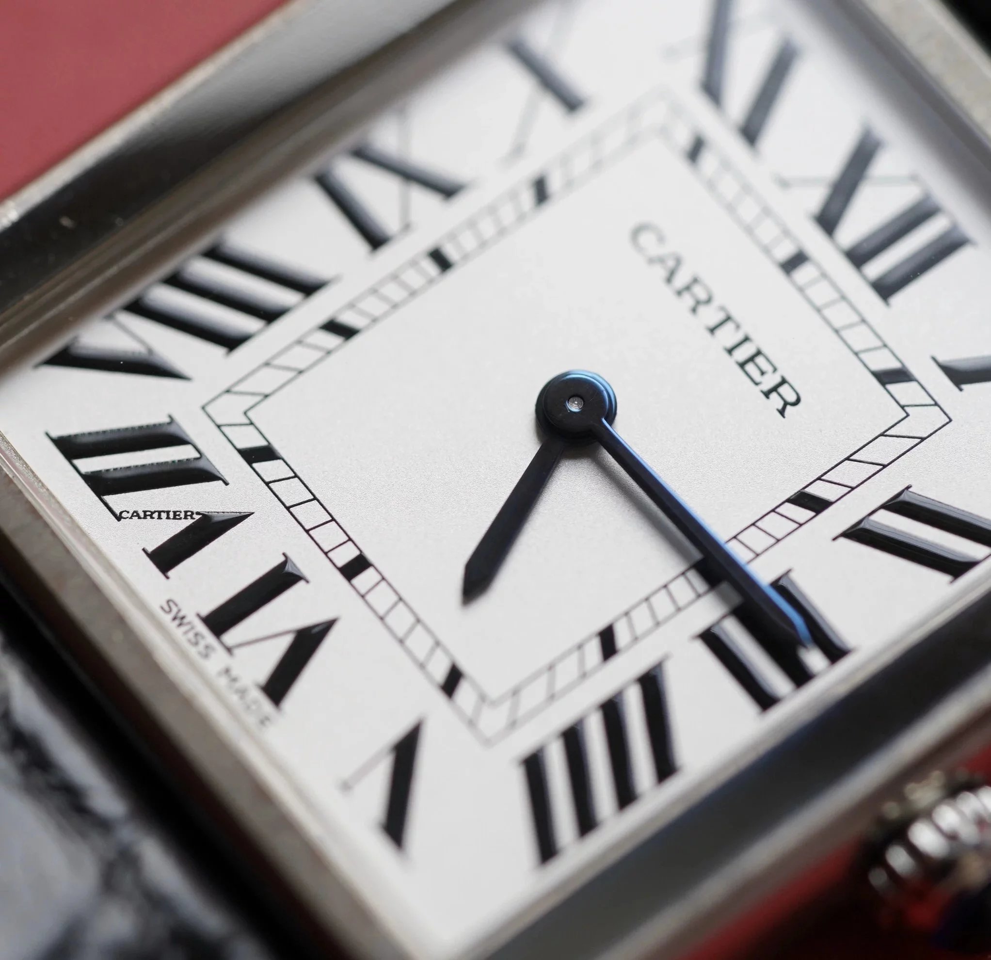採用了經典的羅馬數字黑色時標、軌道式刻度標識的設計,這些元素可以追溯到1917年面世的第一代坦克,藍剛劍形指針,同樣12點處經典的卡地亞logo也將其名表的出身表露無遺。中號上手圖