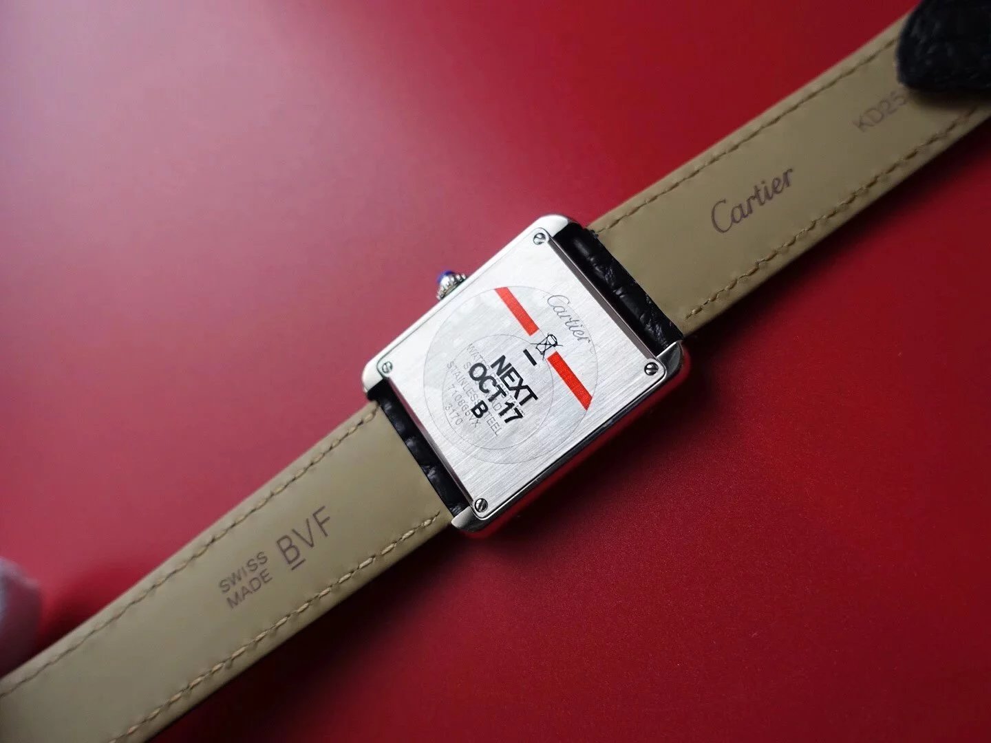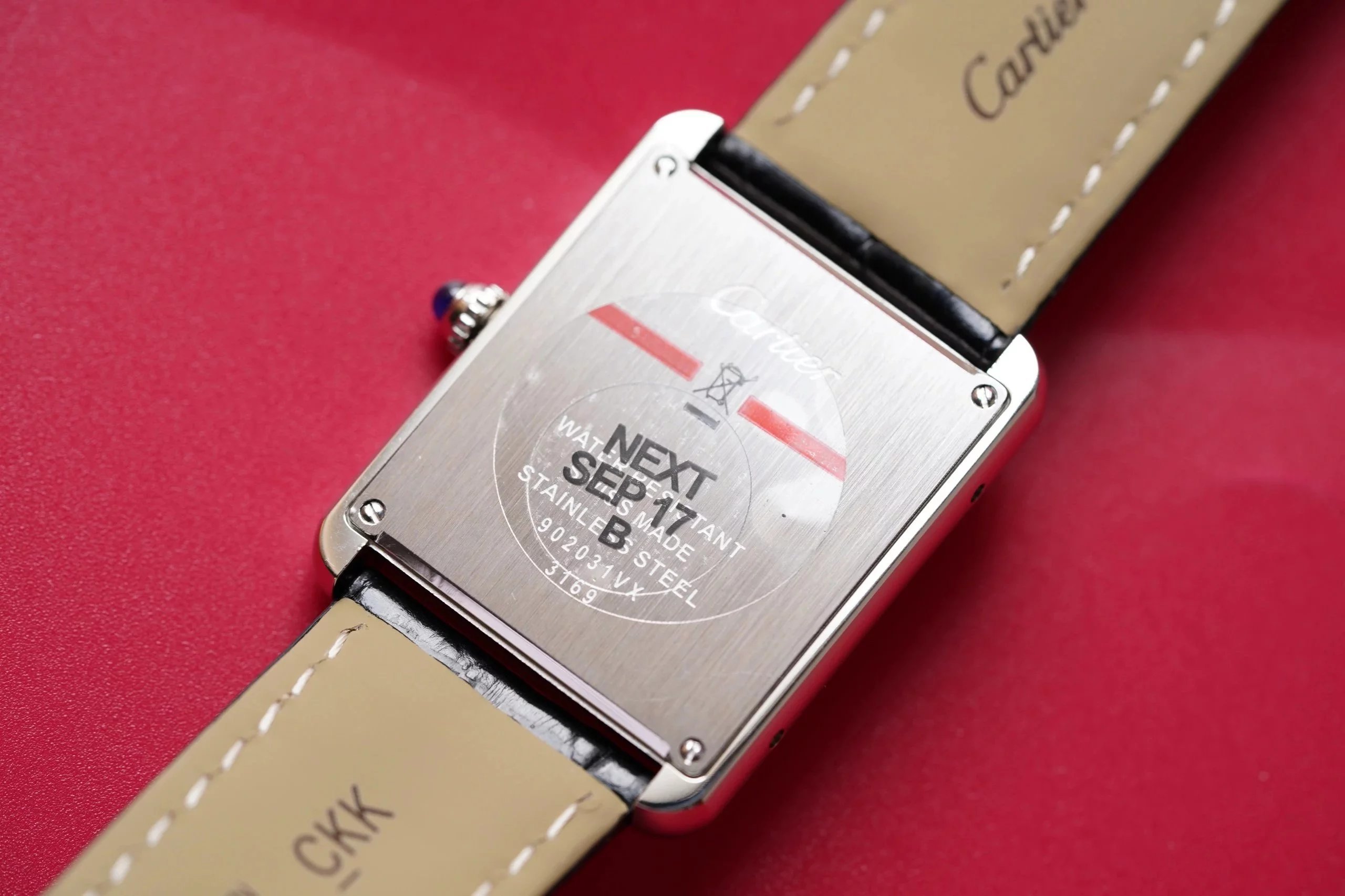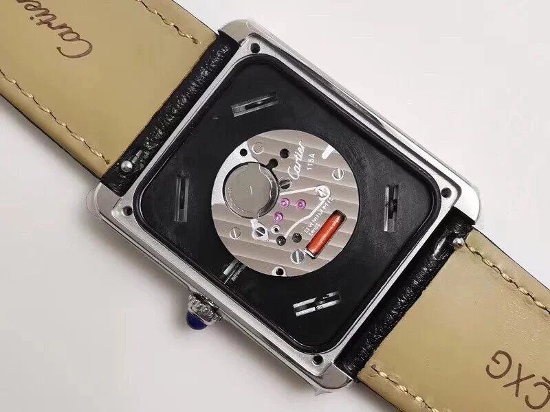 卡地亞坦克(TANK)複K女表採用與正品同樣材質的真鱷魚皮錶帶,精鋼表扣,裏面採用磨砂處理,表扣上刻字清晰。