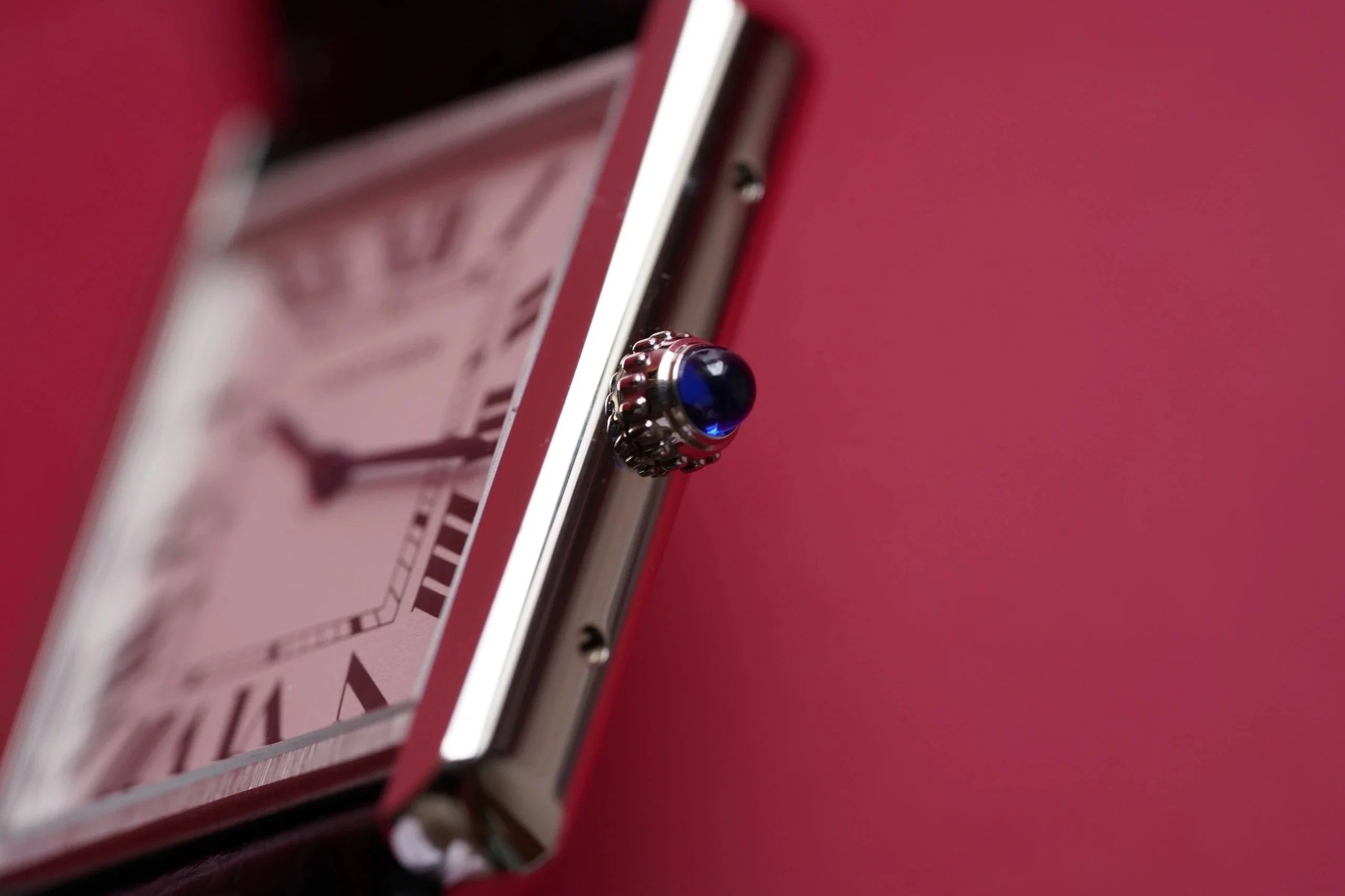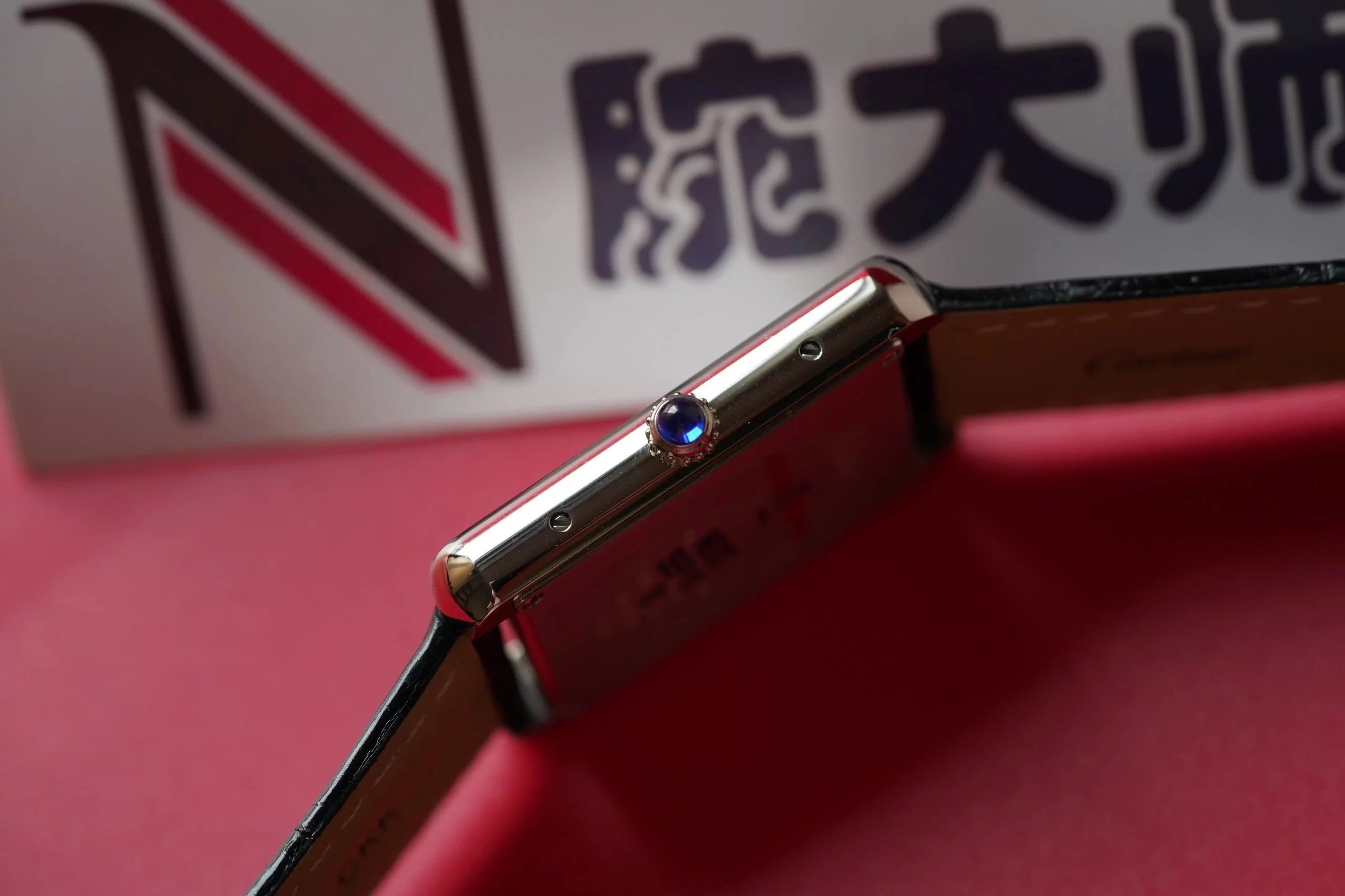 表殼側面厚度非常薄,僅僅有5.5mm,當然,因為是石英表的緣故,比一般的機械表更薄是正常的,側面拋光亮度高,左右兩側的表殼上分別有兩顆精鋼一字口螺絲,螺絲的大小和正品一致,表頭是推拉式設計,調試時間非常方便,表頭頂端的深藍色子彈型的尖晶石,給人深邃的感覺,不像有的小廠,藍度不夠,看起來有廉價感。
