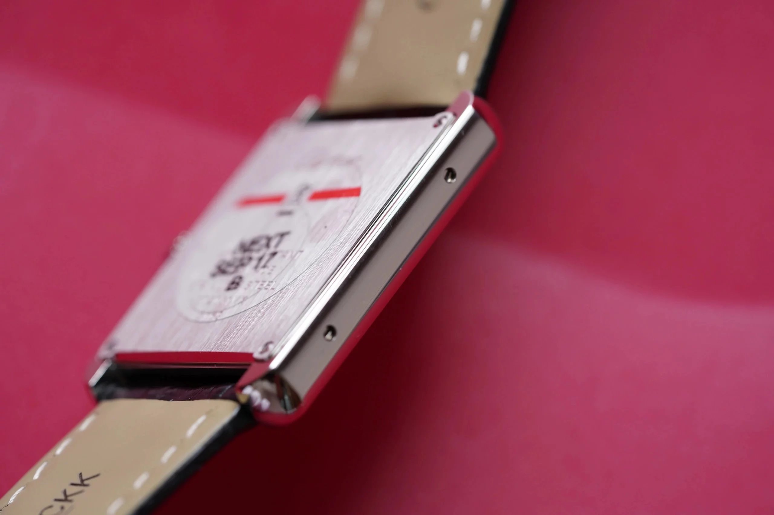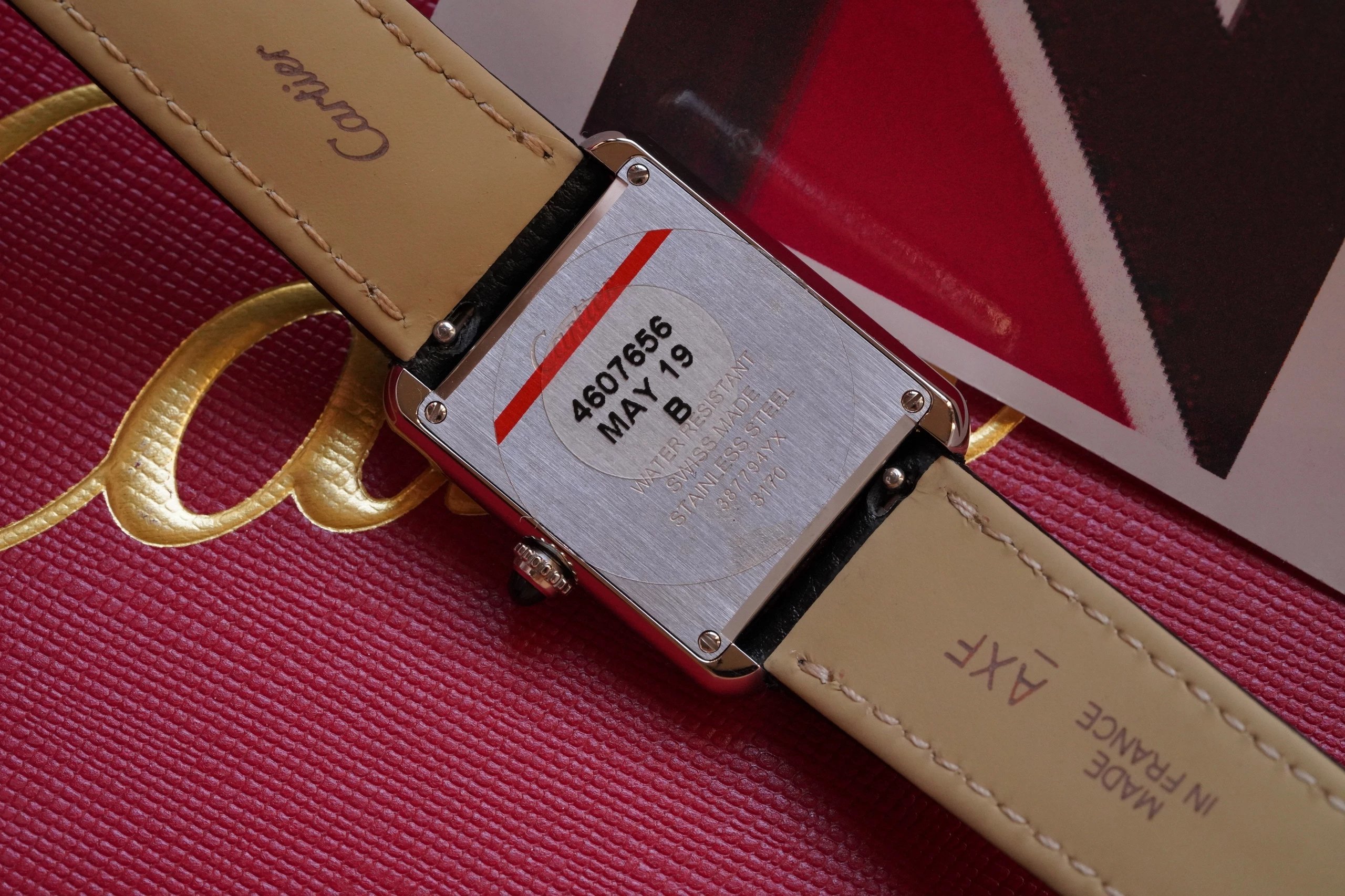 不透底設計,精鋼材質的底蓋,拉絲痕跡細膩明顯,上面的卡地亞英文字母以及其他字母深刻有力,一表一碼,絕不重複。底蓋用四顆一字口螺絲固定,分佈在四個角上,和表殼結合緊密,滿足平時的防水。