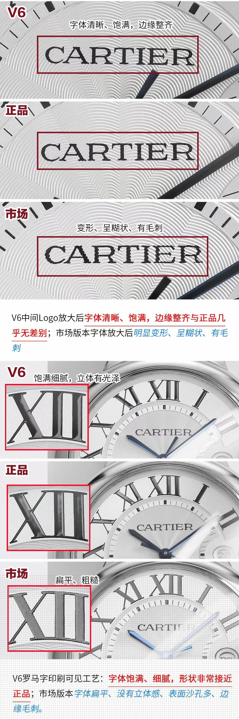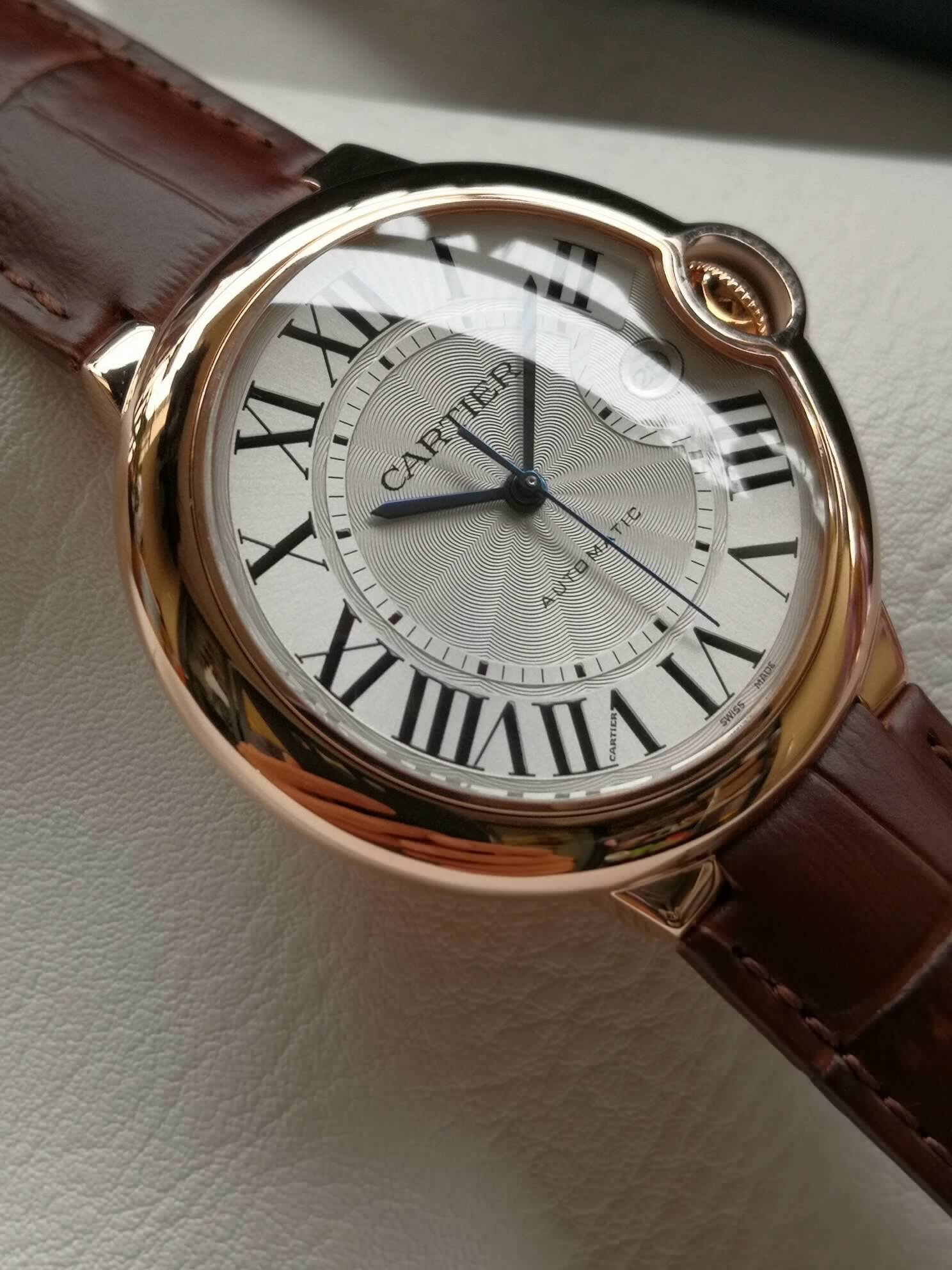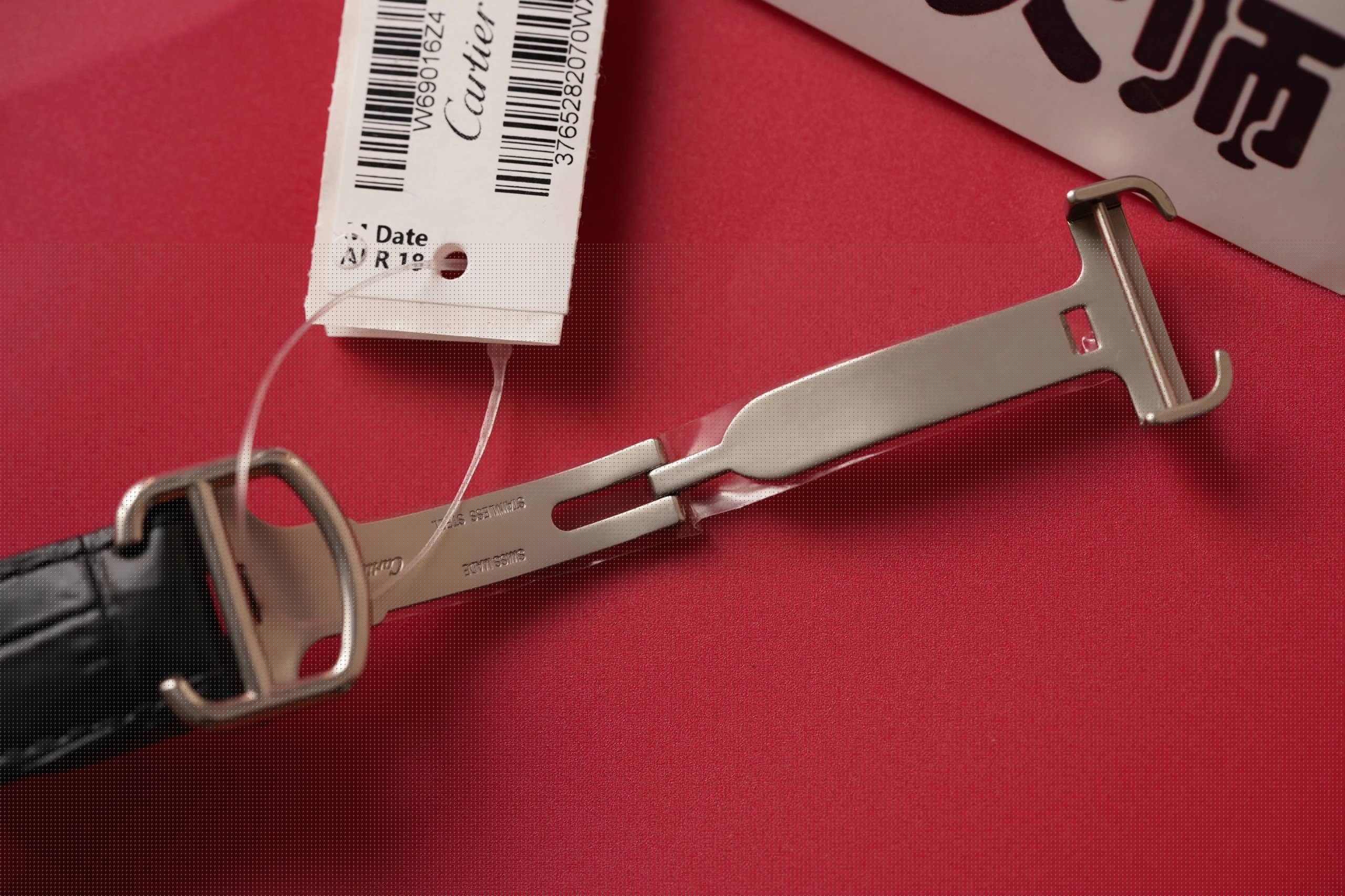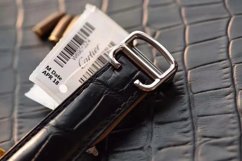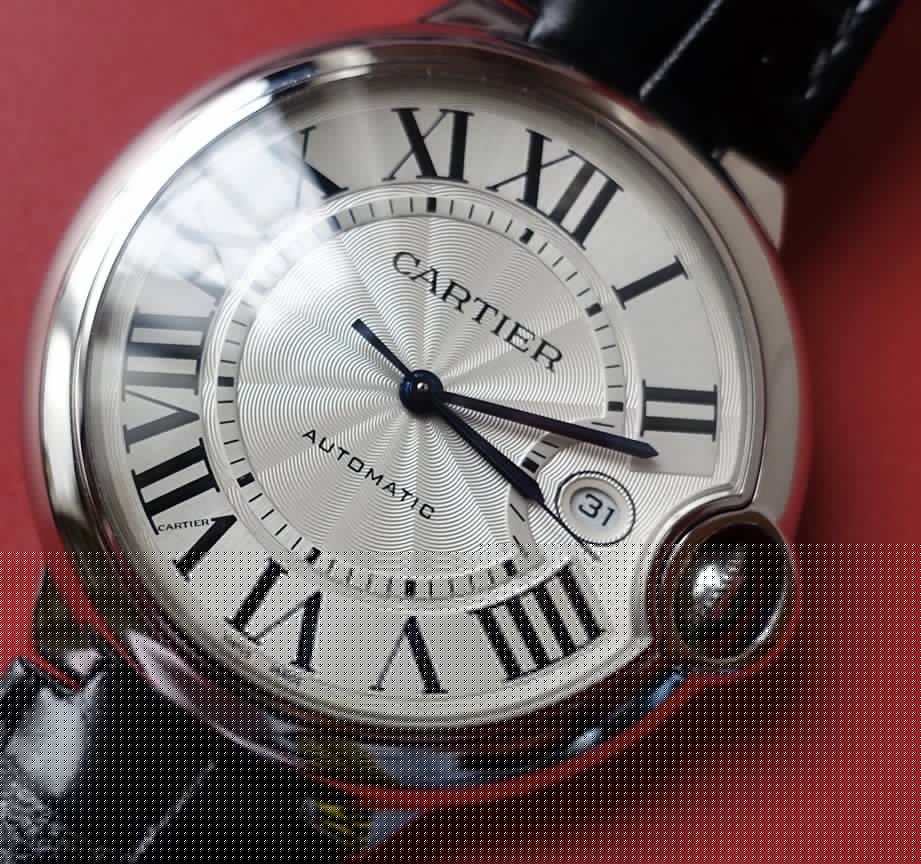 盤面做工:可以非常清晰的看到字面,羅馬數字刻度使用的是油壓工藝,刻度飽滿,清晰、黑亮、凸起的、立體感非常贊!所有的刻度,都沒有任何位置的偏差。7點位置有一極小斜印的“CARTIER”字母,這最能考察藍氣球的印刷水準了,工藝水準非常高