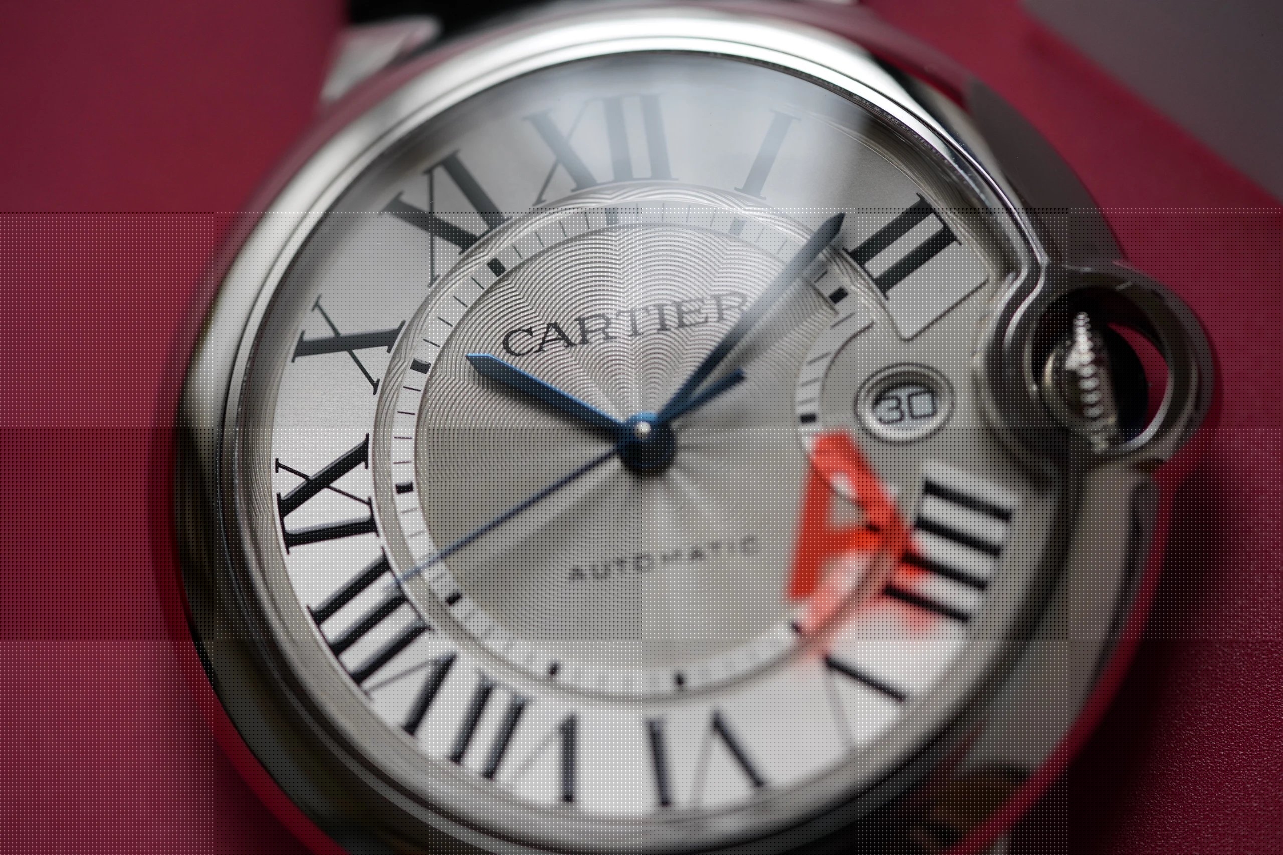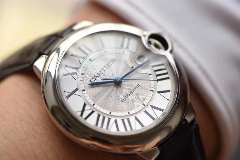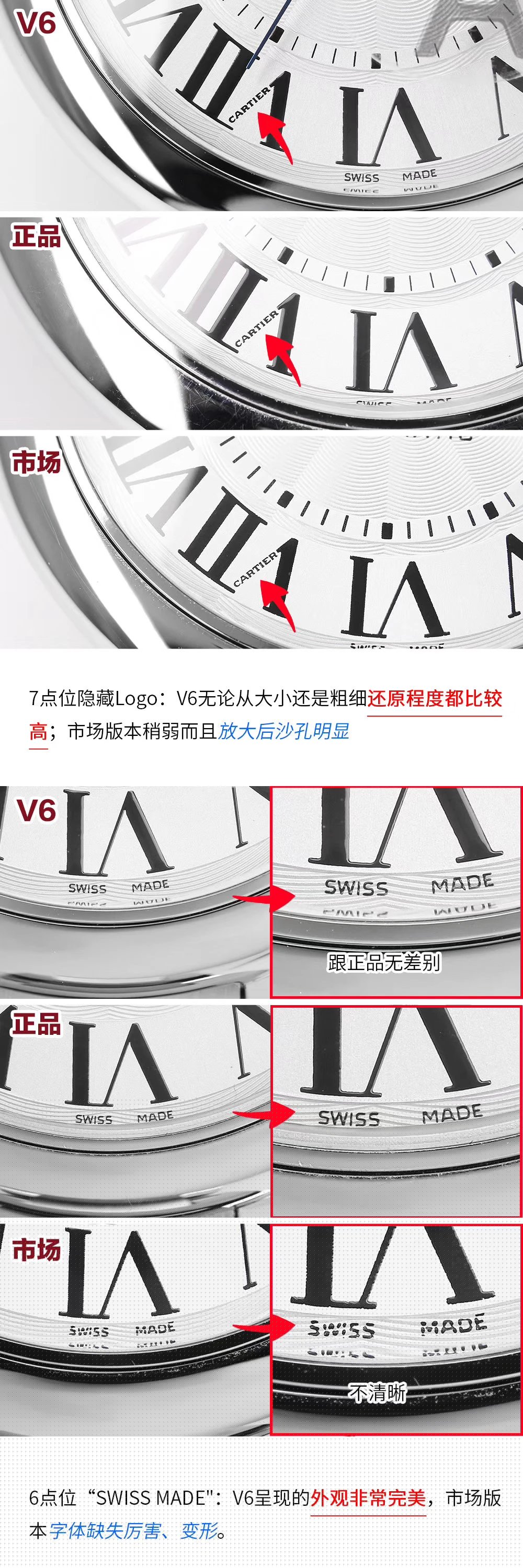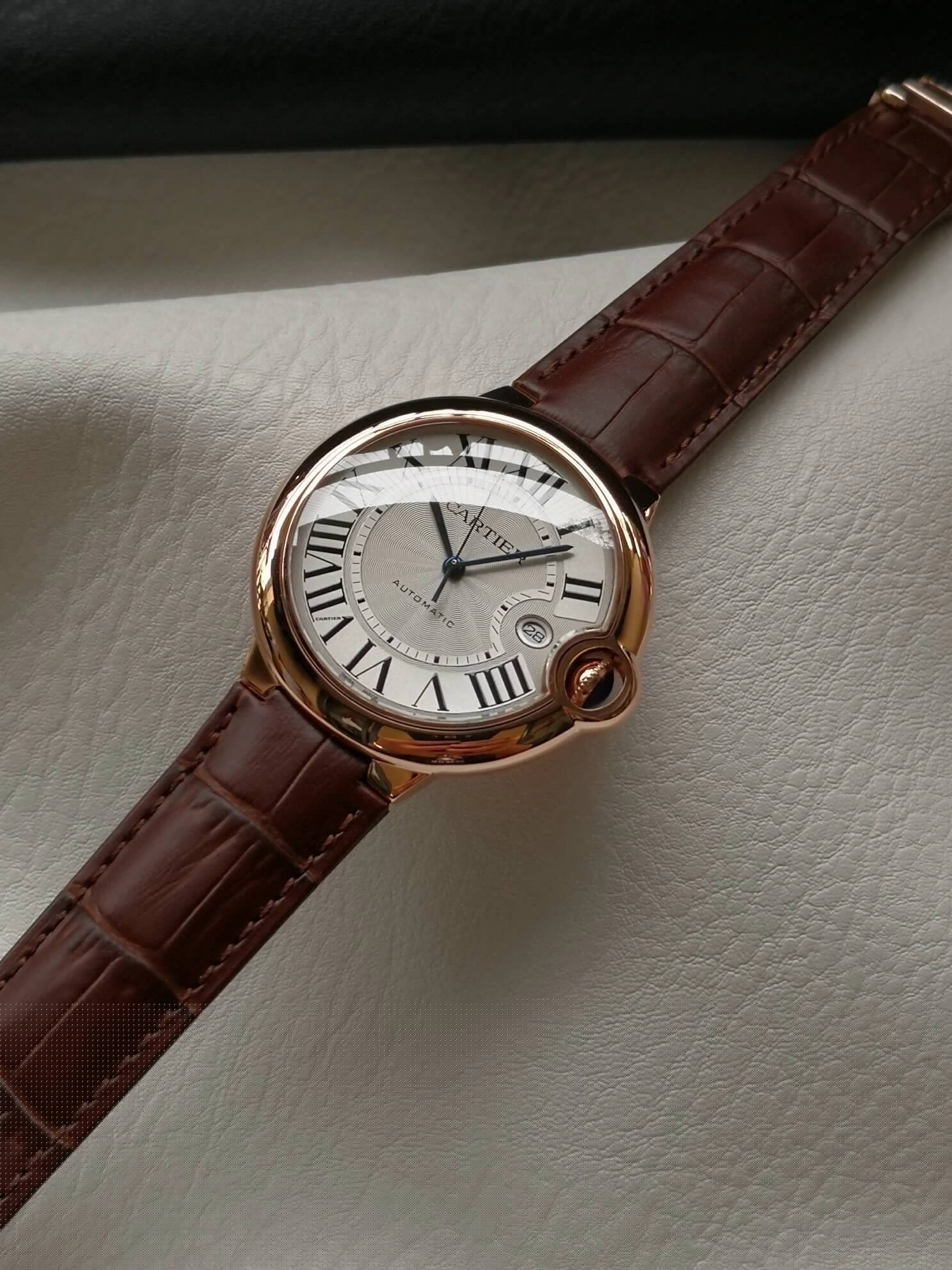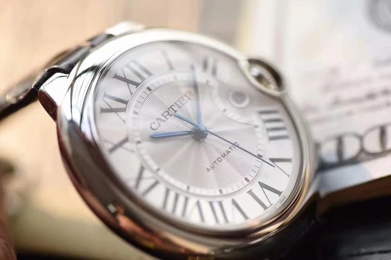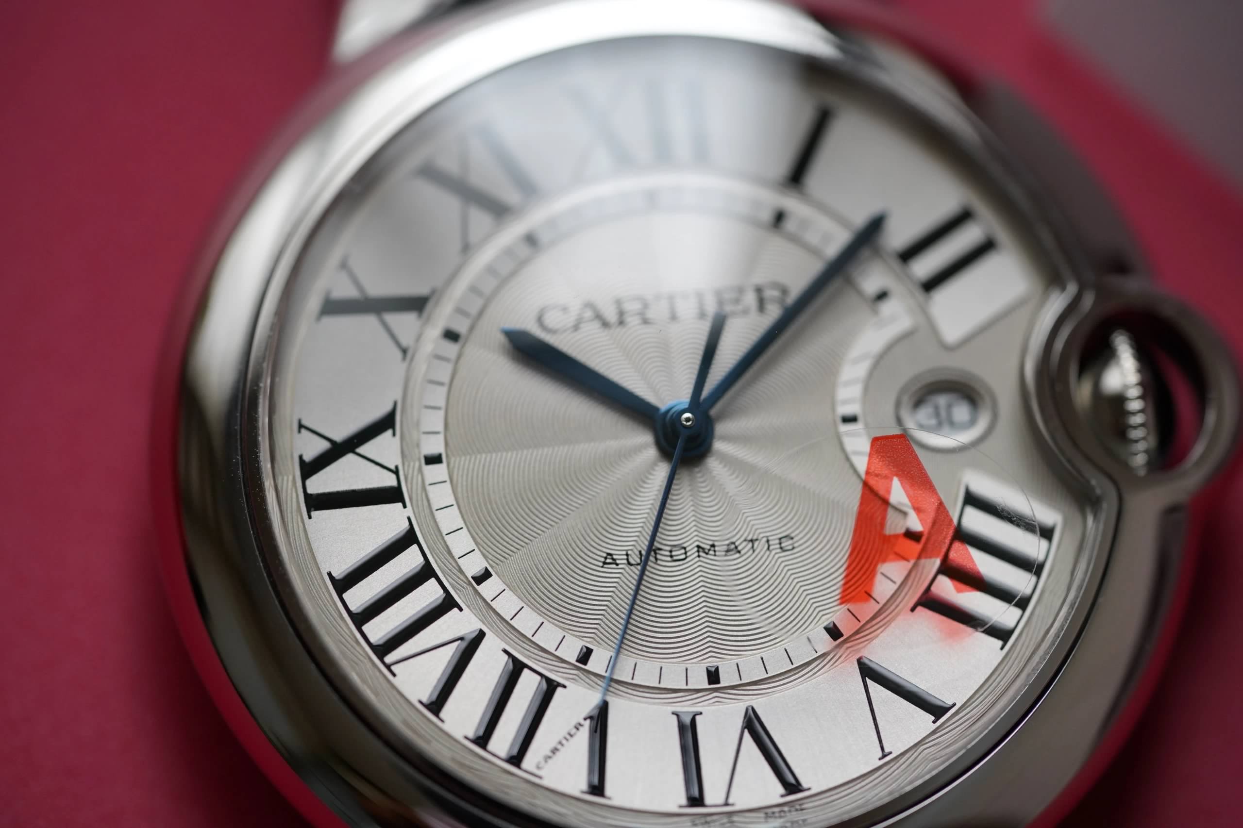 盤面做工:可以非常清晰的看到字面,羅馬數字刻度使用的是油壓工藝,刻度飽滿,清晰、黑亮、凸起的、立體感非常贊!所有的刻度,都沒有任何位置的偏差。7點位置有一極小斜印的“CARTIER”字母,這最能考察藍氣球的印刷水準了,工藝水準非常高