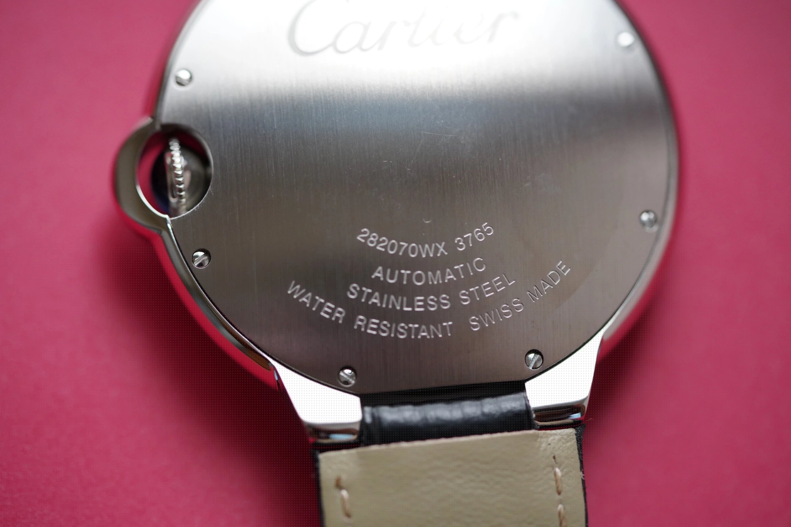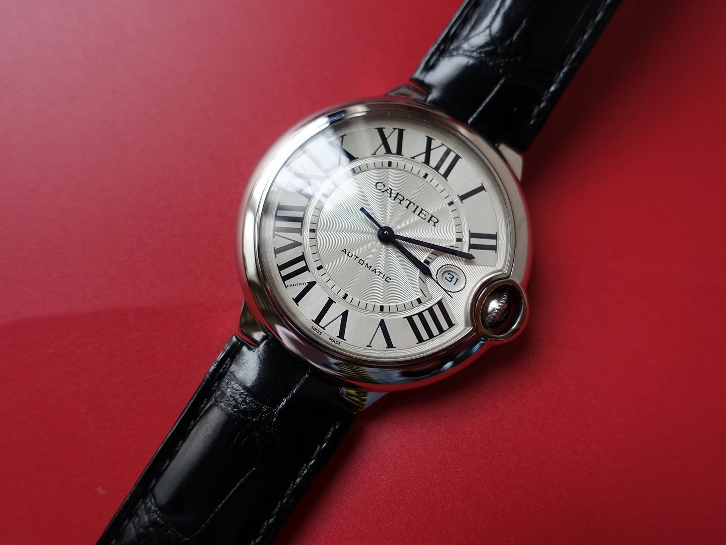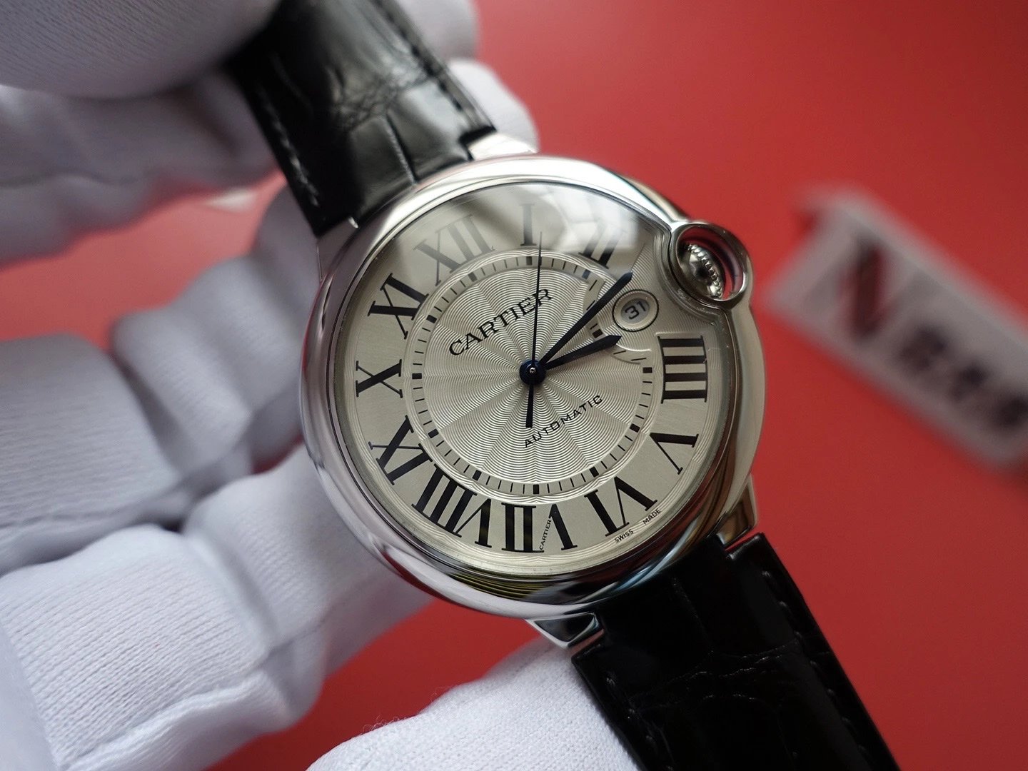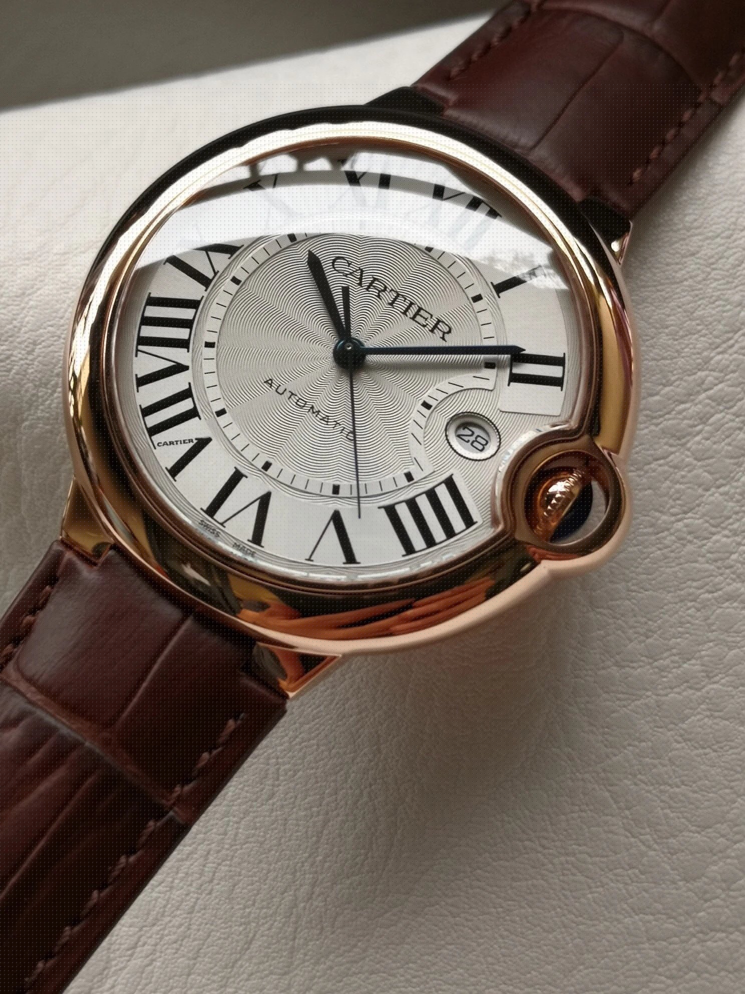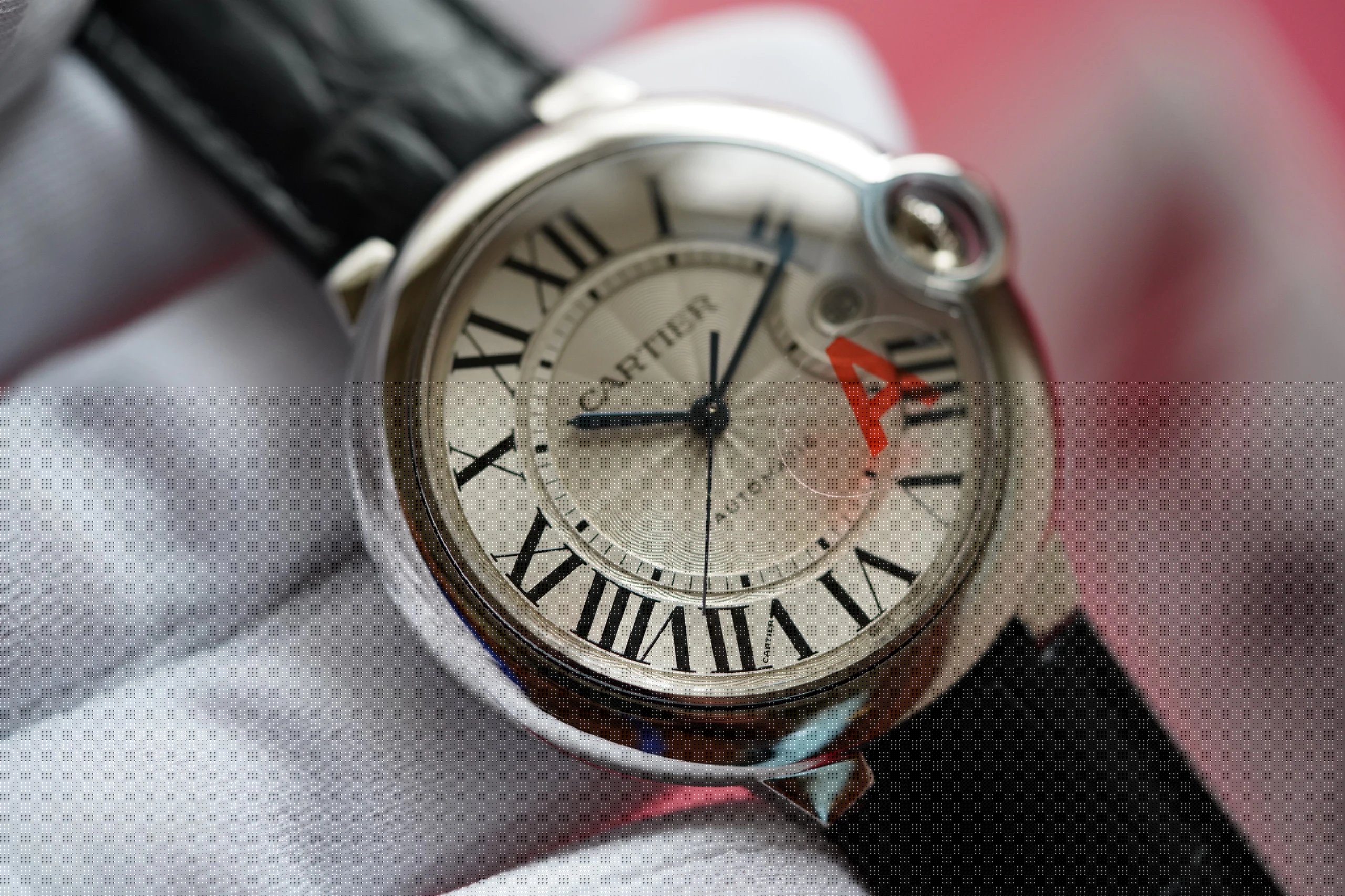 盤面做工:可以非常清晰的看到字面,羅馬數字刻度使用的是油壓工藝,刻度飽滿,清晰、黑亮、凸起的、立體感非常贊!所有的刻度,都沒有任何位置的偏差。7點位置有一極小斜印的“CARTIER”字母,這最能考察藍氣球的印刷水準了,工藝水準非常高