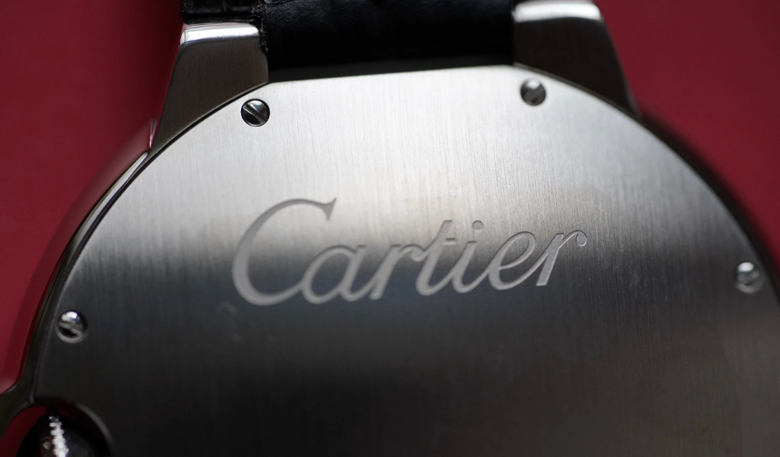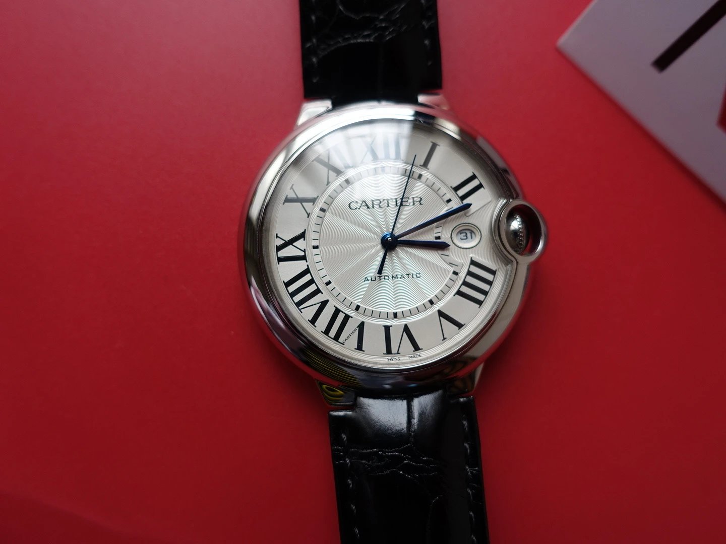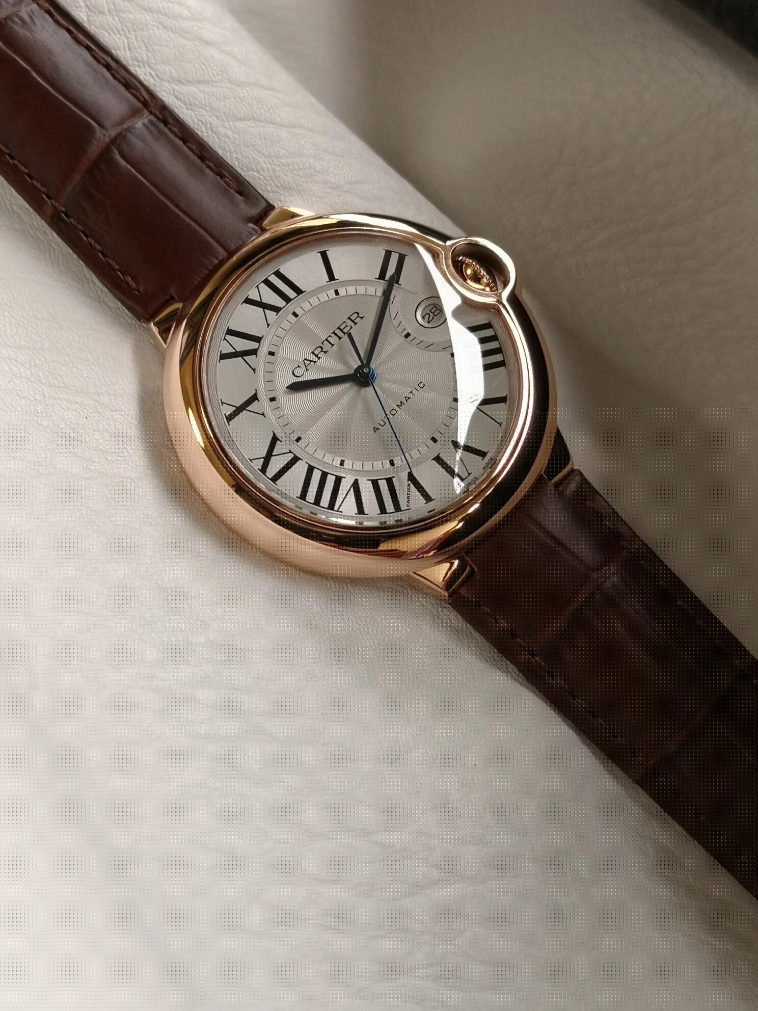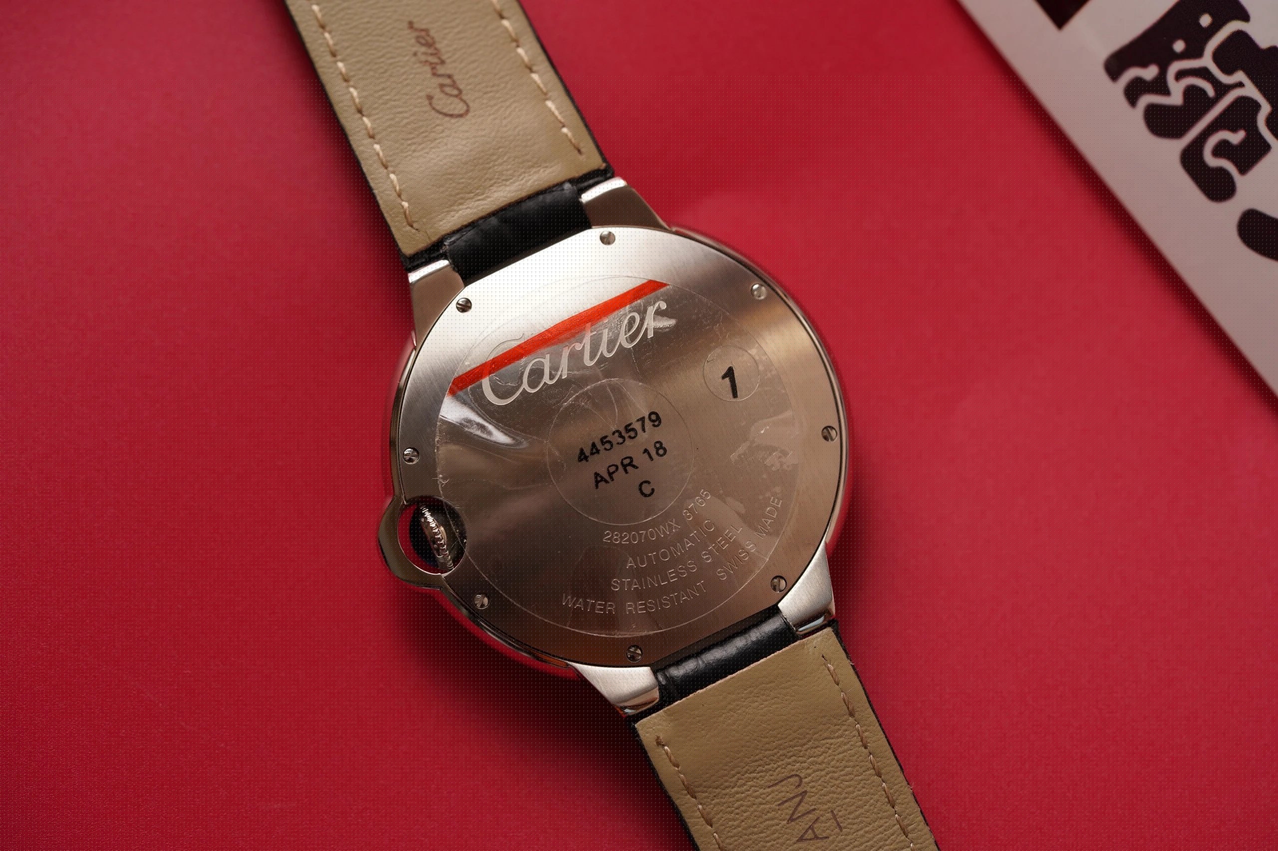 盤面做工:可以非常清晰的看到字面,羅馬數字刻度使用的是油壓工藝,刻度飽滿,清晰、黑亮、凸起的、立體感非常贊!所有的刻度,都沒有任何位置的偏差。7點位置有一極小斜印的“CARTIER”字母,這最能考察藍氣球的印刷水準了,工藝水準非常高