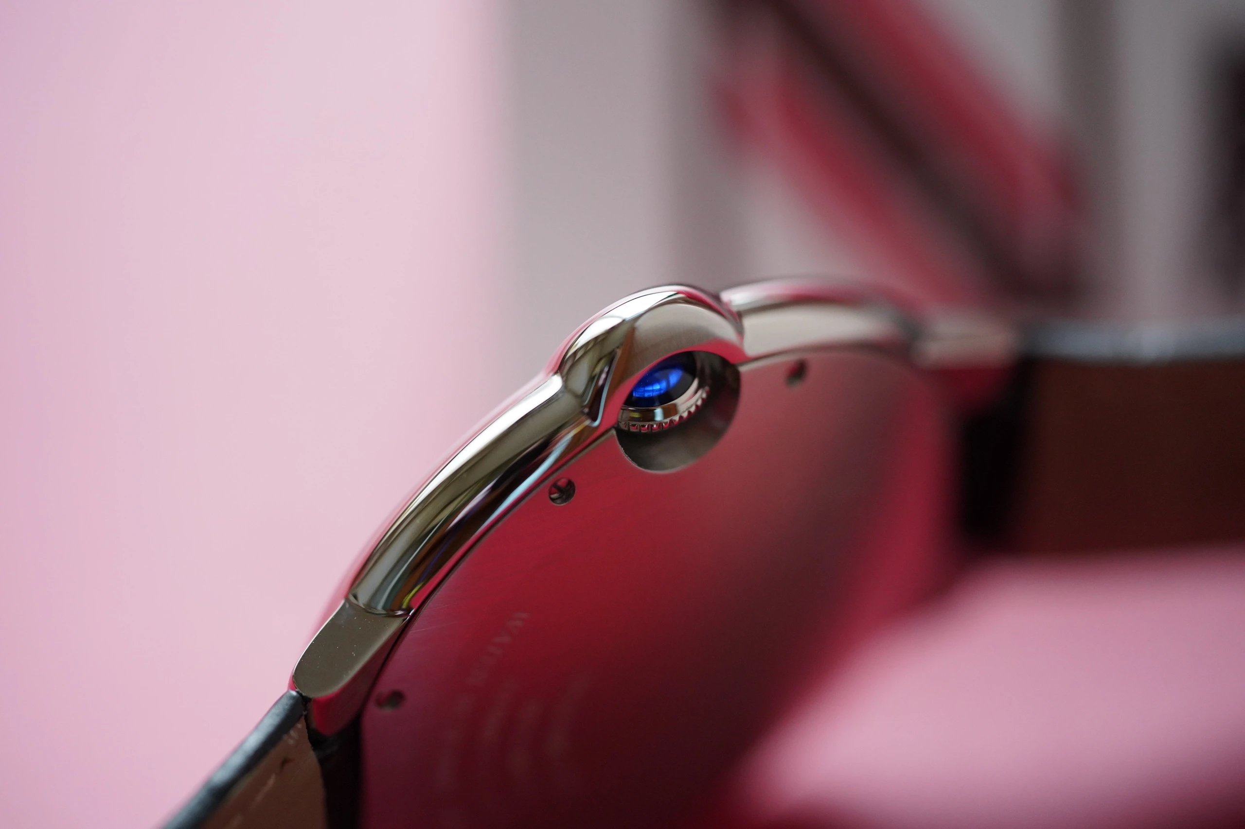 設計精良的殼形,是卡地亞的一大特點,卡地亞的手錶大部分都是特殊形狀。山度士是正方形的;坦克是長方形的;DRIVE是靠墊形的;鑰匙是鮑魚殼;TORTUE是龜背形的。圓形的藍氣球由於增加了一個完全包裹住表冠的護肩,也變成了一個特殊的圓形表殼。而護肩中帶有藍色尖晶石的表冠,就是藍氣球這個名字的由來。