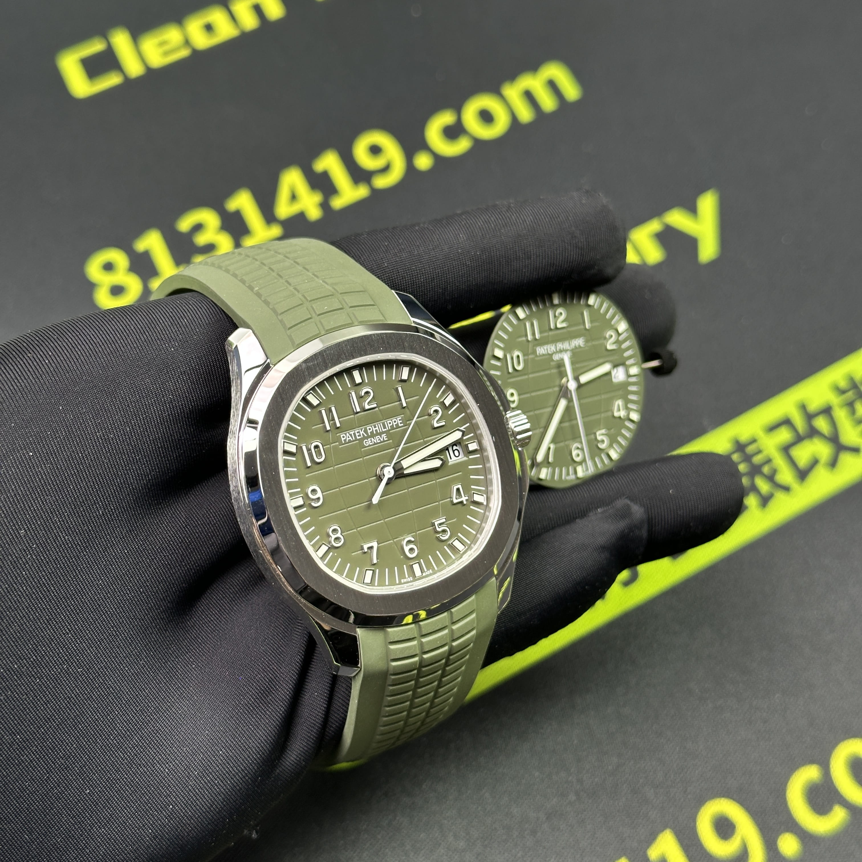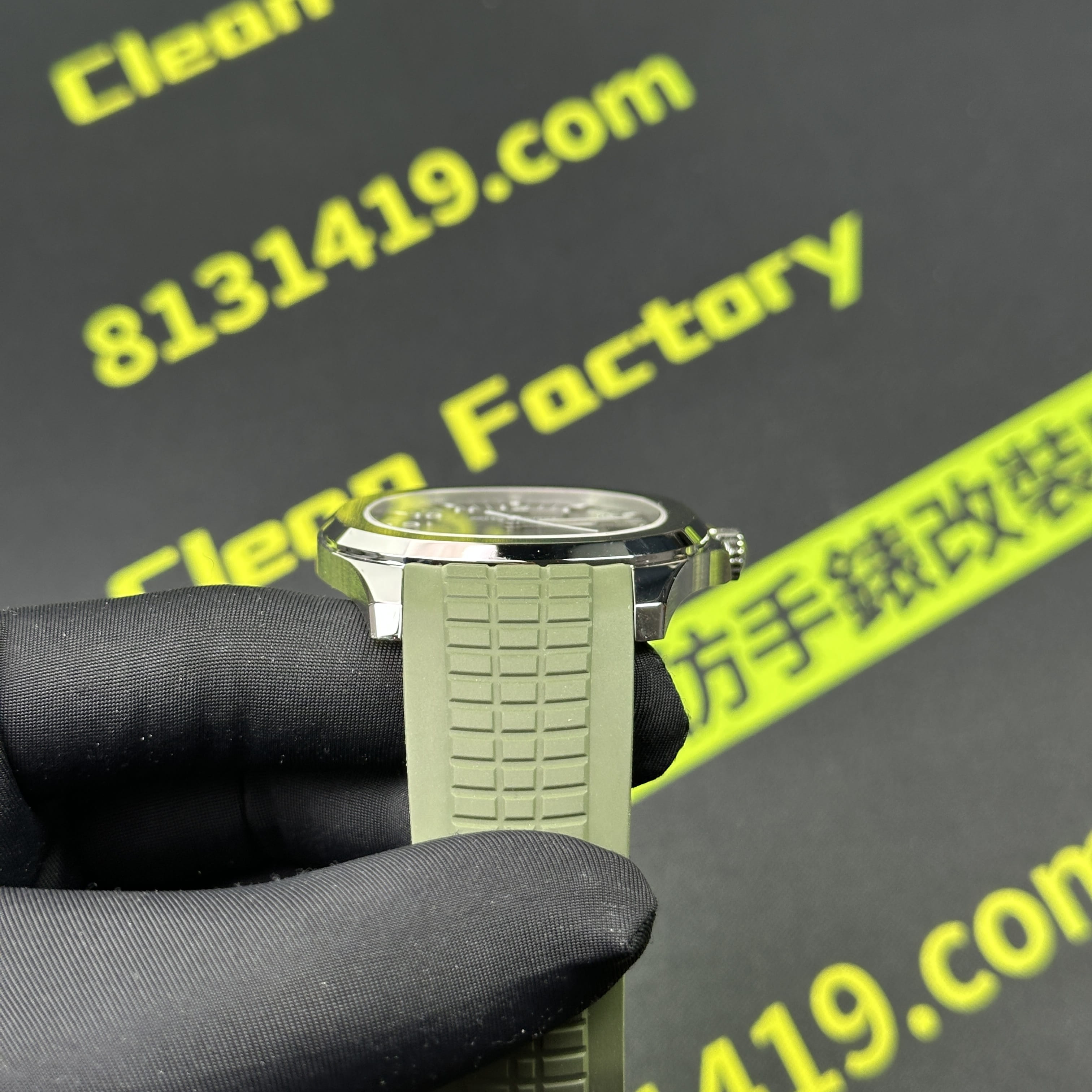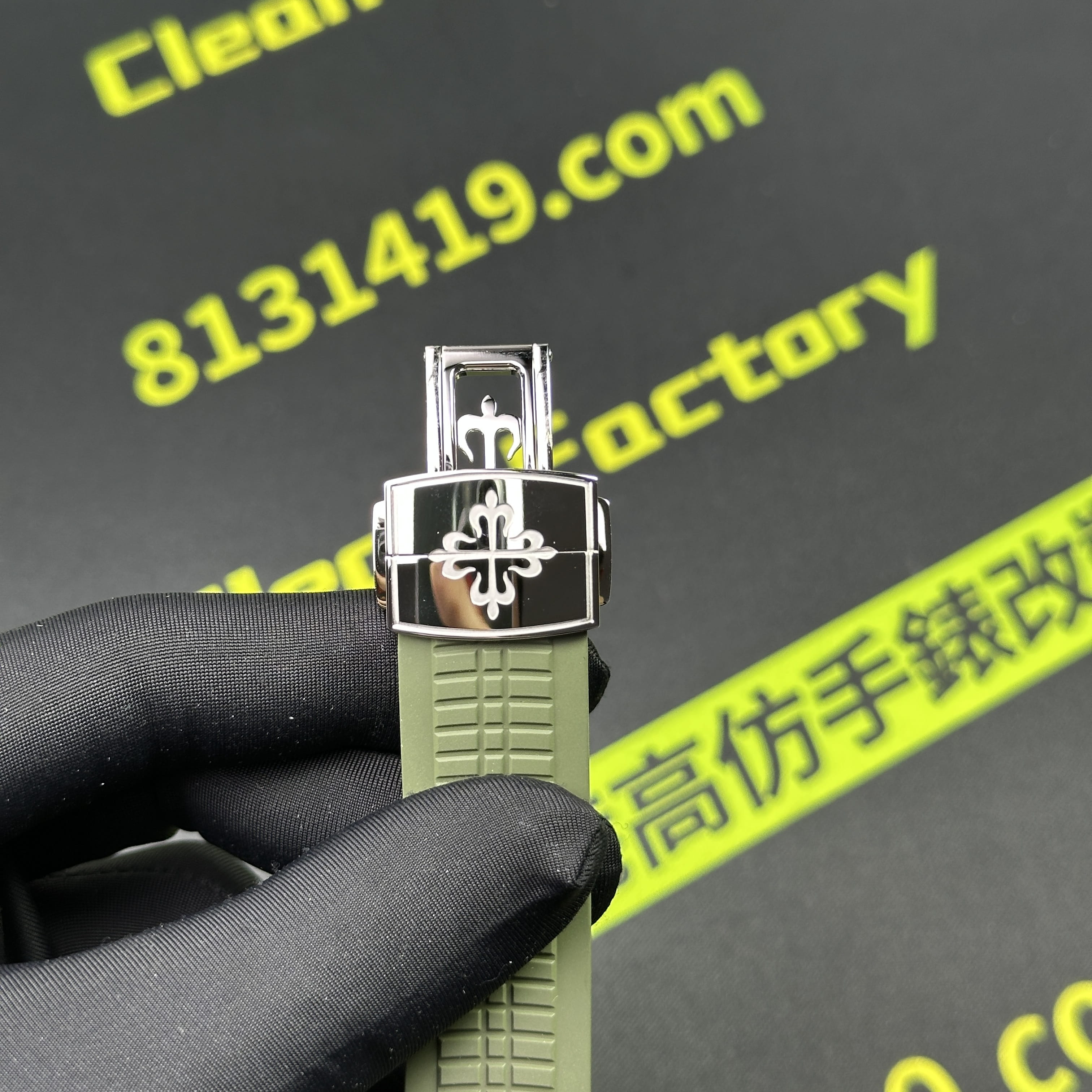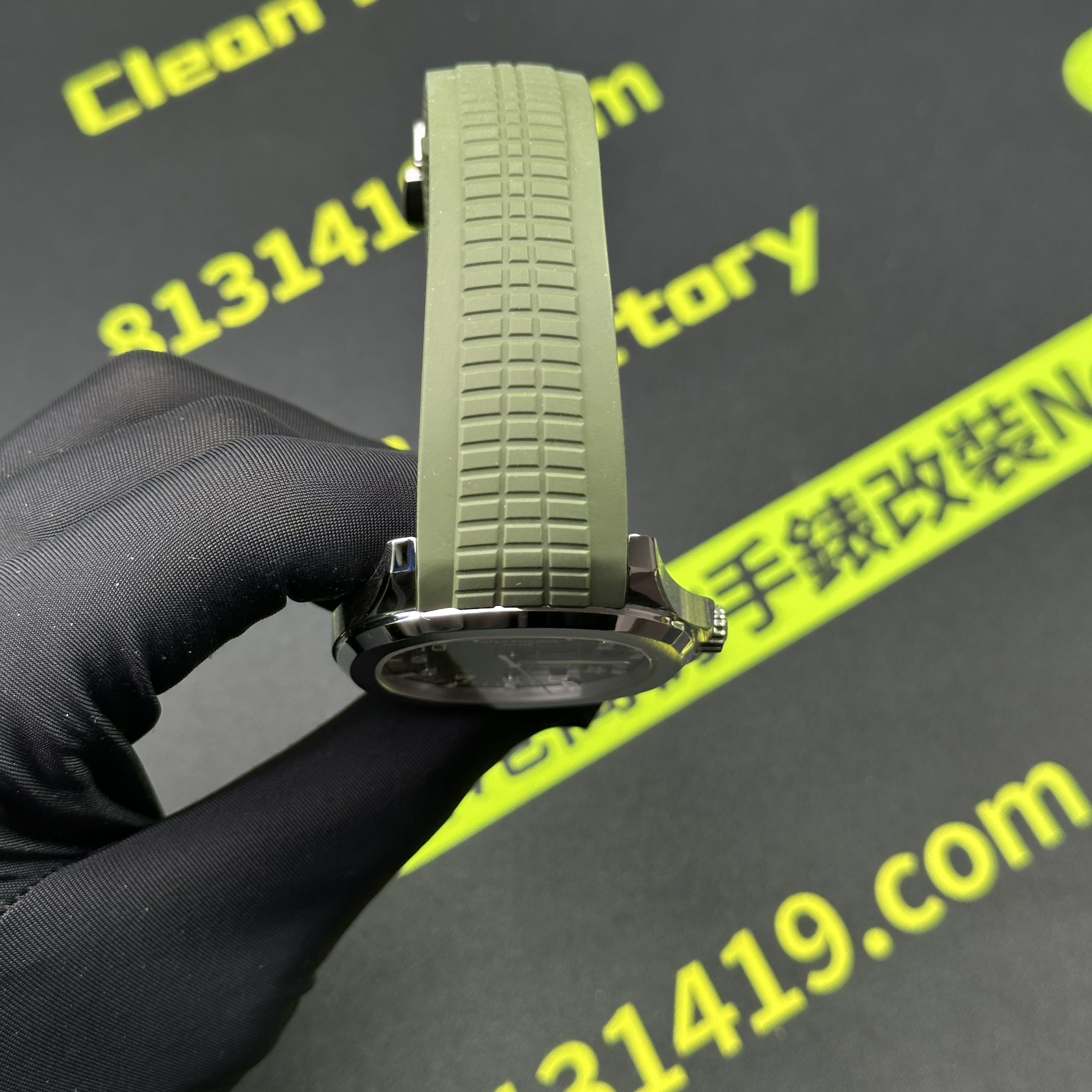 3K廠百達翡麗AQUANAUT系列5168G-010私人訂製滿配改裝升級案例,整錶尺寸42.2mm,3K廠綠手雷厚薄度做到了8.3mm,是通過原版1:1開模復刻而成,規格,尺寸方面基本上都是符合專櫃版本的結構要求!綠色的錶盤和綠色的橡膠錶帶其結構塑造的"手雷"紋理紋路均是統一版型.對於3K廠5168私人訂製綠手雷錶盤更換代用級別的盤面是針對原3K廠綠手雷對比專櫃版本存在明顯的色差!原3K廠5168G綠色盤面是深綠色,而原裝正品的盤面是橄欖綠色,兩者形成了鮮明色差對比.