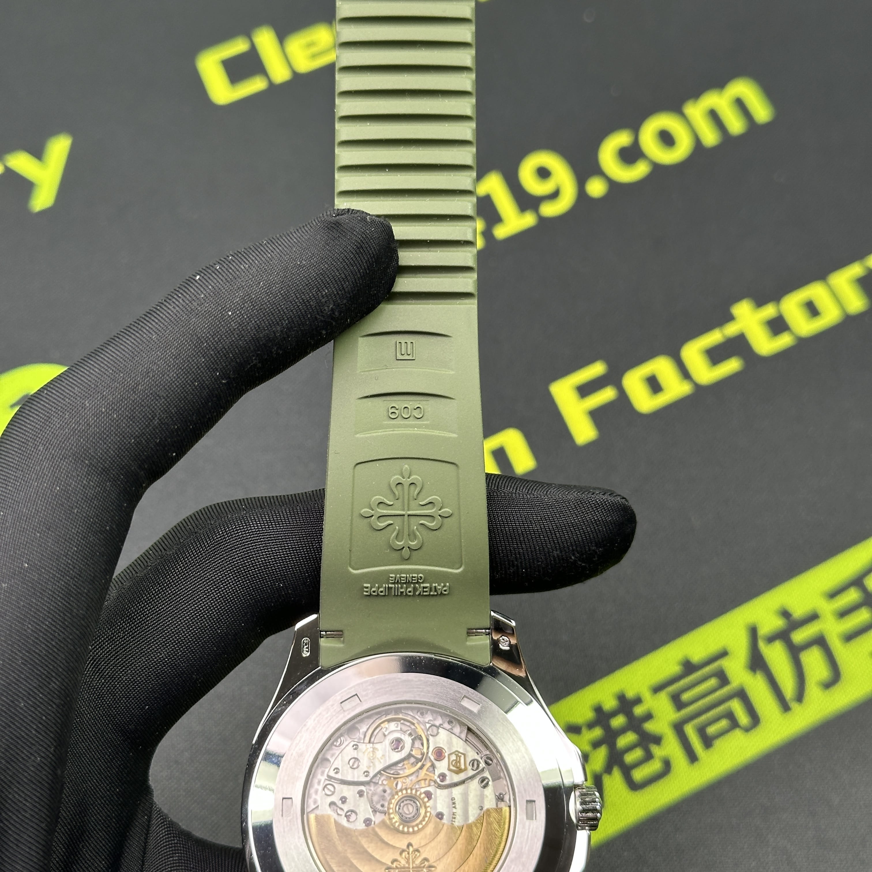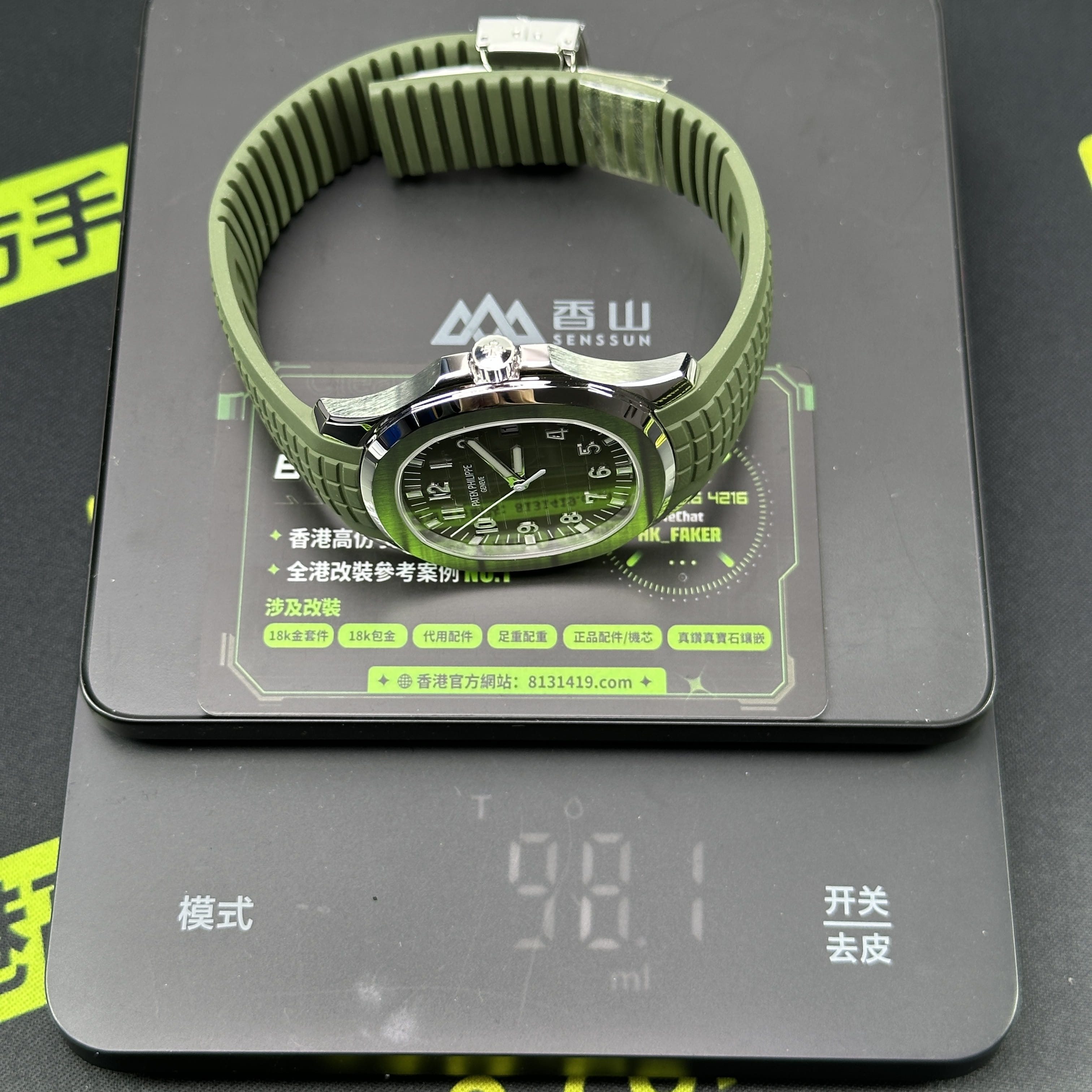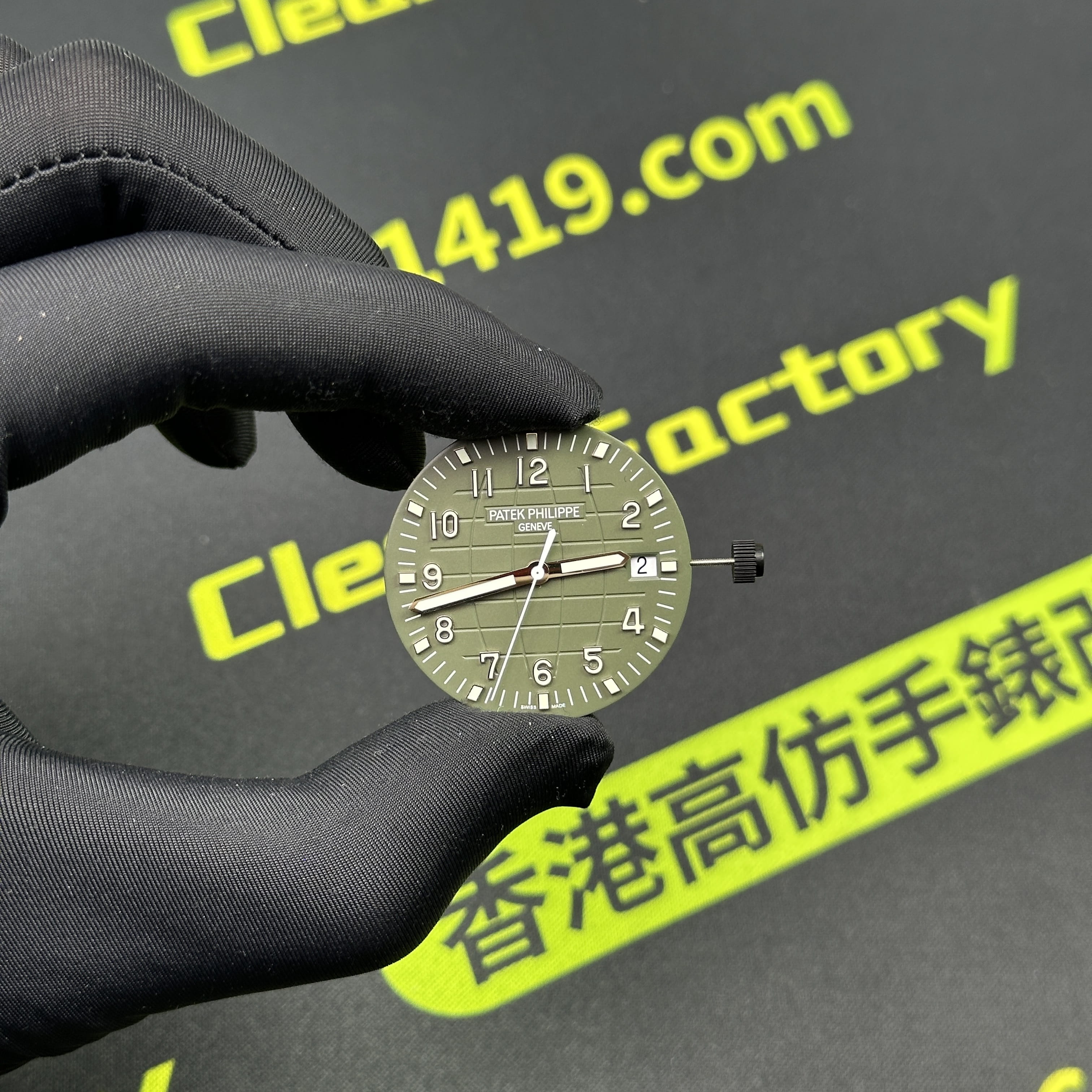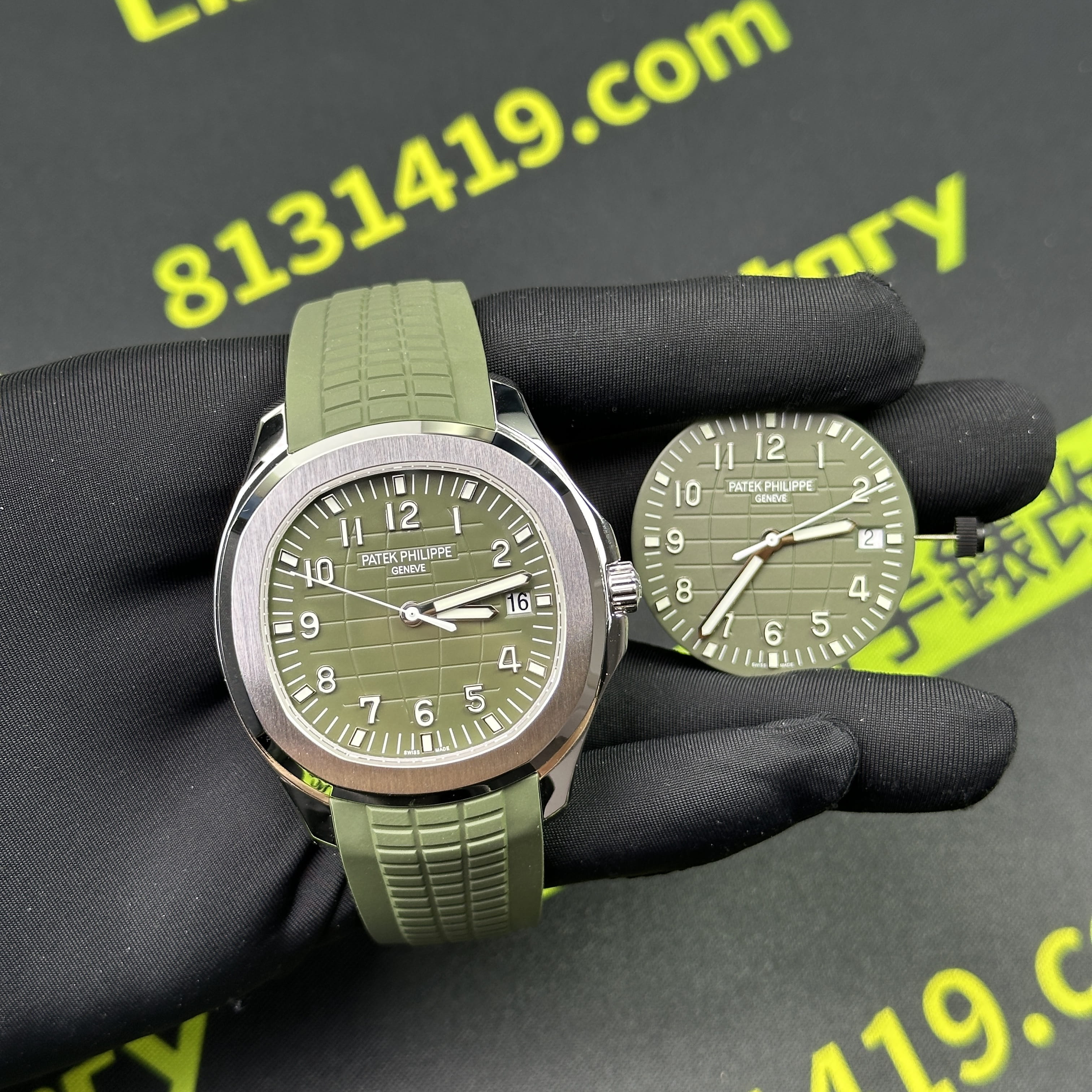 3K廠百達翡麗AQUANAUT系列5168G-010私人訂製滿配改裝升級案例,整錶尺寸42.2mm,3K廠綠手雷厚薄度做到了8.3mm,是通過原版1:1開模復刻而成,規格,尺寸方面基本上都是符合專櫃版本的結構要求!綠色的錶盤和綠色的橡膠錶帶其結構塑造的"手雷"紋理紋路均是統一版型.對於3K廠5168私人訂製綠手雷錶盤更換代用級別的盤面是針對原3K廠綠手雷對比專櫃版本存在明顯的色差!原3K廠5168G綠色盤面是深綠色,而原裝正品的盤面是橄欖綠色,兩者形成了鮮明色差對比.