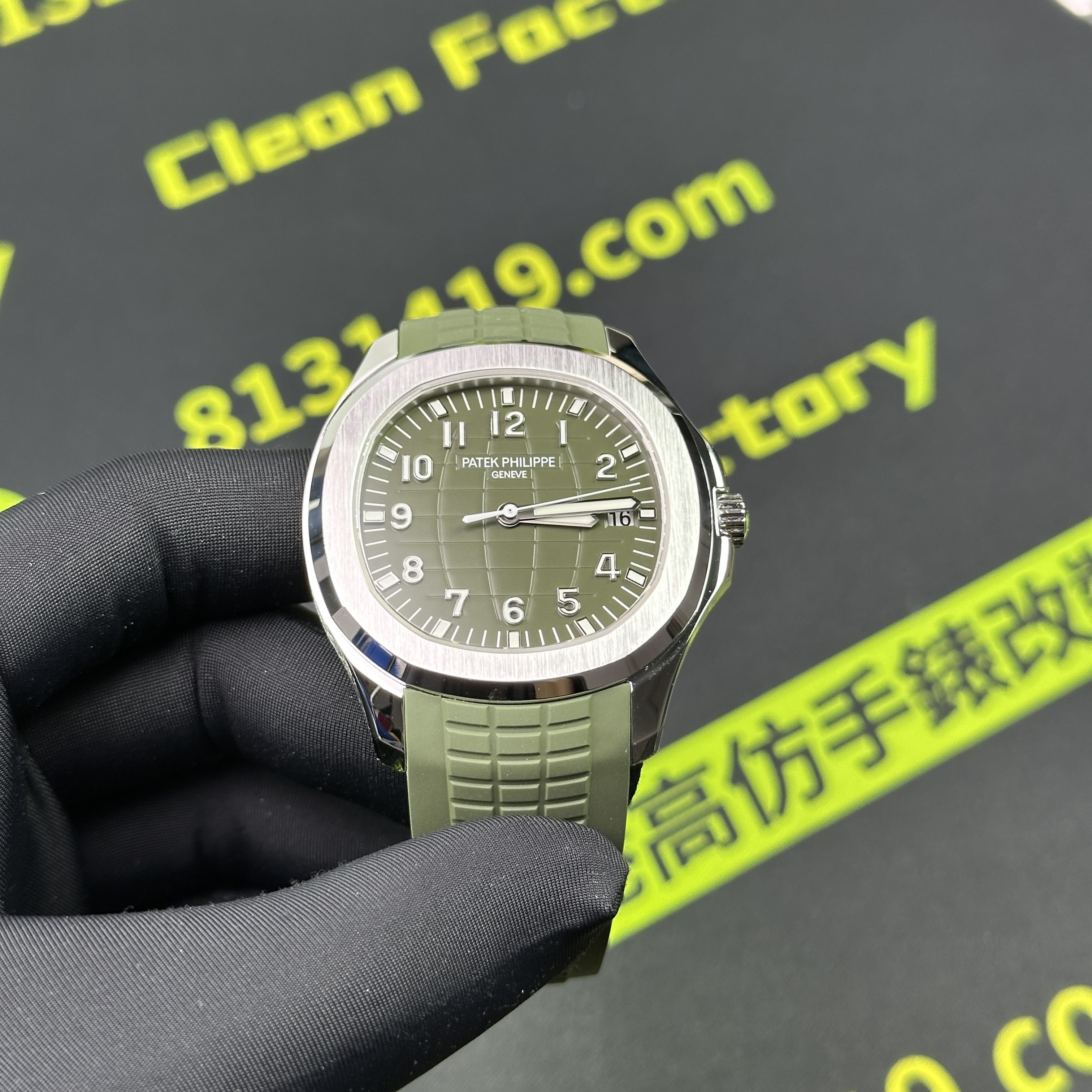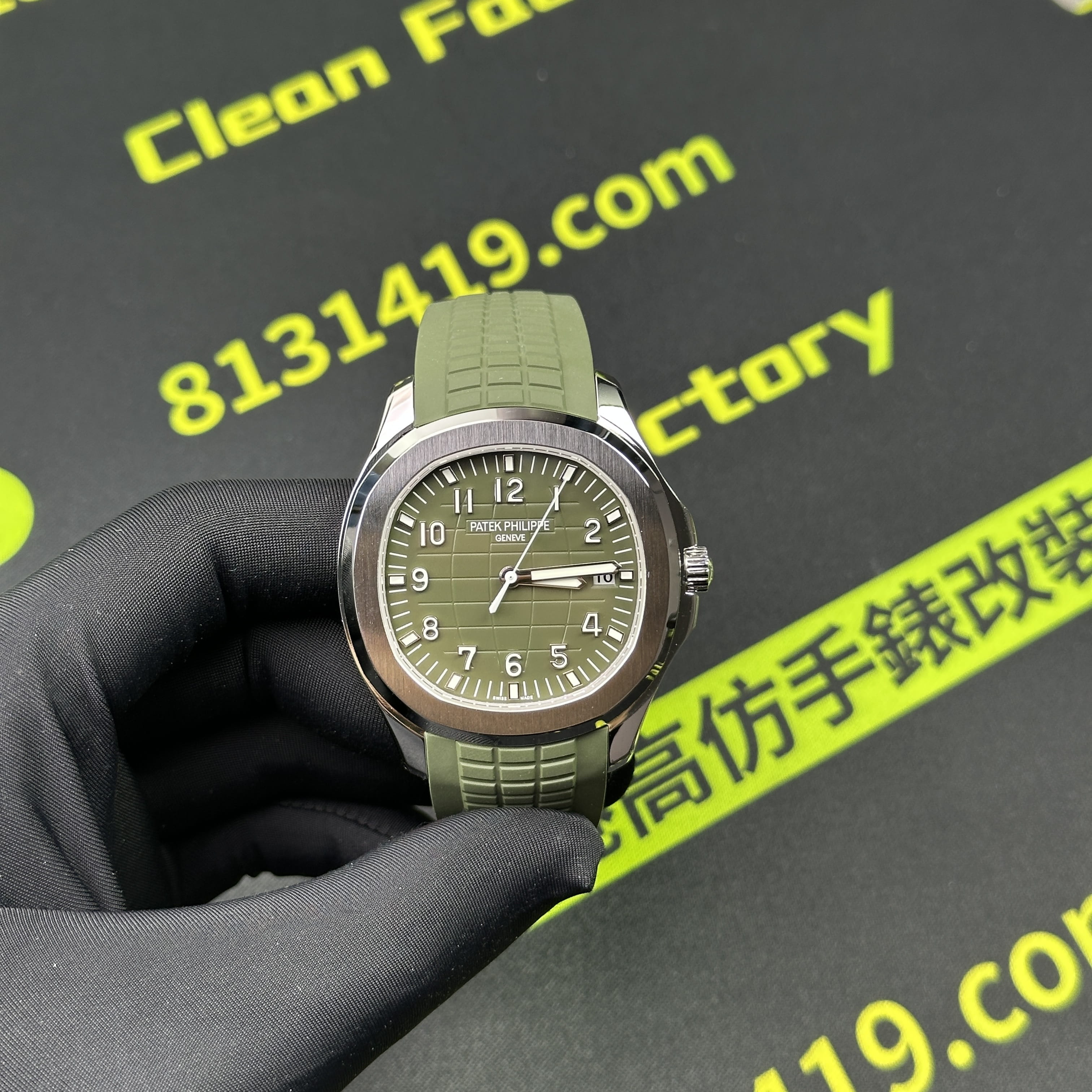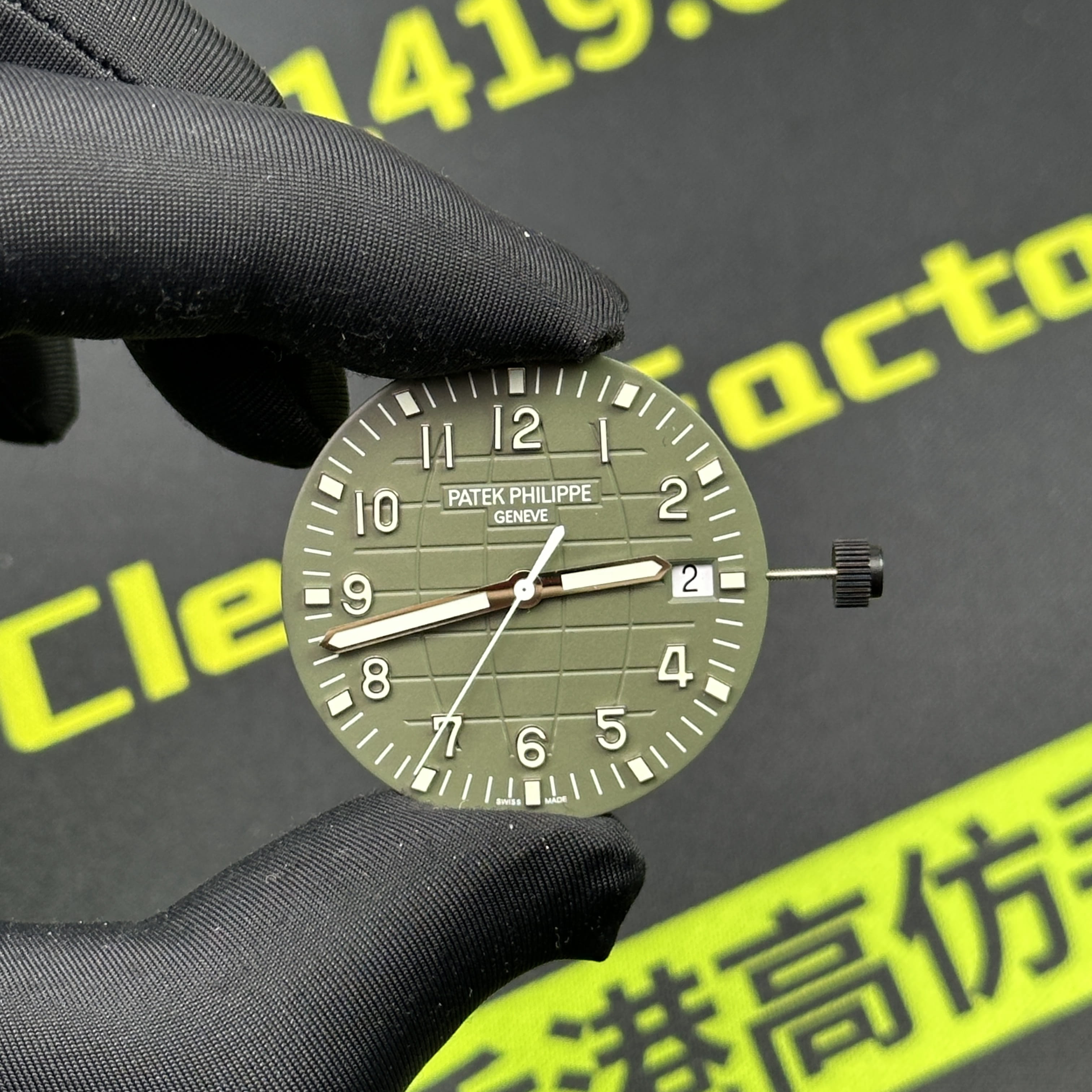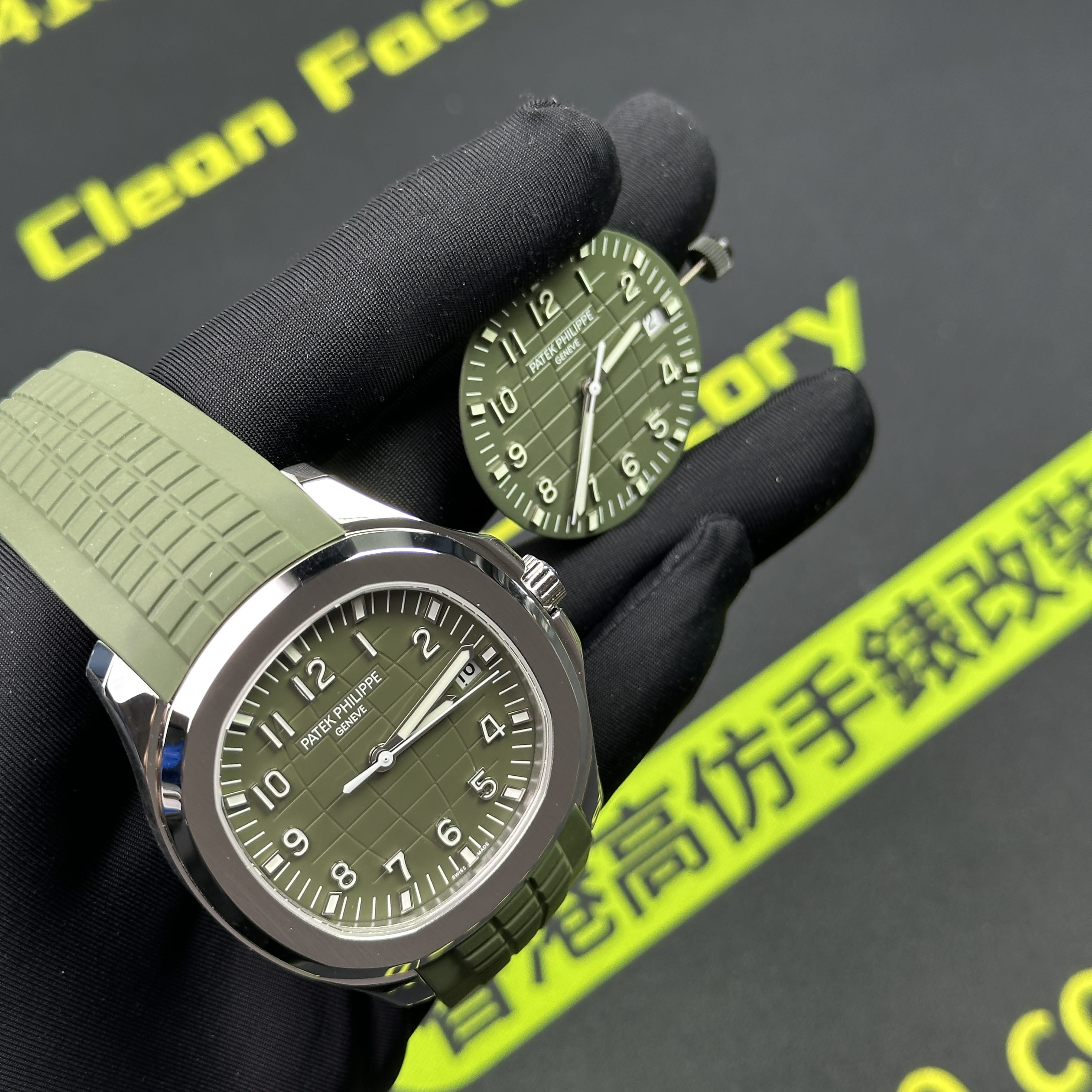 3K廠百達翡麗AQUANAUT系列5168G-010私人訂製滿配改裝升級案例,整錶尺寸42.2mm,3K廠綠手雷厚薄度做到了8.3mm,是通過原版1:1開模復刻而成,規格,尺寸方面基本上都是符合專櫃版本的結構要求!綠色的錶盤和綠色的橡膠錶帶其結構塑造的"手雷"紋理紋路均是統一版型.對於3K廠5168私人訂製綠手雷錶盤更換代用級別的盤面是針對原3K廠綠手雷對比專櫃版本存在明顯的色差!原3K廠5168G綠色盤面是深綠色,而原裝正品的盤面是橄欖綠色,兩者形成了鮮明色差對比.
