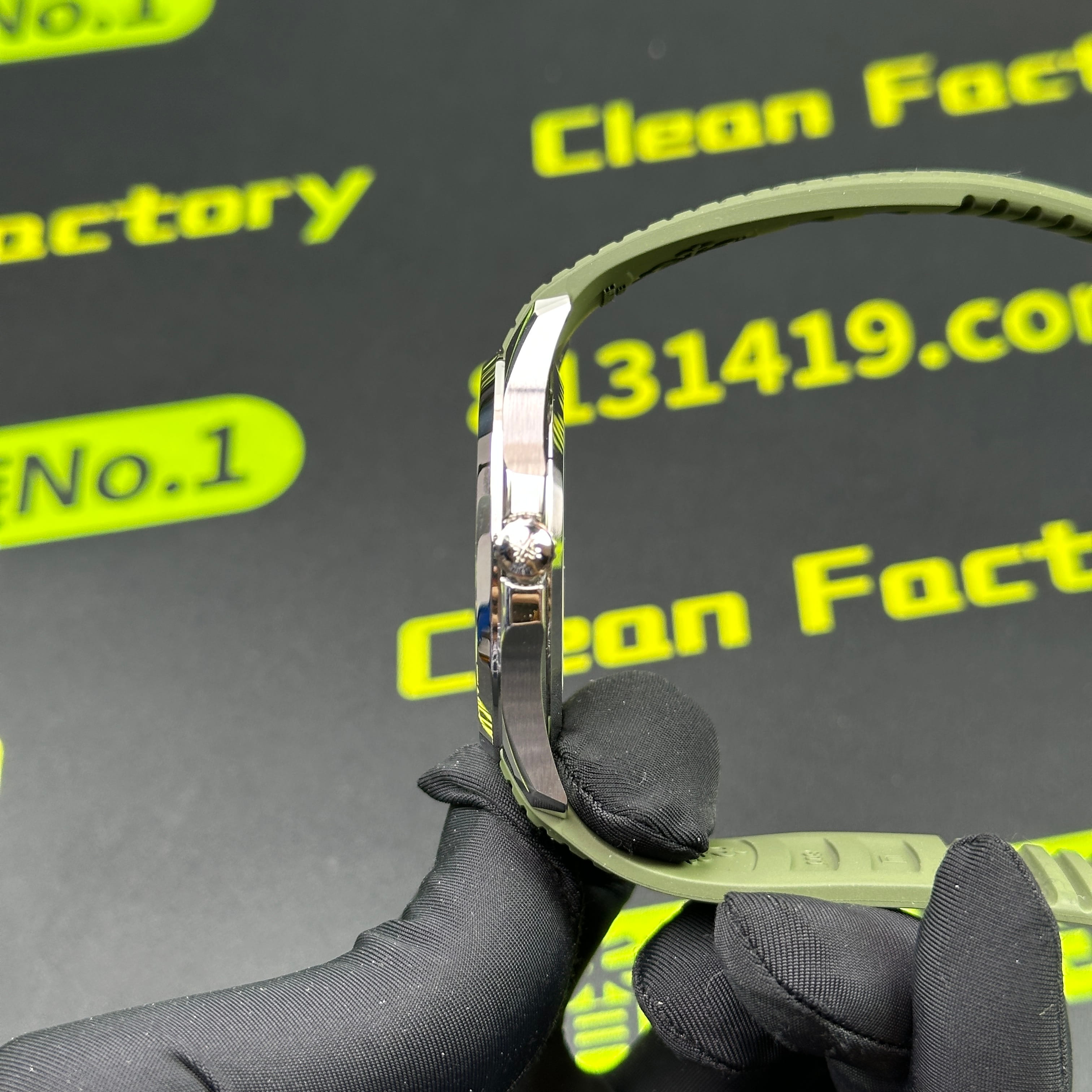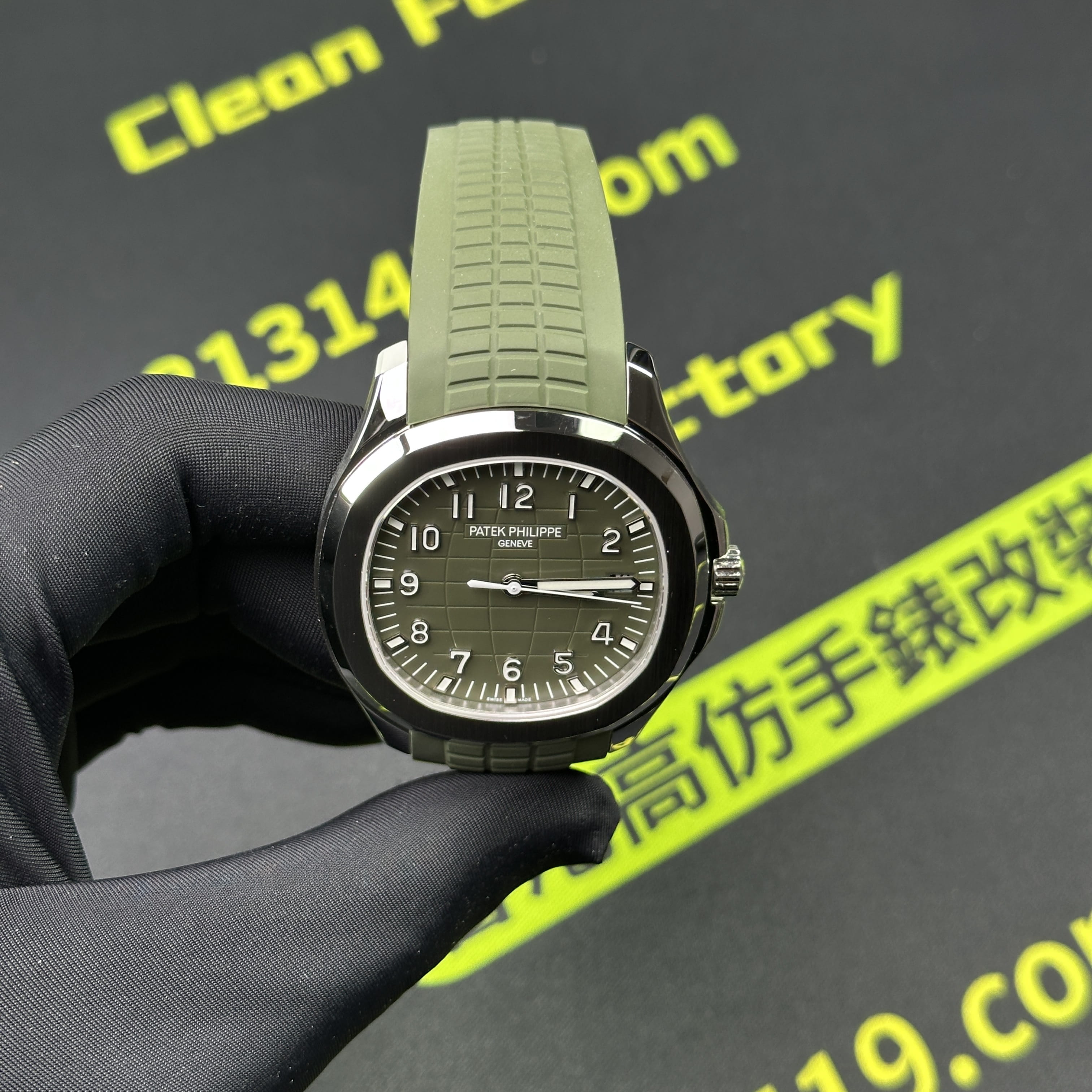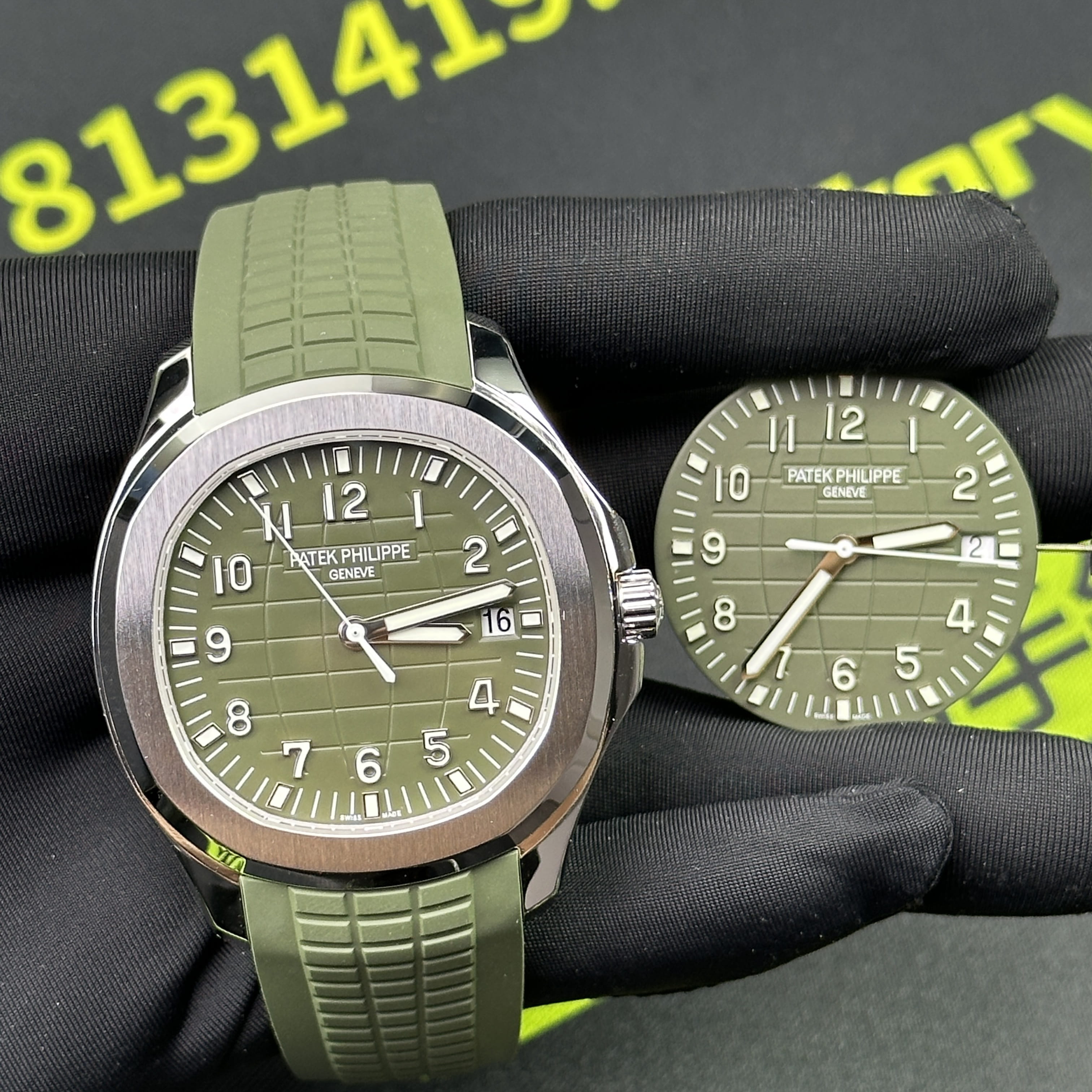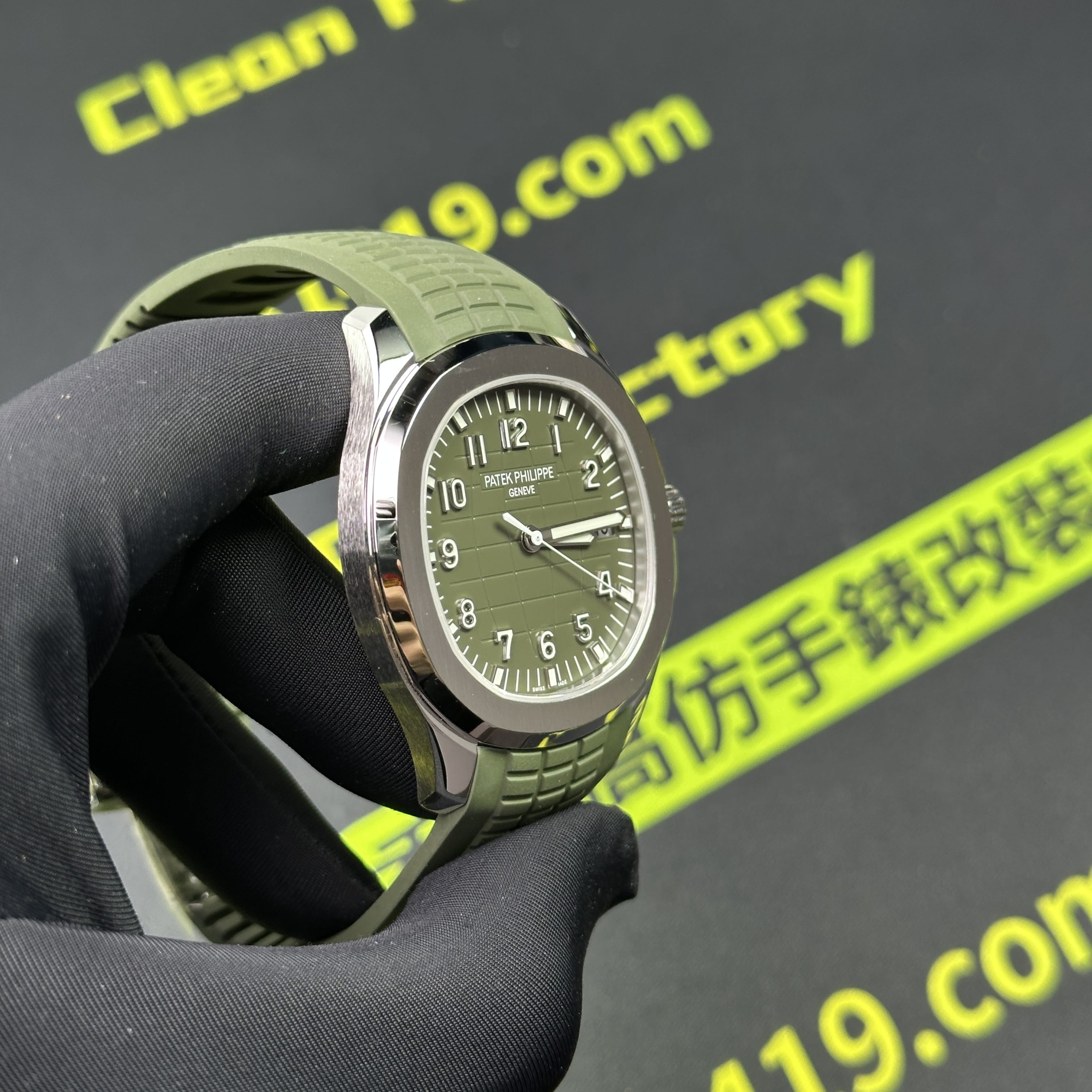 3K廠百達翡麗AQUANAUT系列5168G-010私人訂製滿配改裝升級案例,整錶尺寸42.2mm,3K廠綠手雷厚薄度做到了8.3mm,是通過原版1:1開模復刻而成,規格,尺寸方面基本上都是符合專櫃版本的結構要求!綠色的錶盤和綠色的橡膠錶帶其結構塑造的"手雷"紋理紋路均是統一版型.對於3K廠5168私人訂製綠手雷錶盤更換代用級別的盤面是針對原3K廠綠手雷對比專櫃版本存在明顯的色差!原3K廠5168G綠色盤面是深綠色,而原裝正品的盤面是橄欖綠色,兩者形成了鮮明色差對比.
