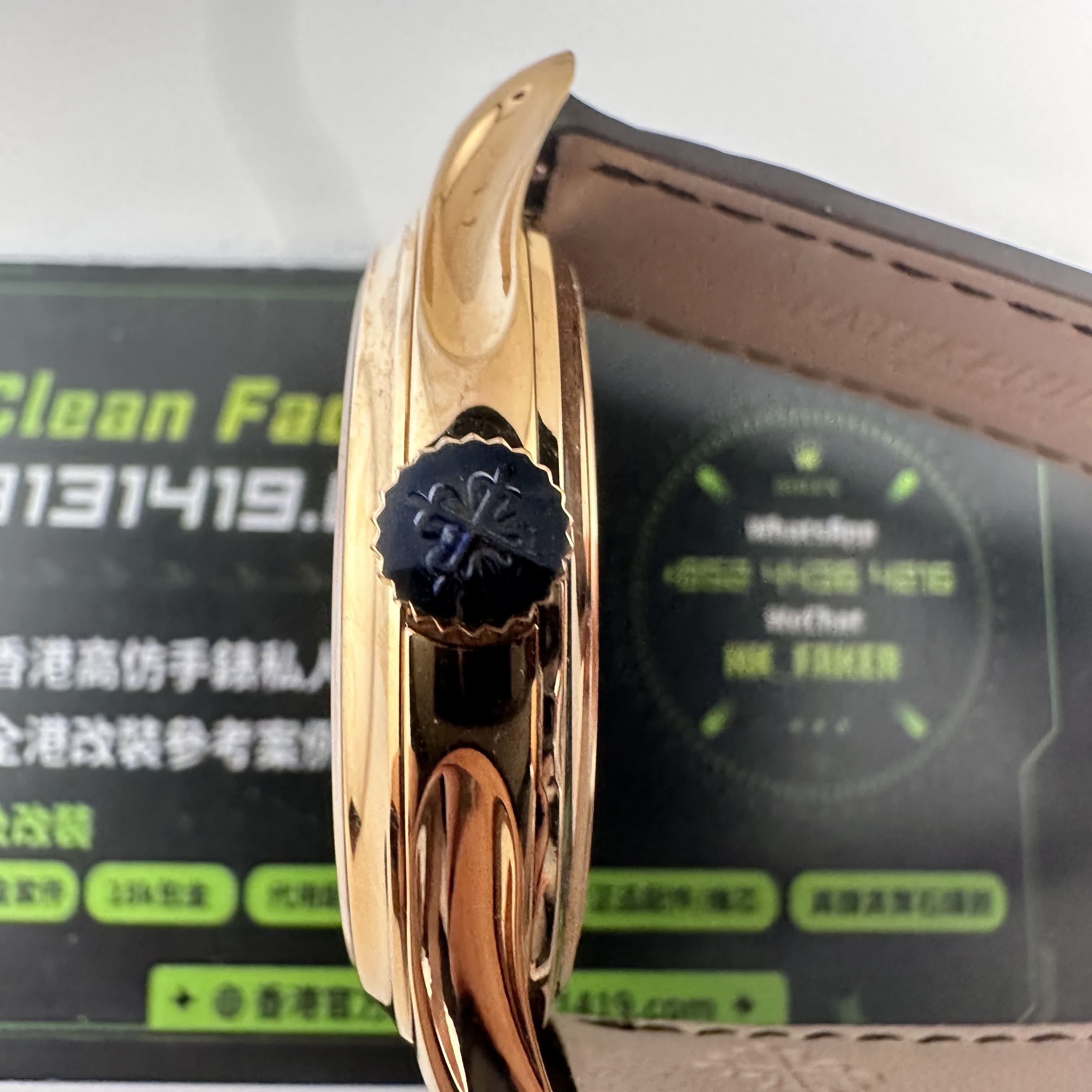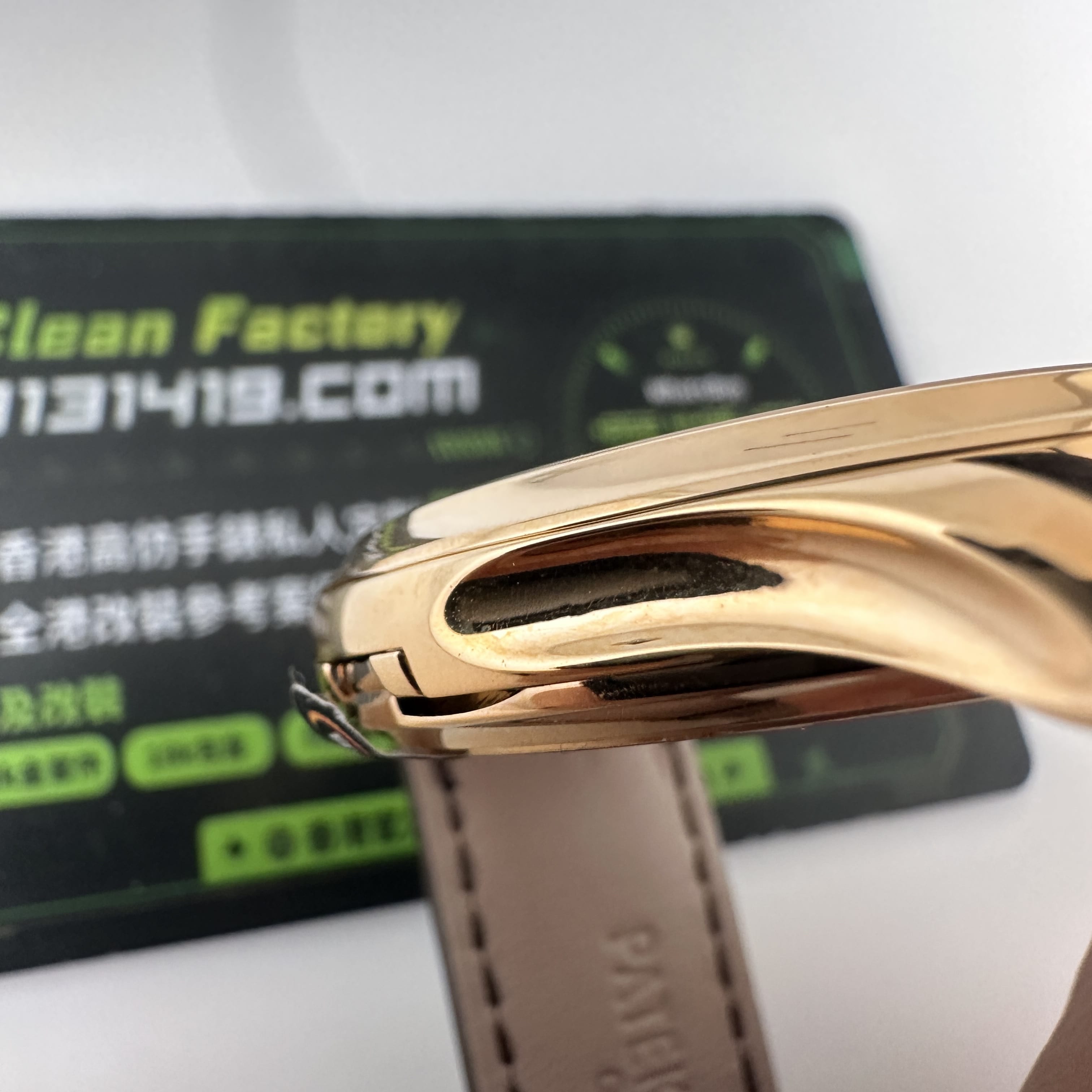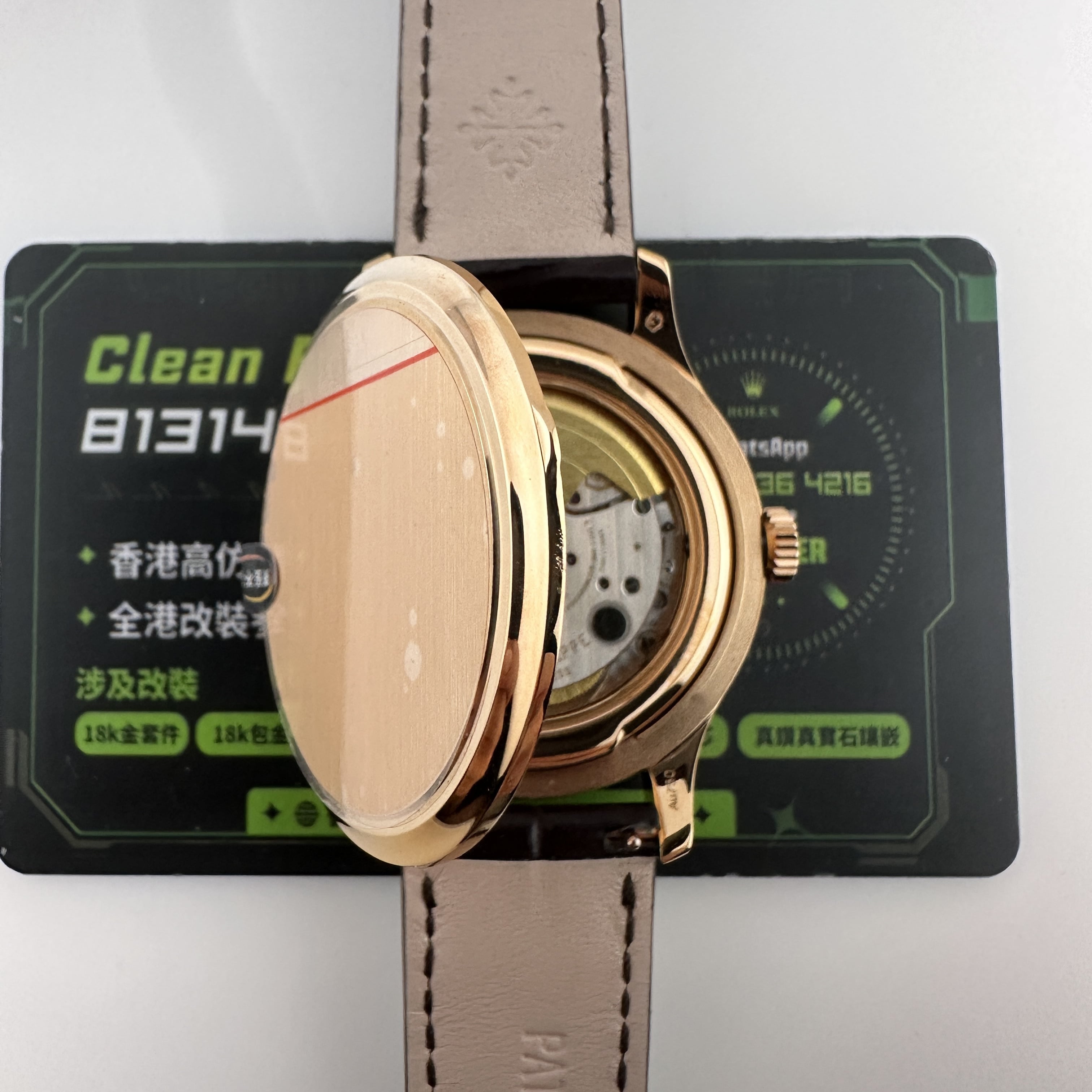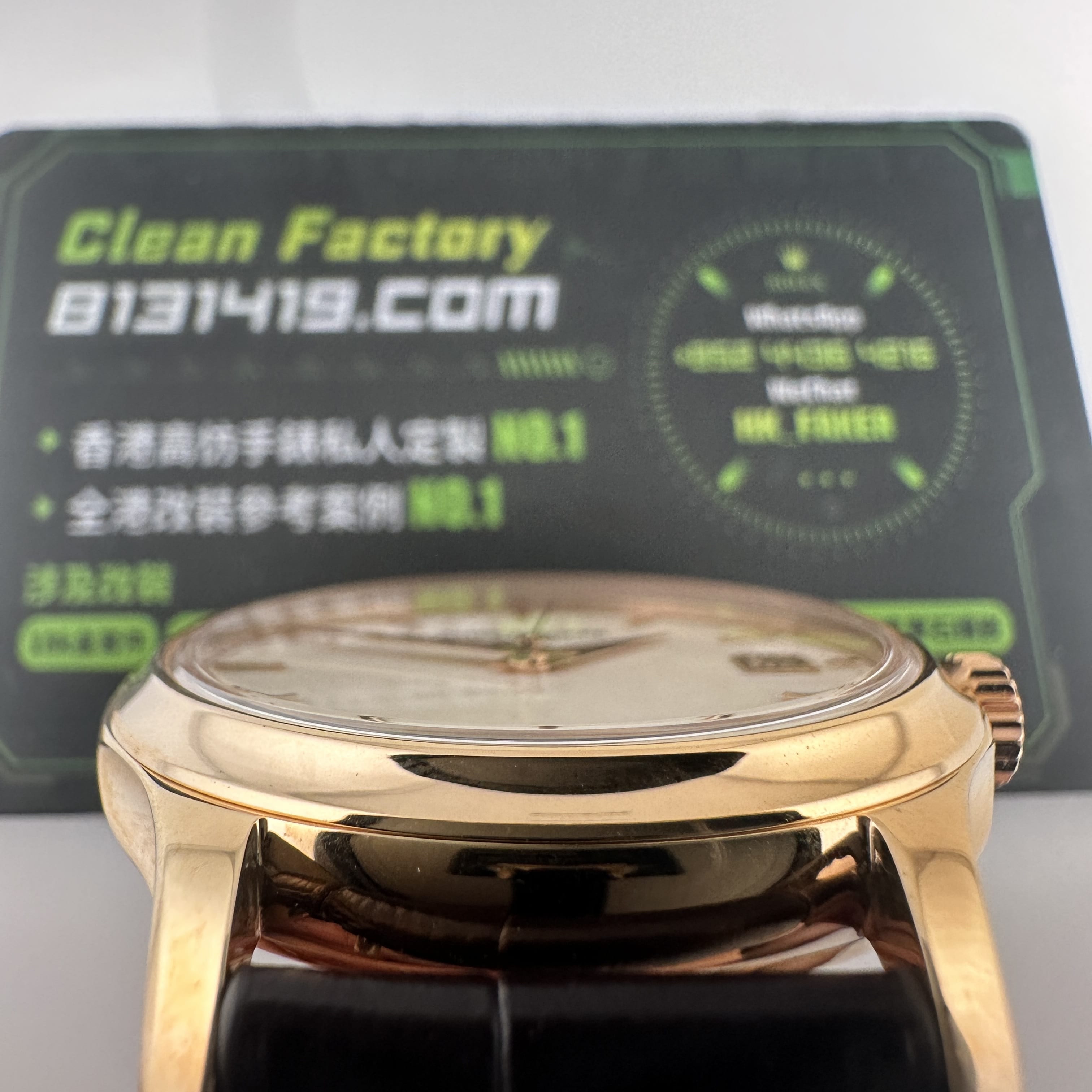 錶盤呈現米白,並非全白色效果,由於古典錶並未涉及到夜光塗層,盤面時間辨識是通過金屬條丁構造而成.每一個條丁3K廠PP5227均是獨立打磨,拋光,做到質感同步原版一致.其次是盤面並未涉及到複雜的功能,調校時間以及日曆.印刷字面居中,雙數單數都是符合原版品質需求.最後則是底蓋部分3K廠古典錶同步原版一致配置將軍蓋,精度神似一面鏡子,同時可以看到背透式的Cal.324機芯.
