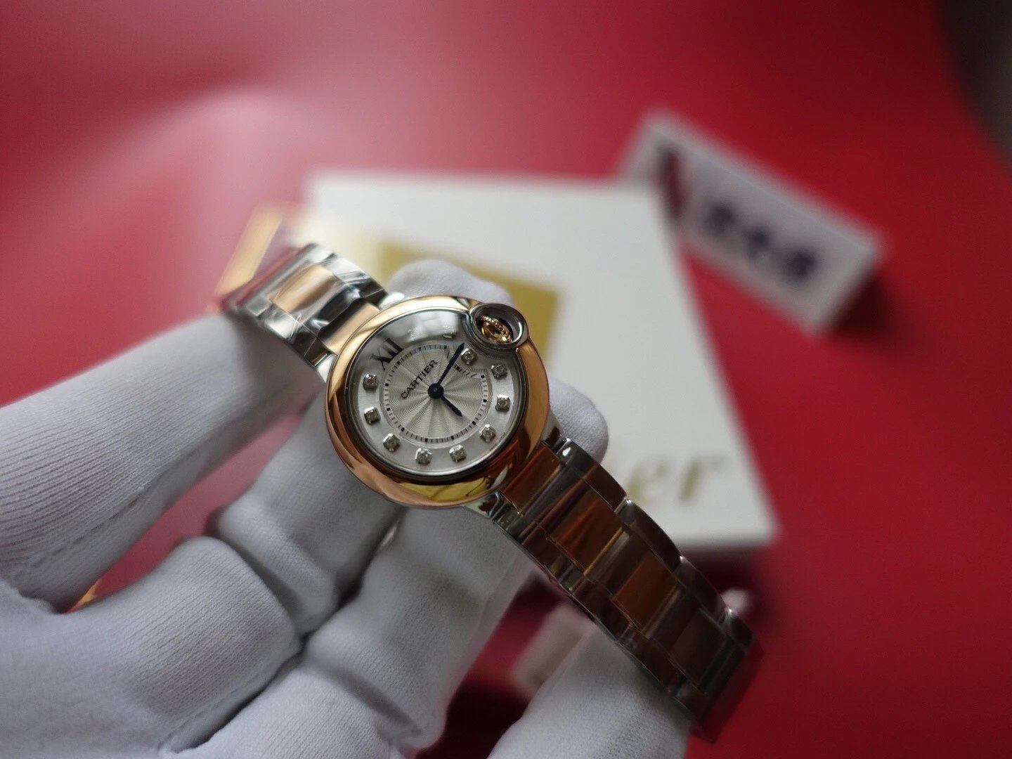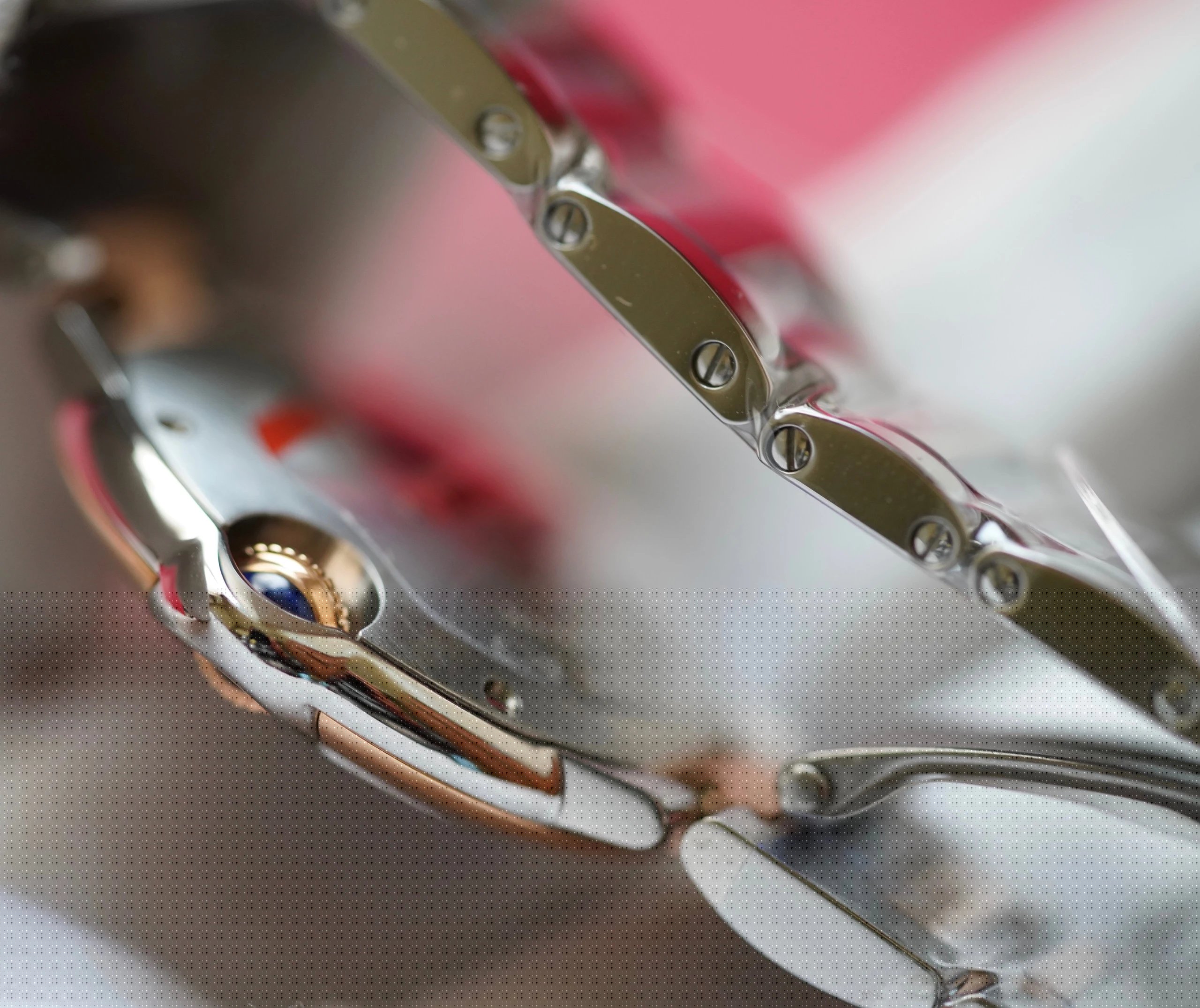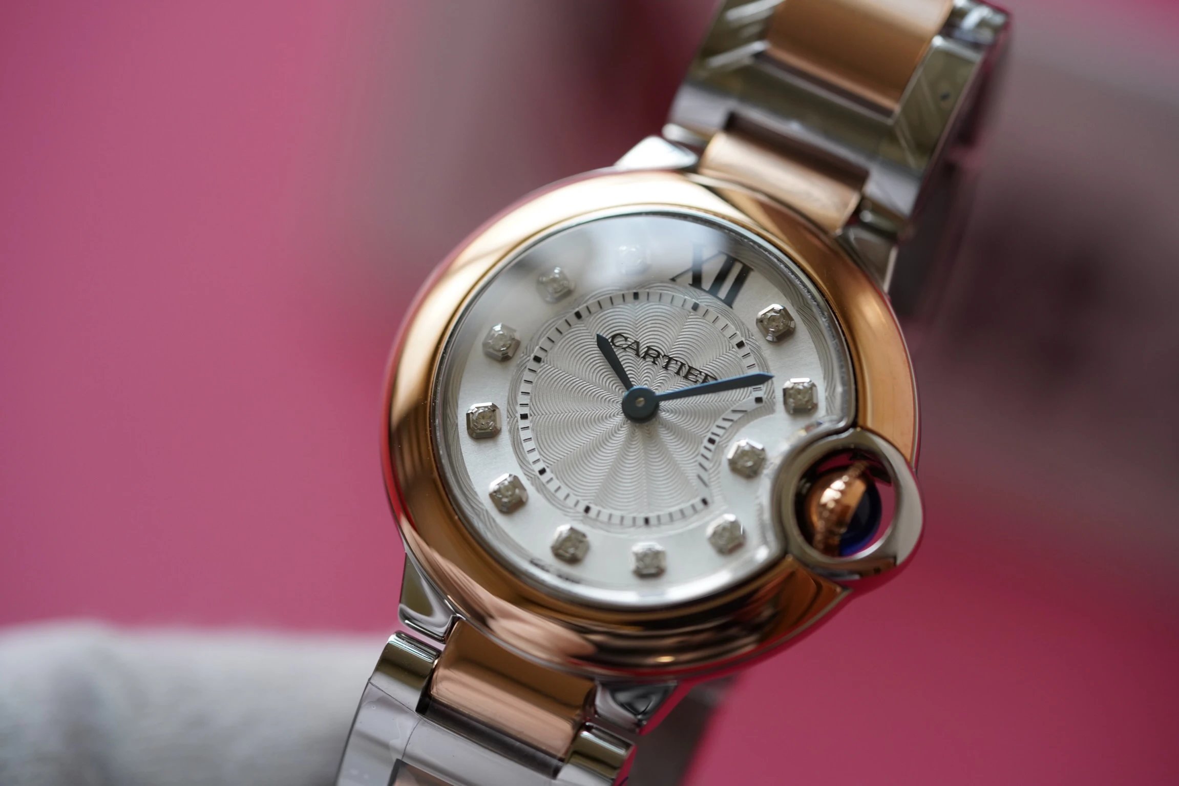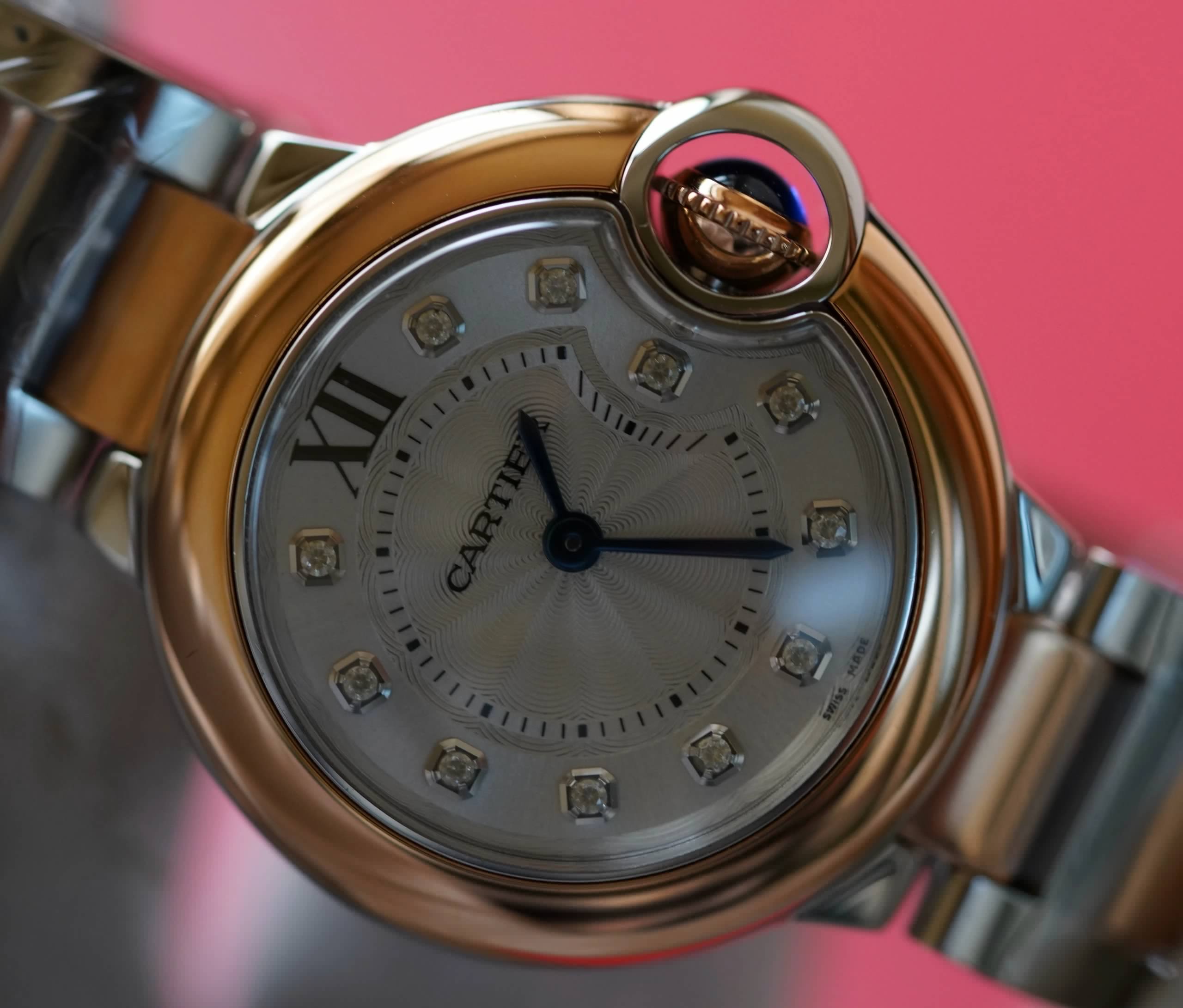 表殼鏡面:V6廠卡地亞藍氣球V5版本的鏡面一樣採用藍寶石鏡面,這一點在目前的複刻表上已經得到廣泛的應用,原因在於藍寶石鏡面具有極高的通透性,以及僅次於鑽石的硬度,耐磨耐劃的性能沒的說。這裏要強調的是,藍寶石鏡面的魚眼紋效果也是極高的還原了原裝。