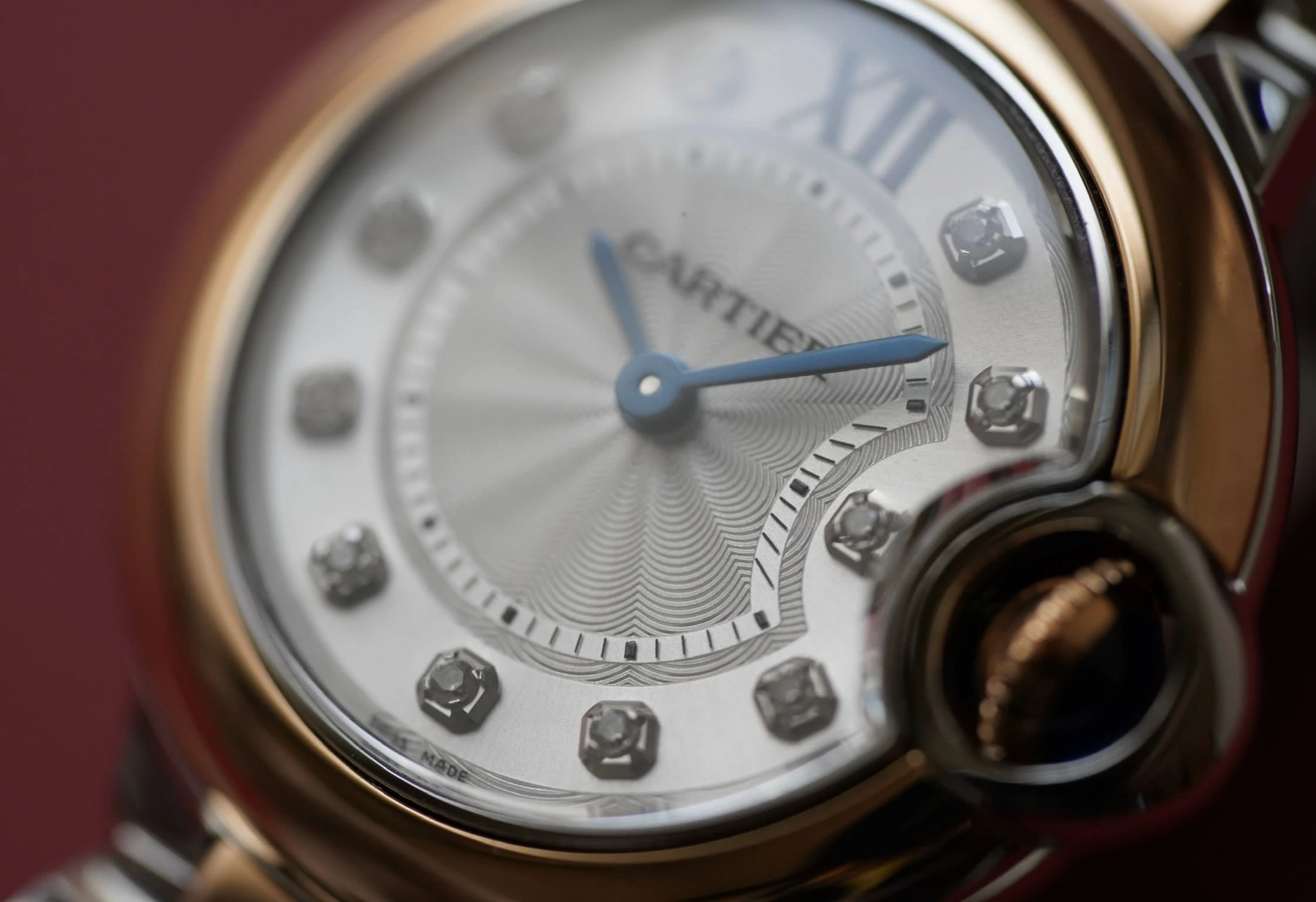 盤面做工:可以非常清晰的看到字面,羅馬數字刻度使用的是油壓工藝,刻度飽滿,清晰、黑亮、凸起的、立體感非常贊!所有的刻度,都沒有任何位置的偏差。這最能考察藍氣球的印刷水準了,工藝水準非常高!