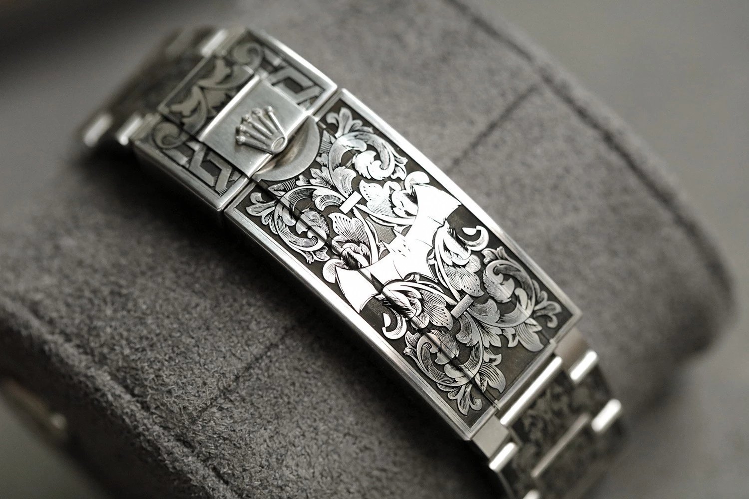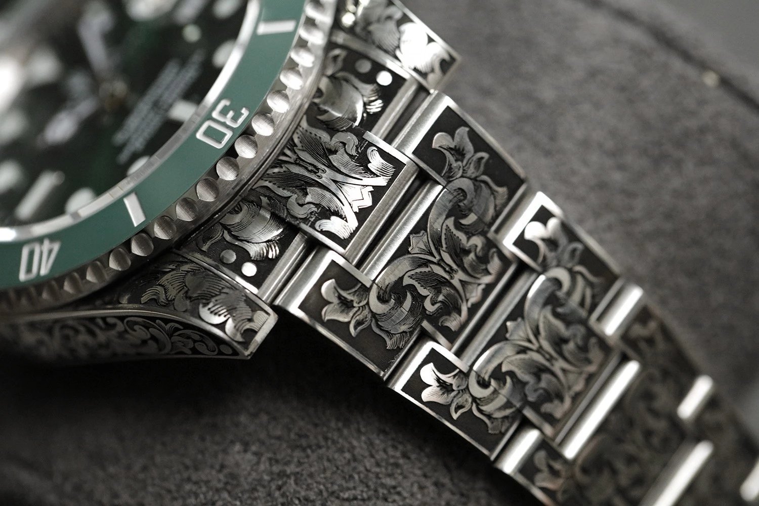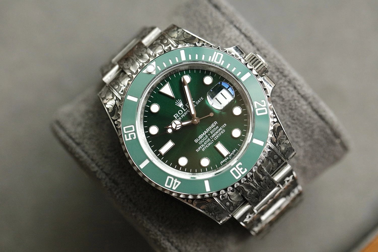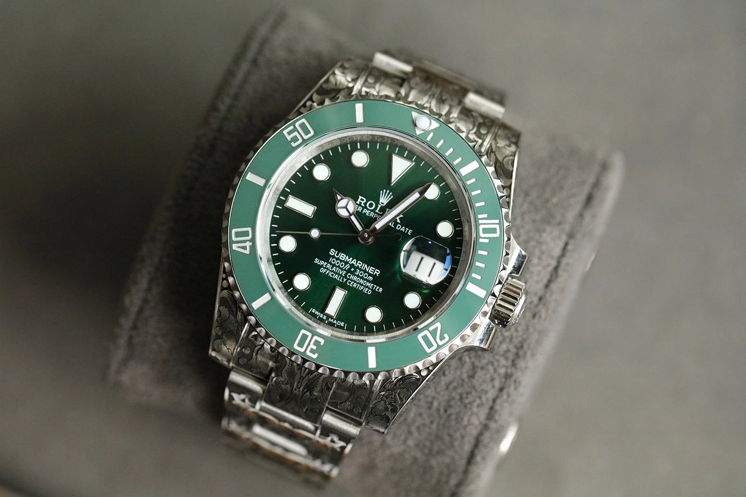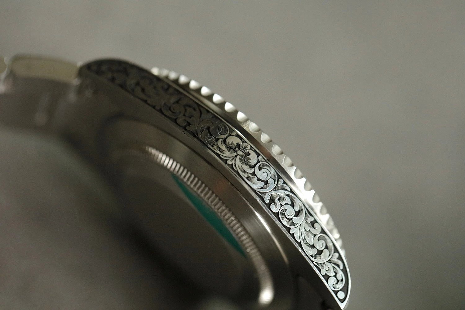 玩到極致是一種什麼樣的體驗 勞力士 經典水鬼與手工雕金工藝相結合,多少玩家夢寐以求的手錶紋身,今天!它來了。整表採用904L精鋼材質,搭載V13 3135機芯,持續動能72小時。藍寶石鏡面加(翠綠 亮黑)陶瓷圈點綴白金刻度。所有配件可原廠互換。整表手工雕刻唐草為主的精美圖案,精緻立體,鬼斧神工。產量極少,接受預訂