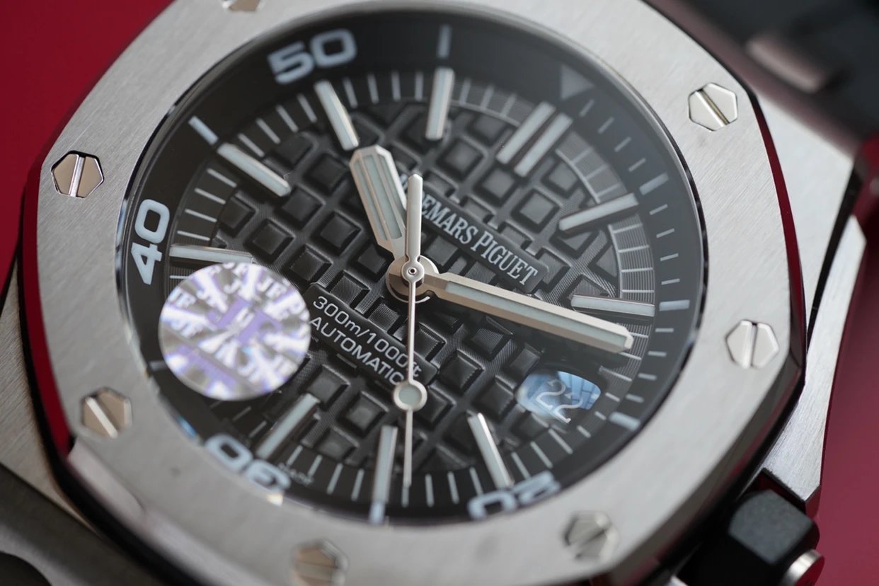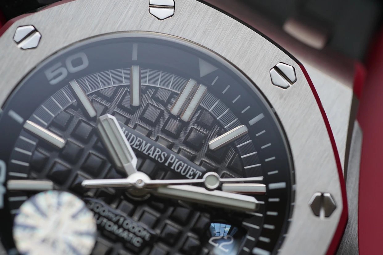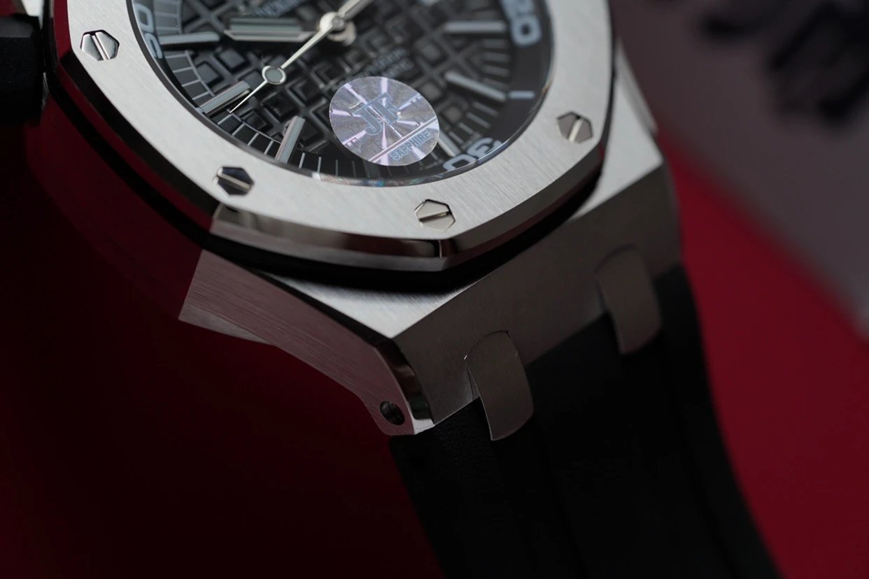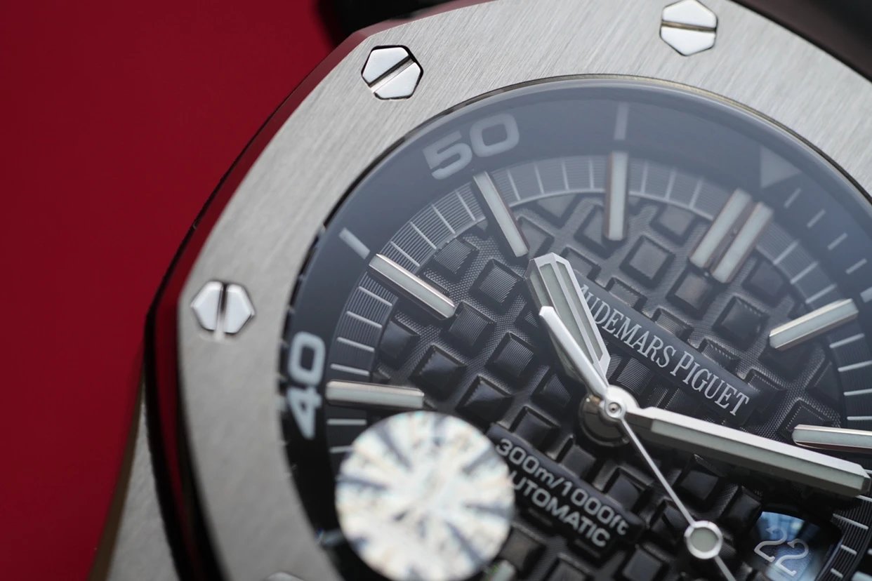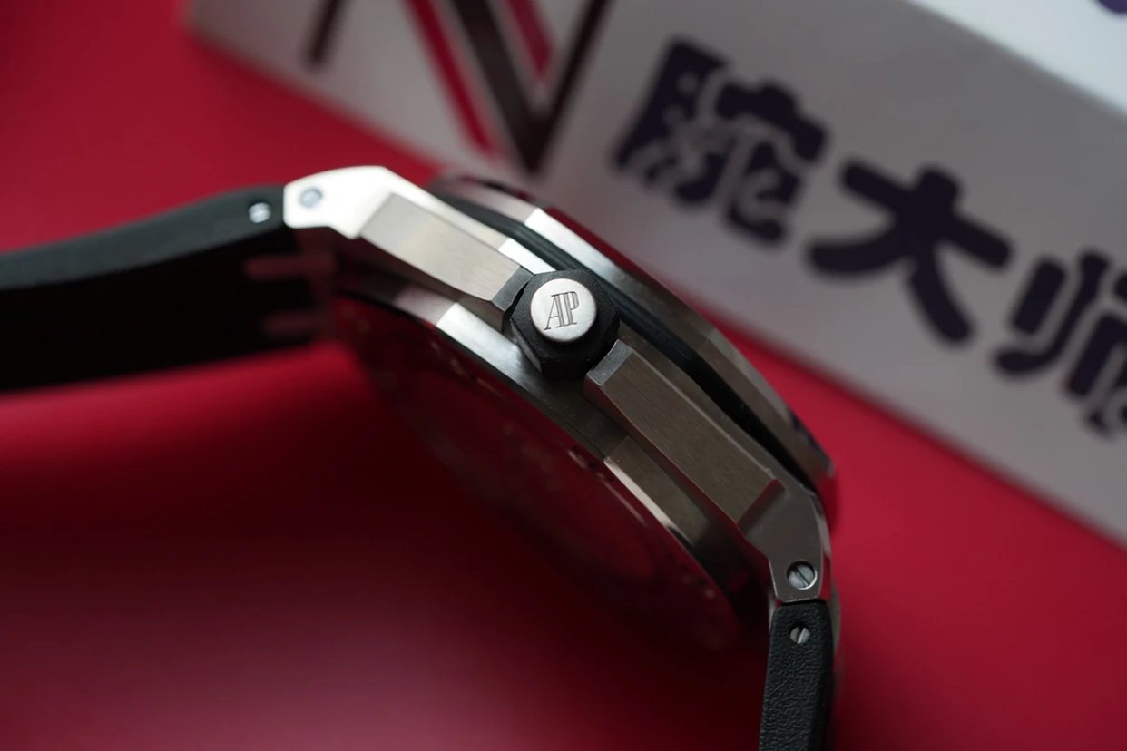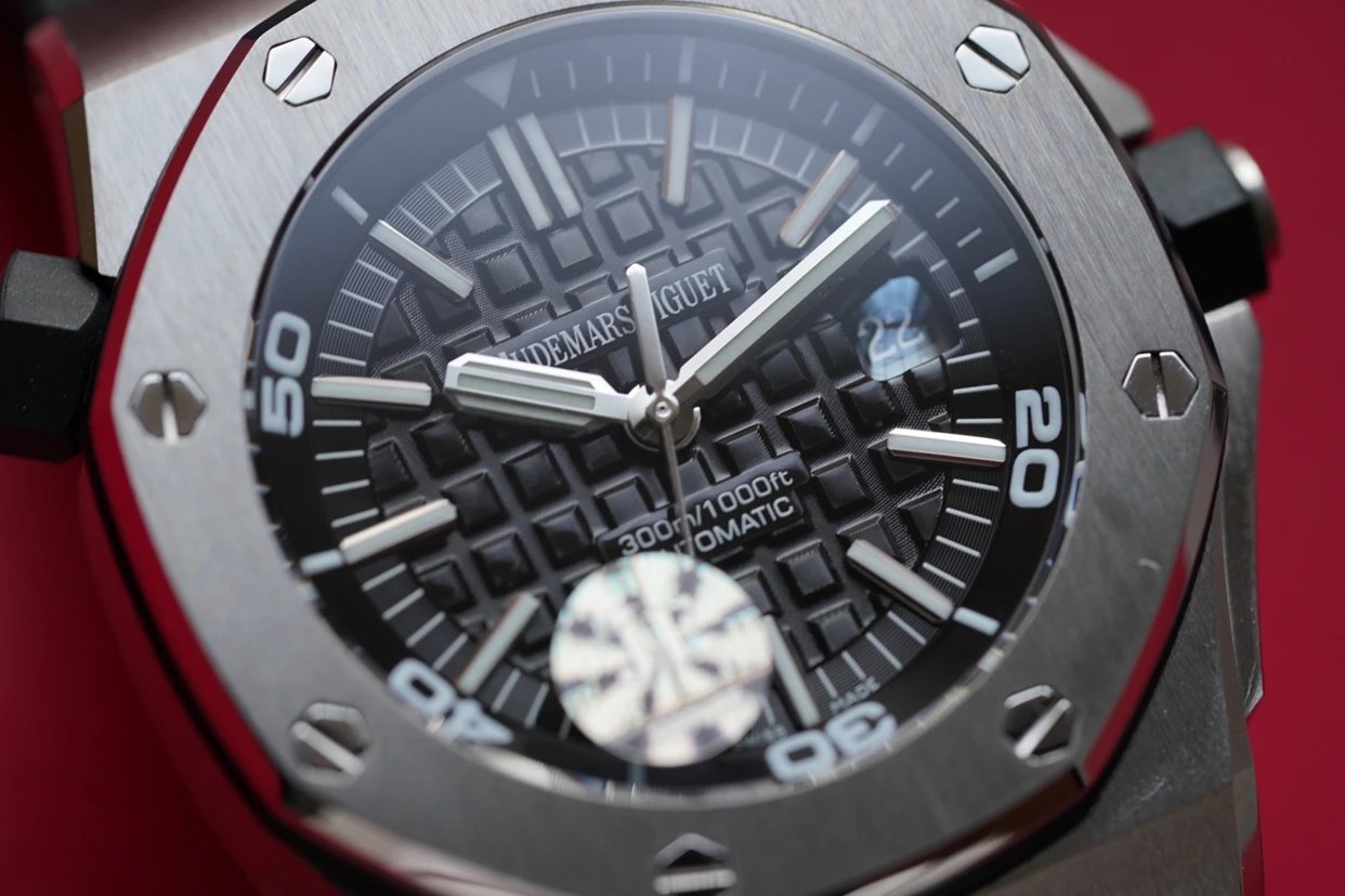 三點鐘方向設有日曆窗口,此次升級了與原裝一致的經典日曆字體。並且日曆的防炫目藍膜效果非常的強勁,無論在哪個角度都能清晰的讀取日曆時間。黑色的錶盤簡約而不簡單,採用的是愛彼獨有的大格紋裝飾。細心的你應該也看到了,在錶盤的外圈還有一個表圈,這是愛彼內置的潛水表圈,通過10點位把頭控制。