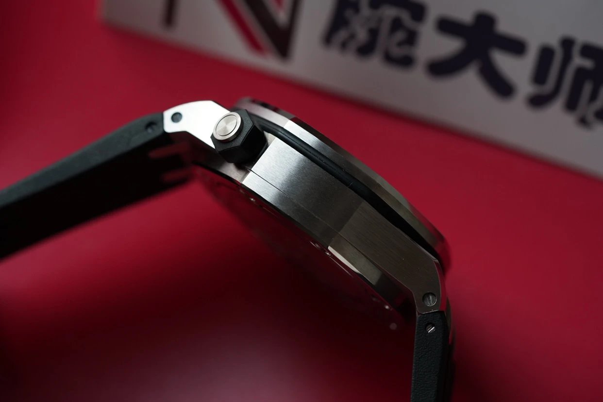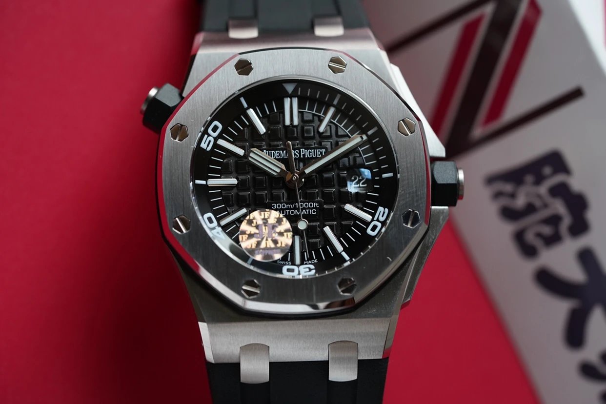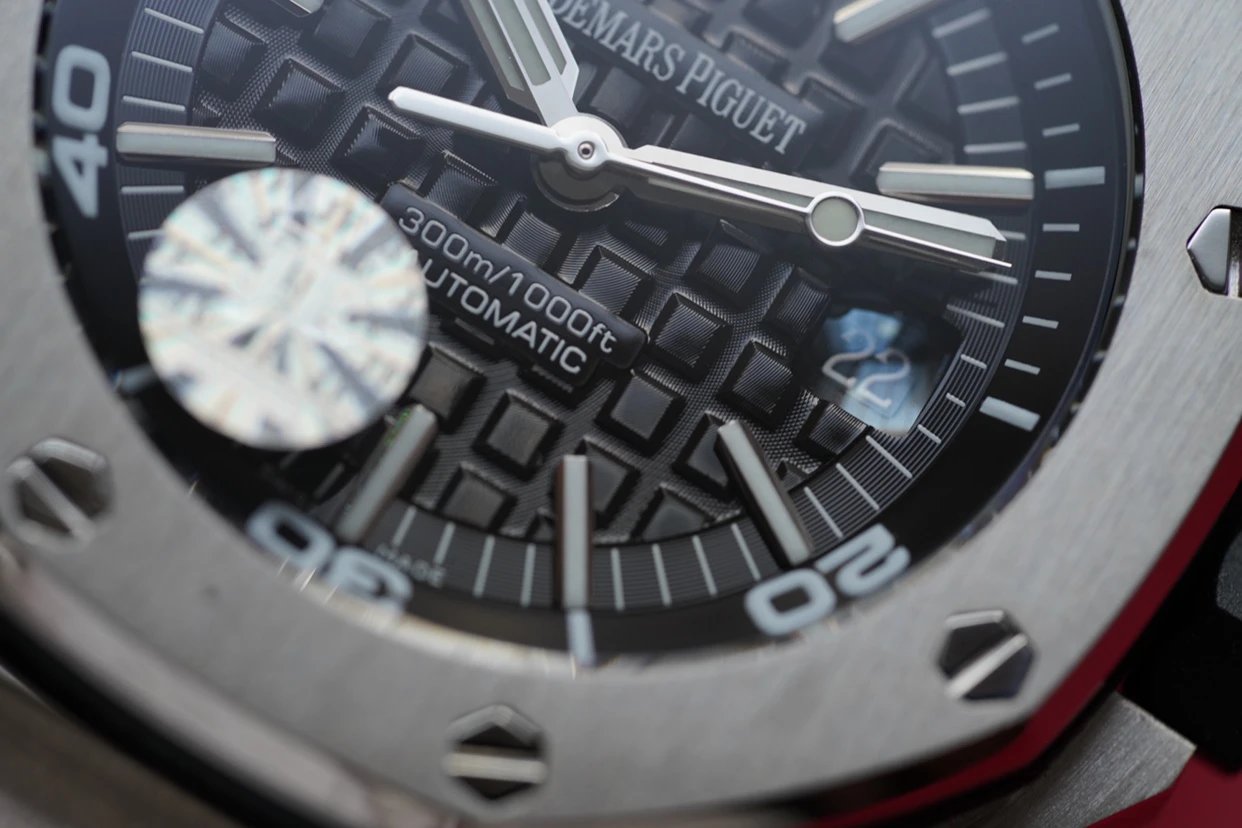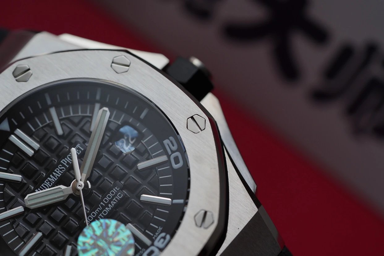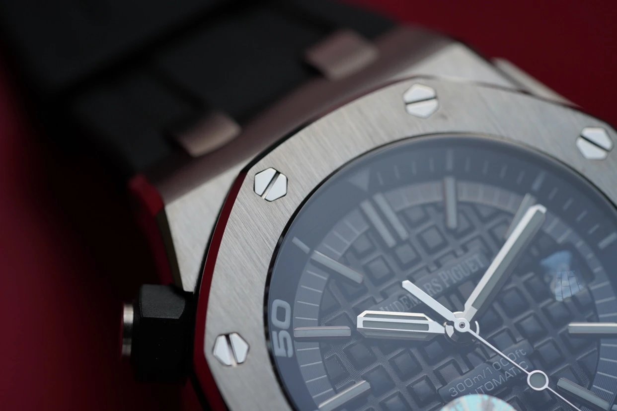 三點鐘方向設有日曆窗口,此次升級了與原裝一致的經典日曆字體。並且日曆的防炫目藍膜效果非常的強勁,無論在哪個角度都能清晰的讀取日曆時間。黑色的錶盤簡約而不簡單,採用的是愛彼獨有的大格紋裝飾。細心的你應該也看到了,在錶盤的外圈還有一個表圈,這是愛彼內置的潛水表圈,通過10點位把頭控制。