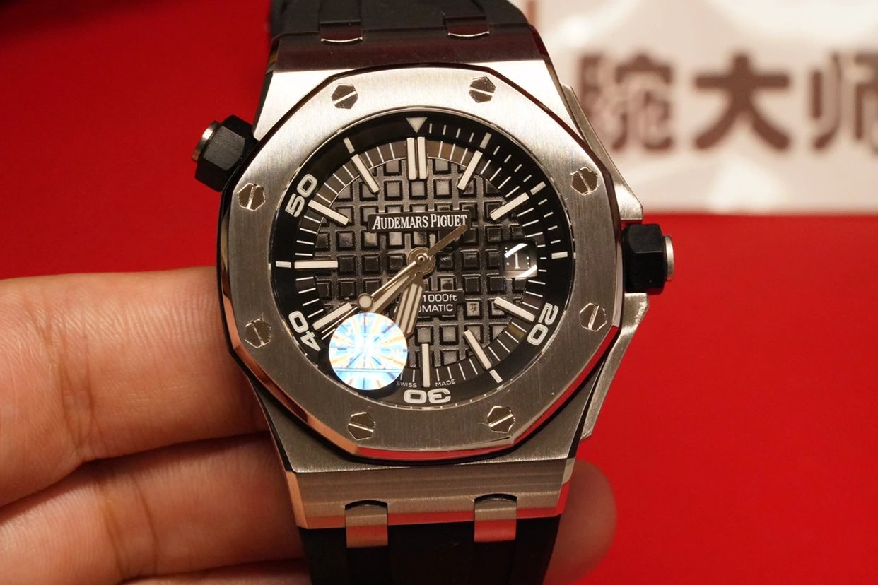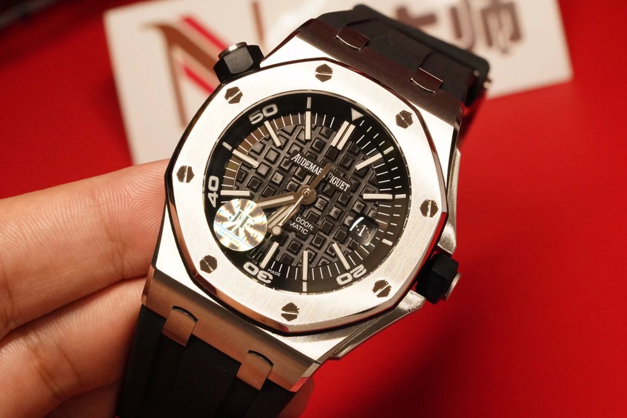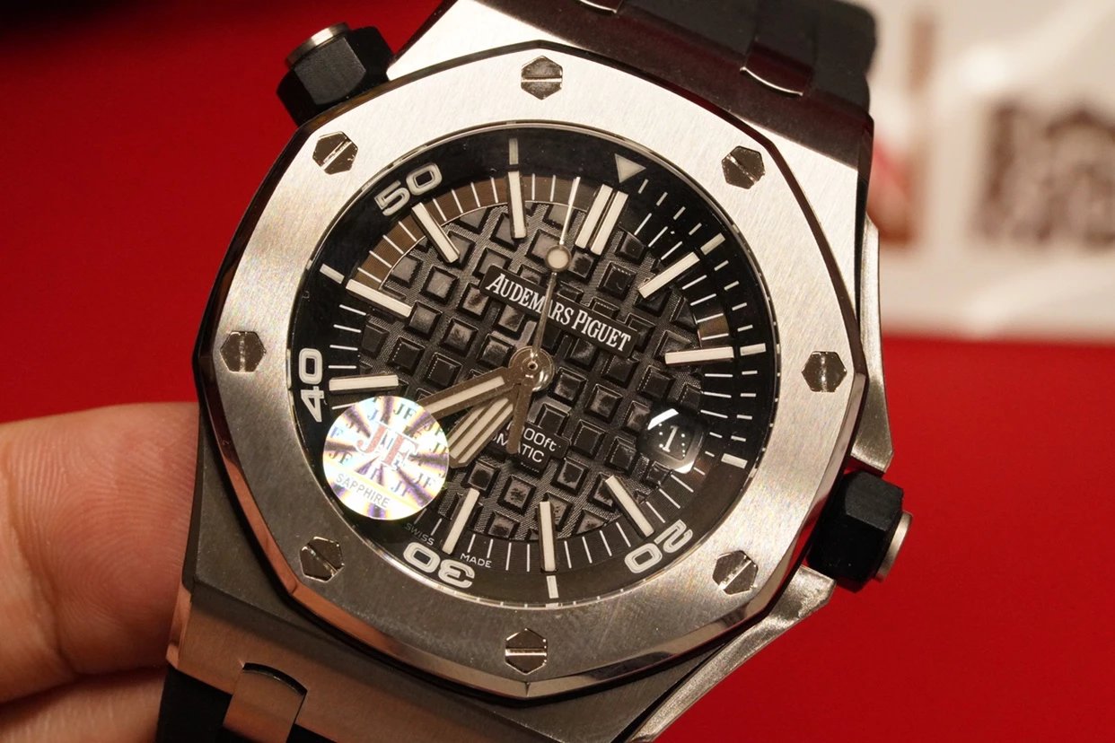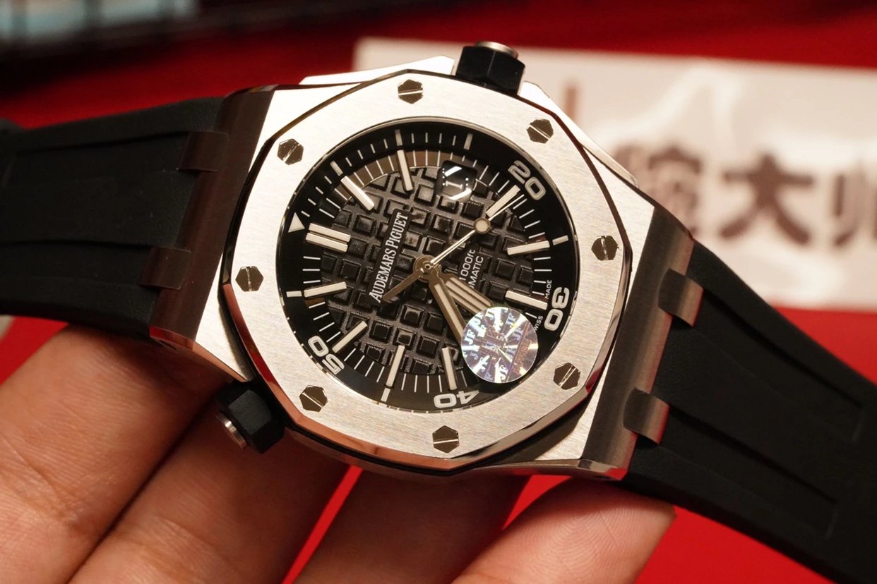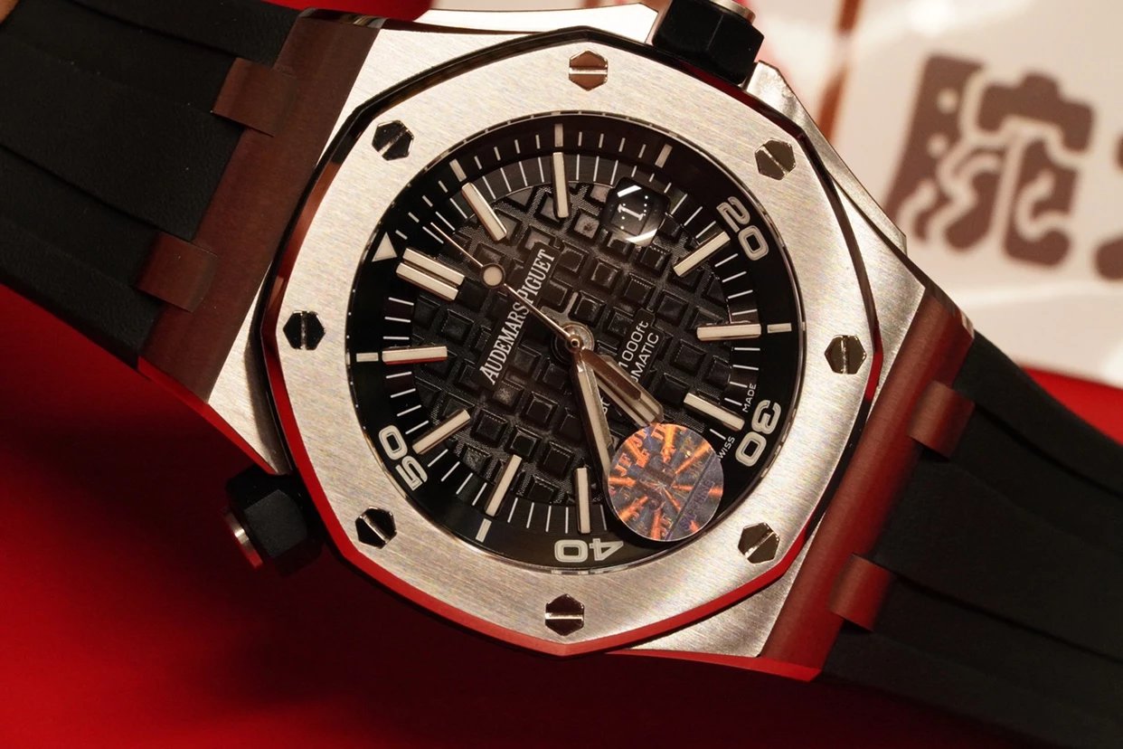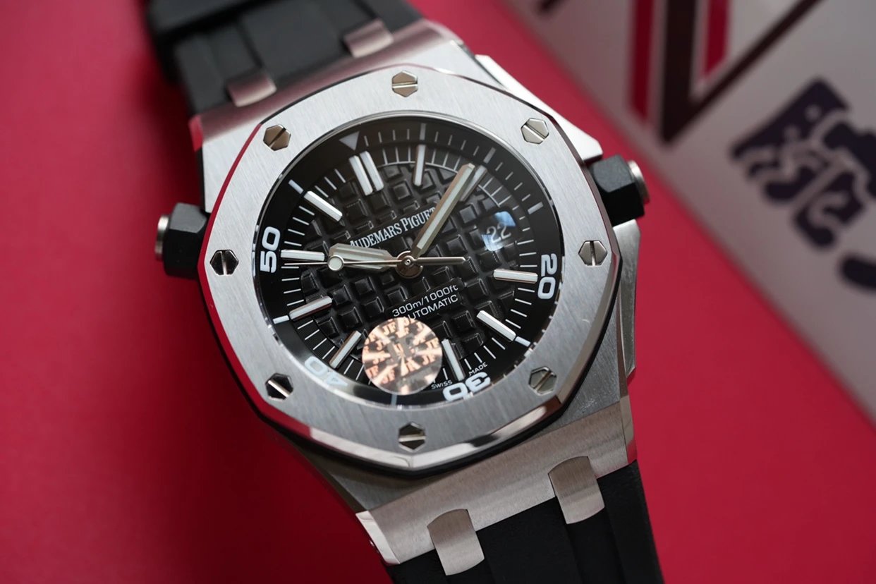 三點鐘方向設有日曆窗口,此次升級了與原裝一致的經典日曆字體。並且日曆的防炫目藍膜效果非常的強勁,無論在哪個角度都能清晰的讀取日曆時間。黑色的錶盤簡約而不簡單,採用的是愛彼獨有的大格紋裝飾。細心的你應該也看到了,在錶盤的外圈還有一個表圈,這是愛彼內置的潛水表圈,通過10點位把頭控制。