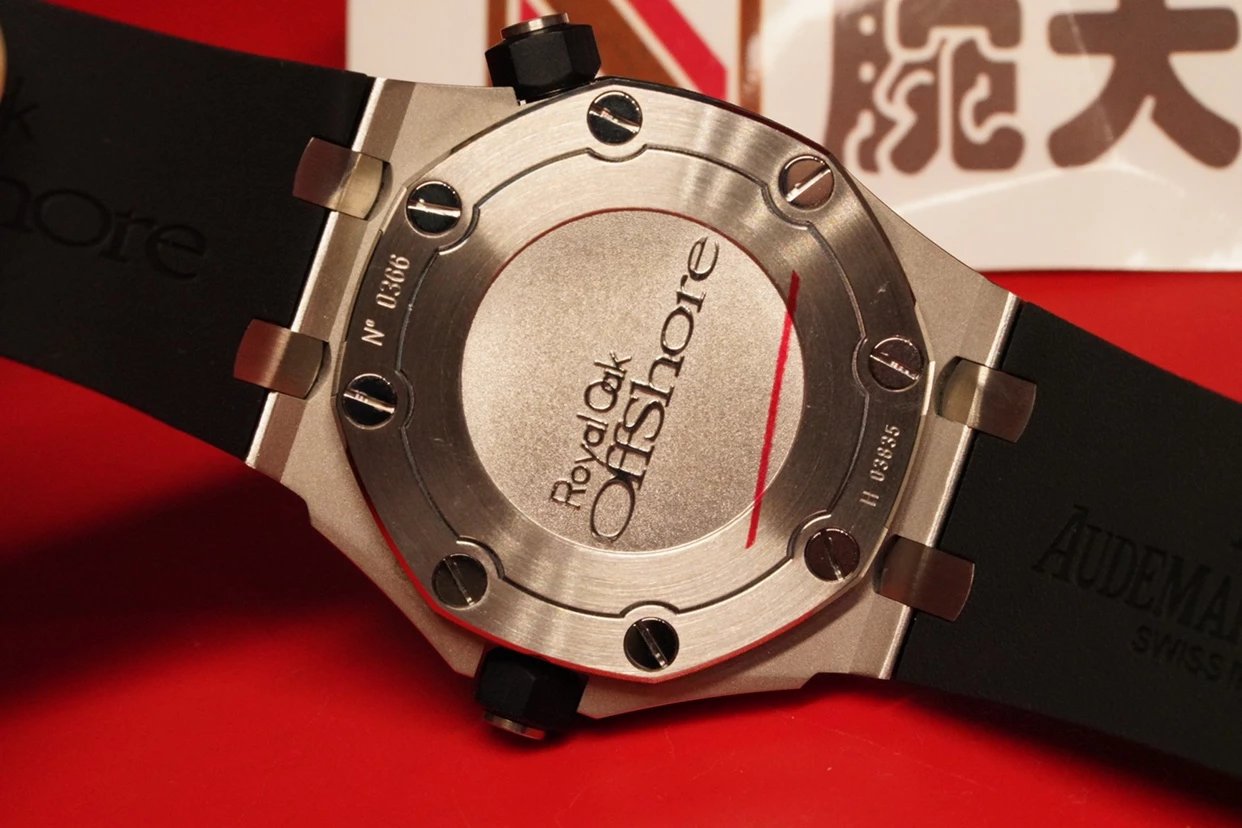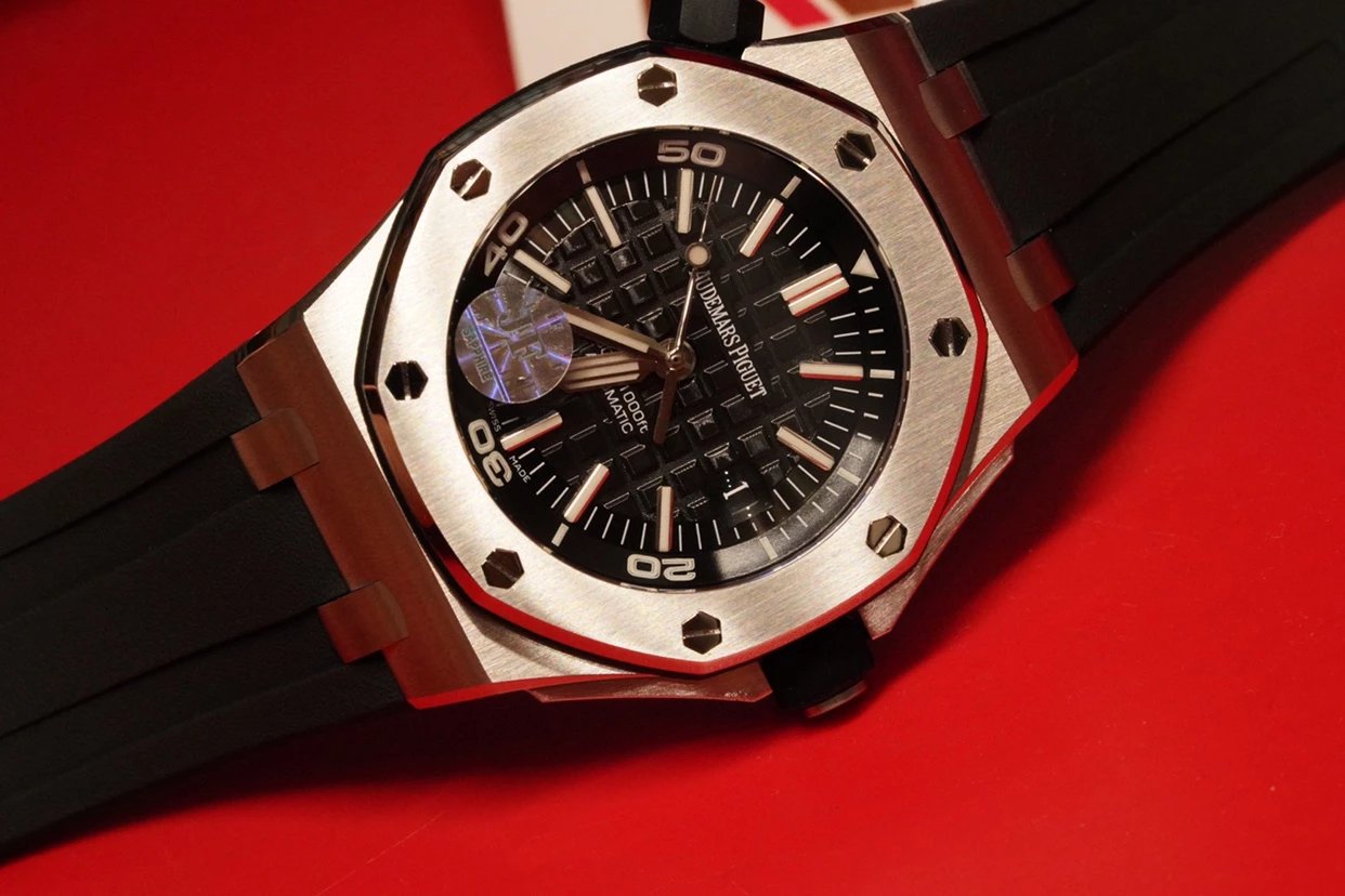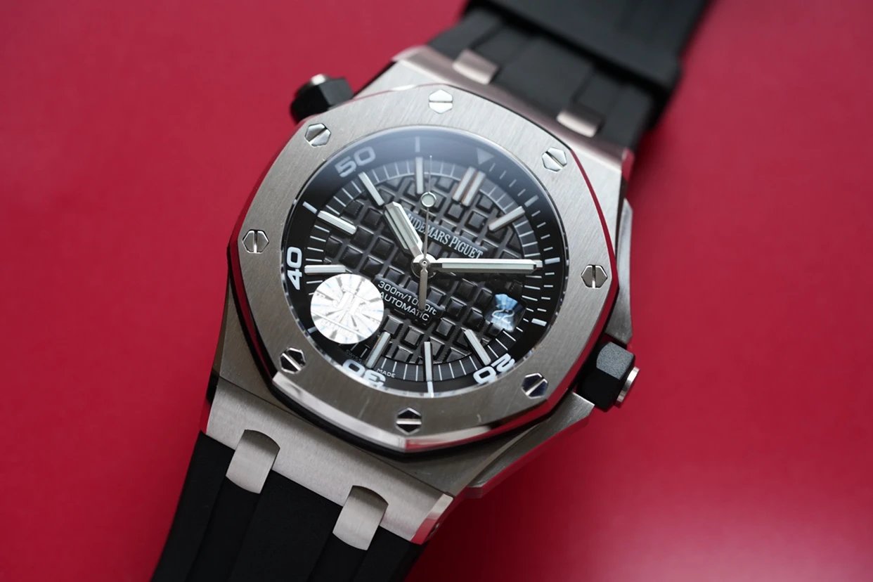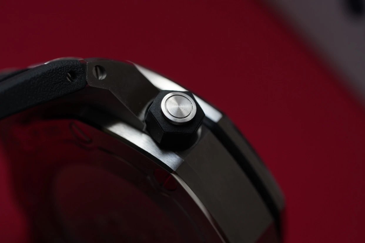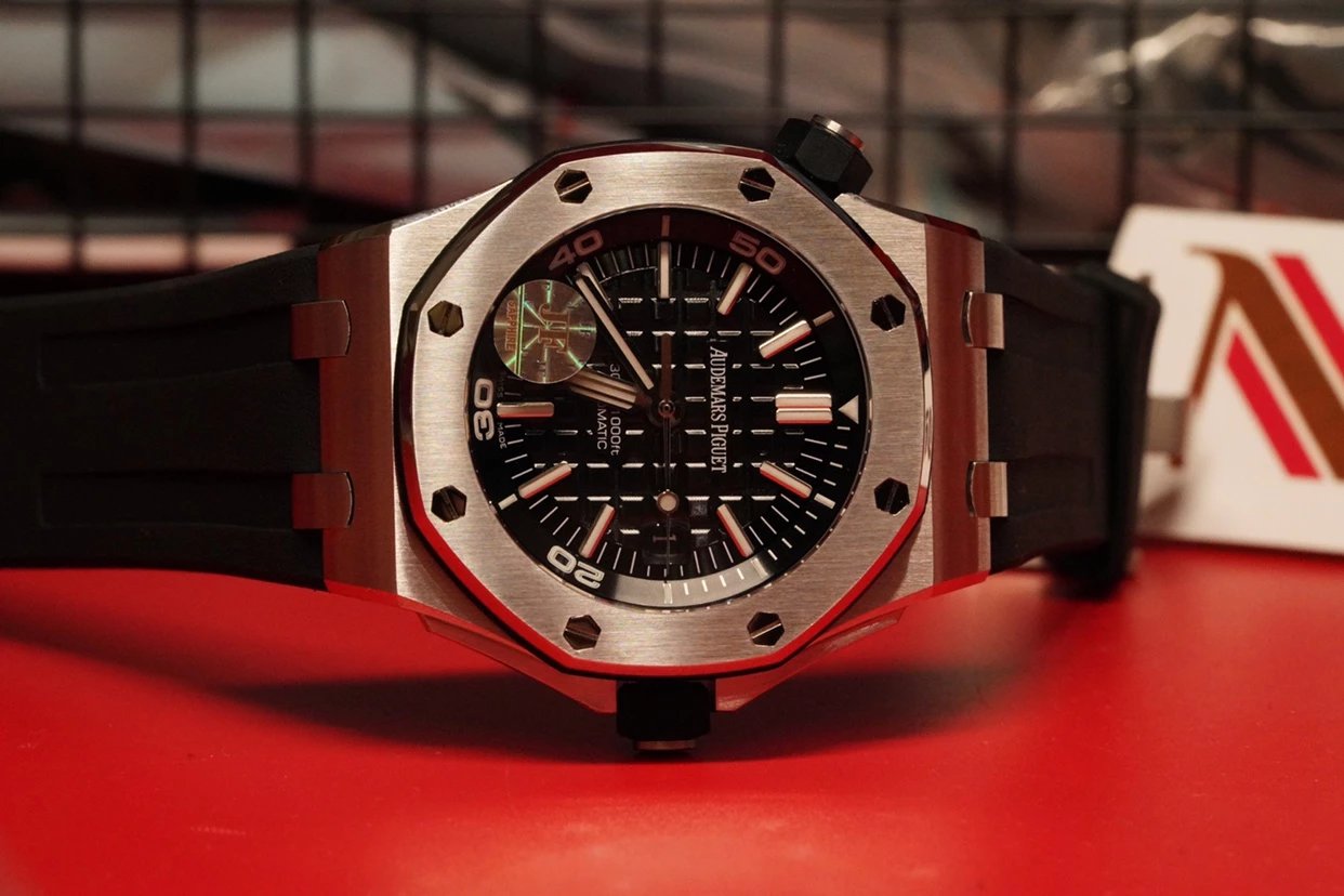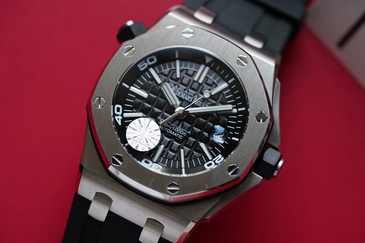 三點鐘方向設有日曆窗口,此次升級了與原裝一致的經典日曆字體。並且日曆的防炫目藍膜效果非常的強勁,無論在哪個角度都能清晰的讀取日曆時間。黑色的錶盤簡約而不簡單,採用的是愛彼獨有的大格紋裝飾。細心的你應該也看到了,在錶盤的外圈還有一個表圈,這是愛彼內置的潛水表圈,通過10點位把頭控制。
