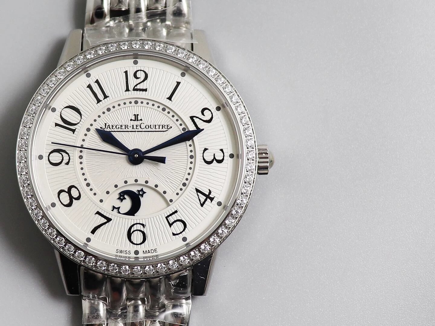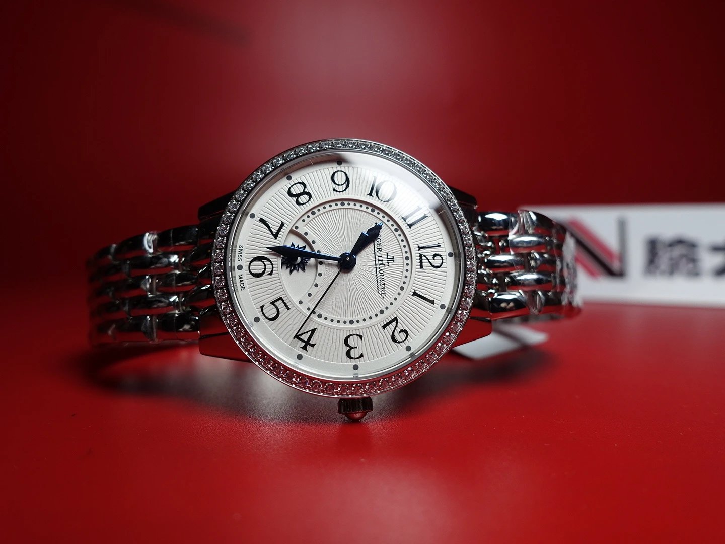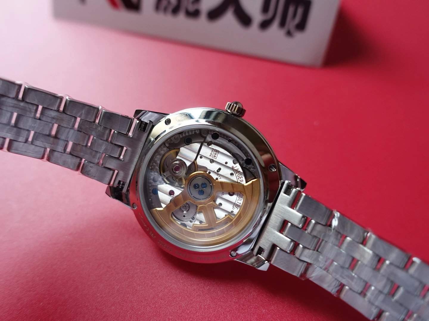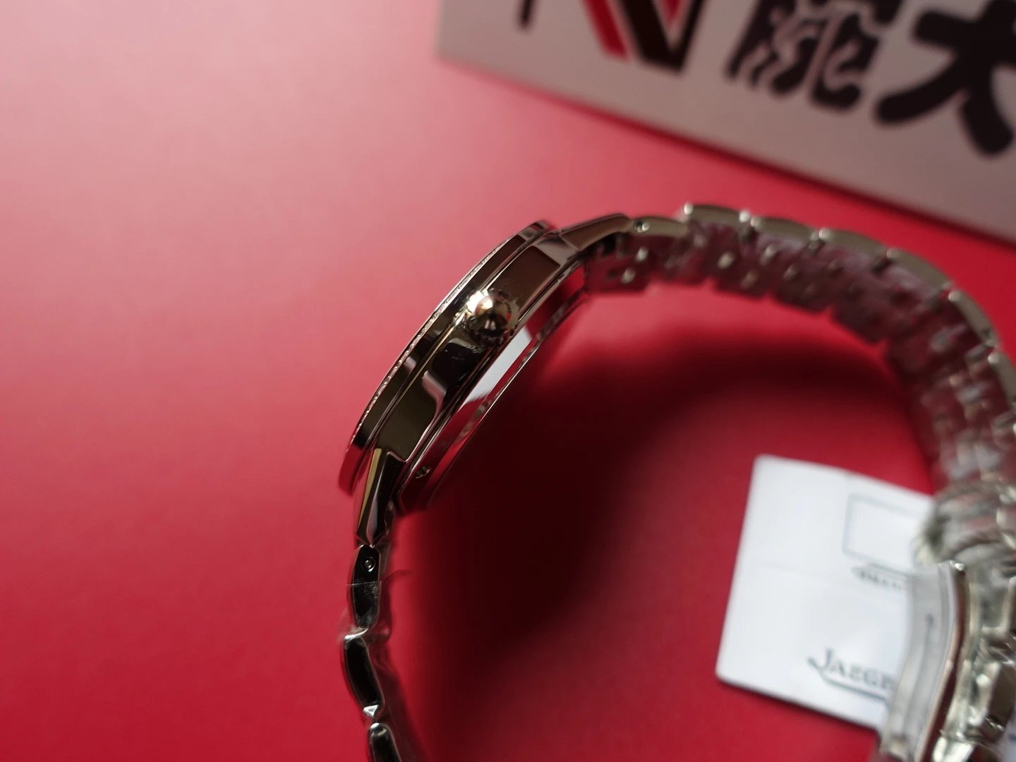 這款積家約會腕表的表鏡為藍寶石鏡面,防刮防磨,非常通透。花體阿拉伯數字時標,採用油壓印刷,對於這種技術並不簡單,因為印出來的效果要有立體感,對著光要有油亮感,而且不允許存在毛刺、段點,一目了然,字體設計高貴優雅。