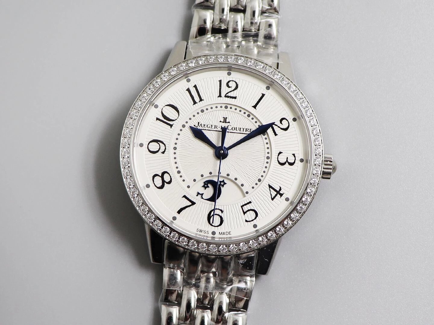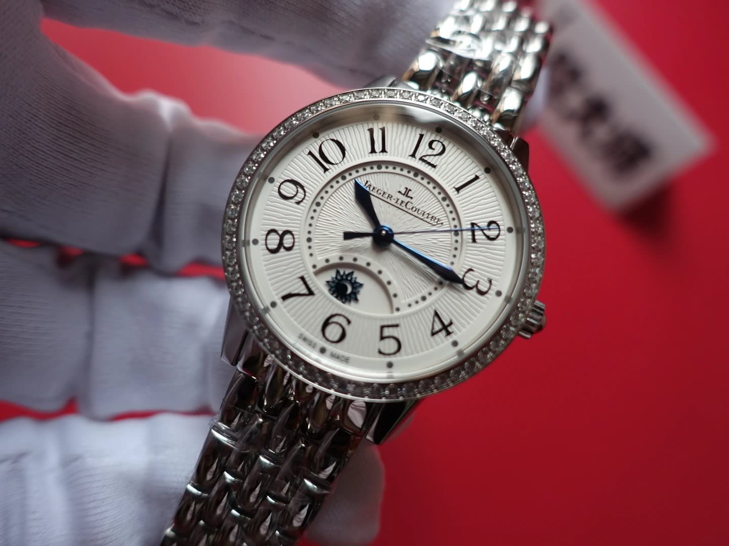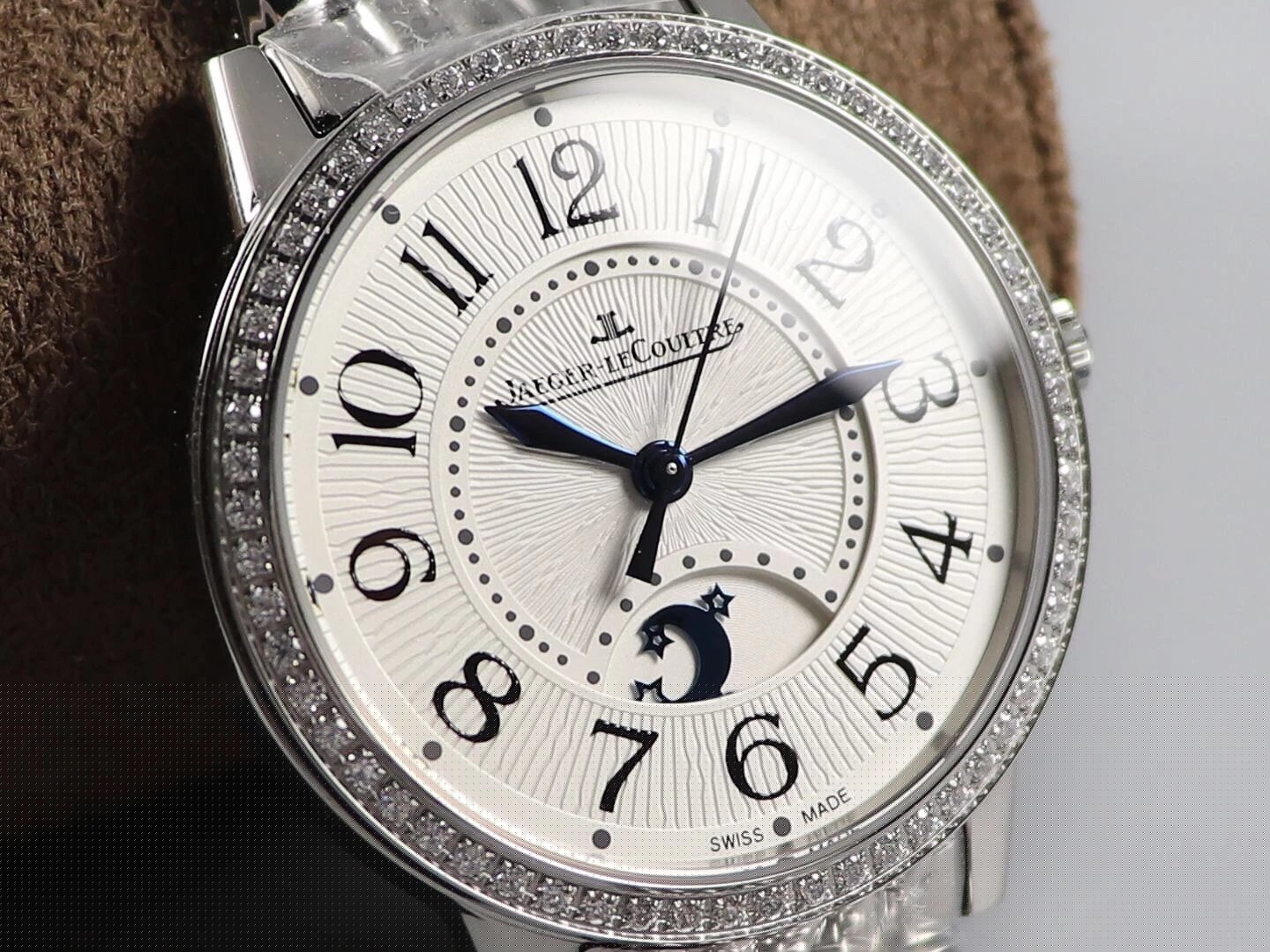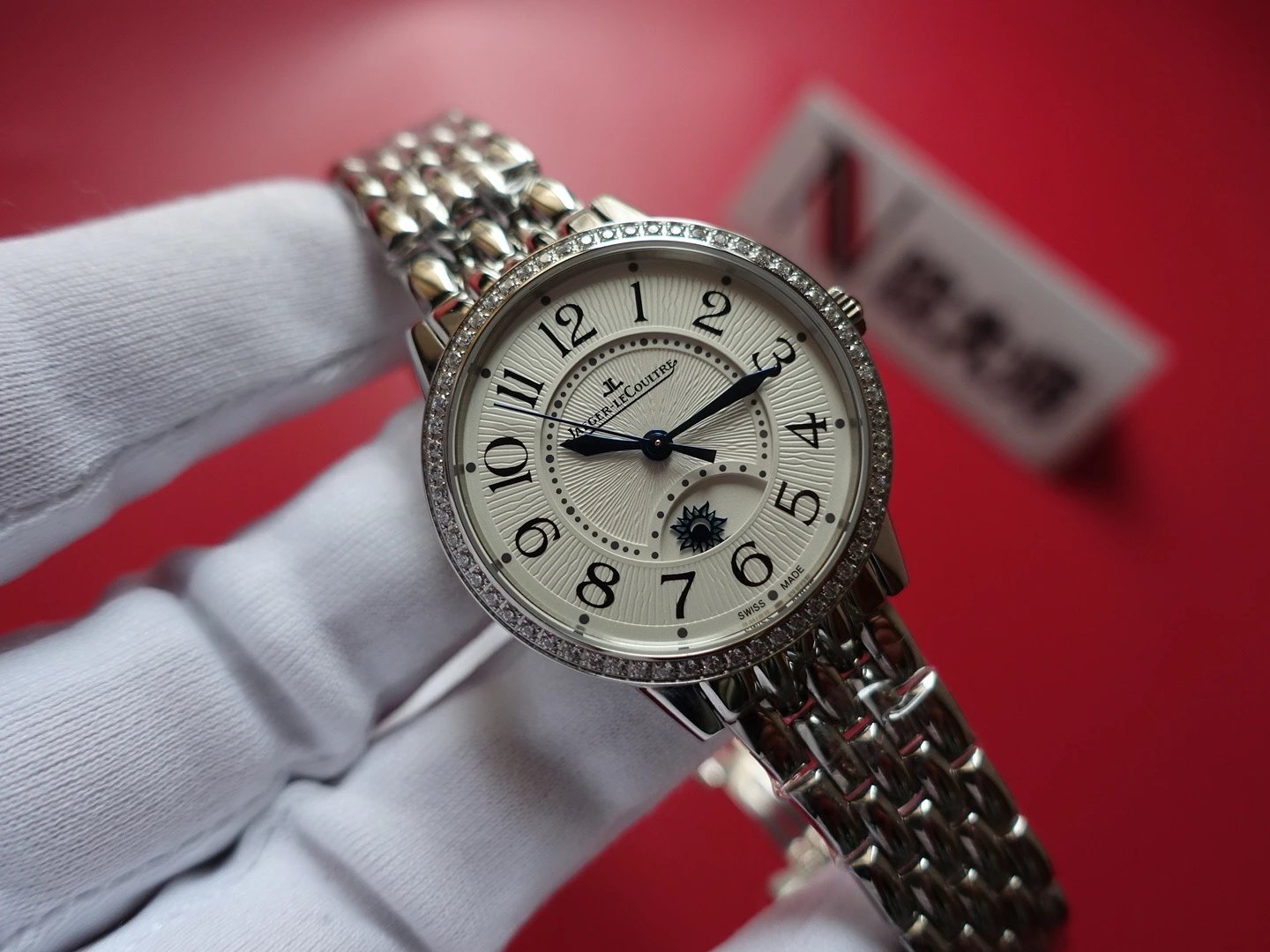 這款積家約會腕表的表鏡為藍寶石鏡面,防刮防磨,非常通透。花體阿拉伯數字時標,採用油壓印刷,對於這種技術並不簡單,因為印出來的效果要有立體感,對著光要有油亮感,而且不允許存在毛刺、段點,一目了然,字體設計高貴優雅。