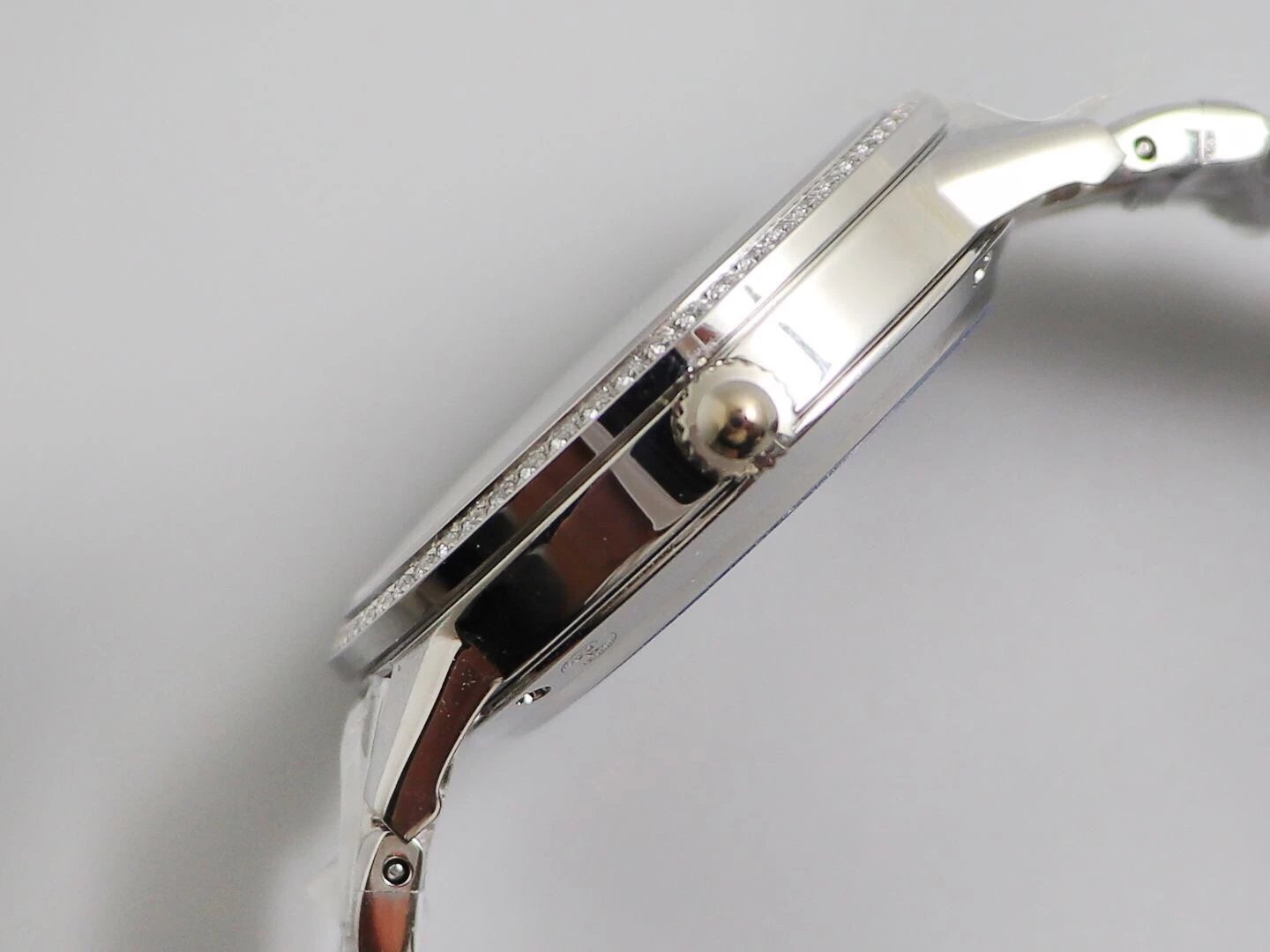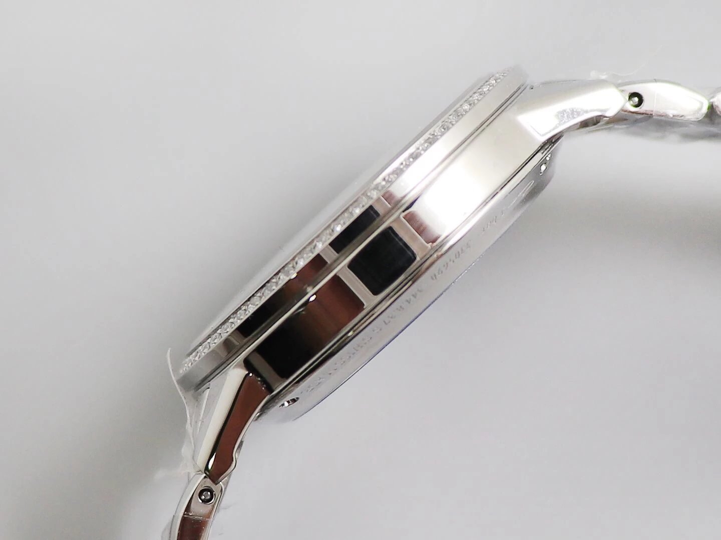 先來整體看下,腕表尺寸為34mm,簡潔大方。表殼採用進口316L精鋼材質打造而成,所有配件大小尺寸都與原裝一致。精鋼表圈上一共鑲有60顆人工鑽共重0.69克拉,每一顆鑽石都晶瑩通透、閃亮耀眼,況且鑽石已經成為大多數奢華女表不可或缺的重要組成部分,當然鑽石也是女人們的最愛。