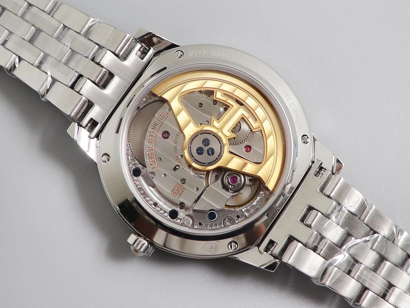 底蓋採用藍寶石水晶背透的設計,透過藍寶石水晶玻璃可以清晰地看到擺輪和出眾的細節。採用9015改積家自產CAL.898A/1機芯,完美實現原裝白晝黑夜變換功能。走時穩定,素質堅挺,拉絲的擺陀做工精緻,藍色螺絲的點綴顯得格外漂亮。