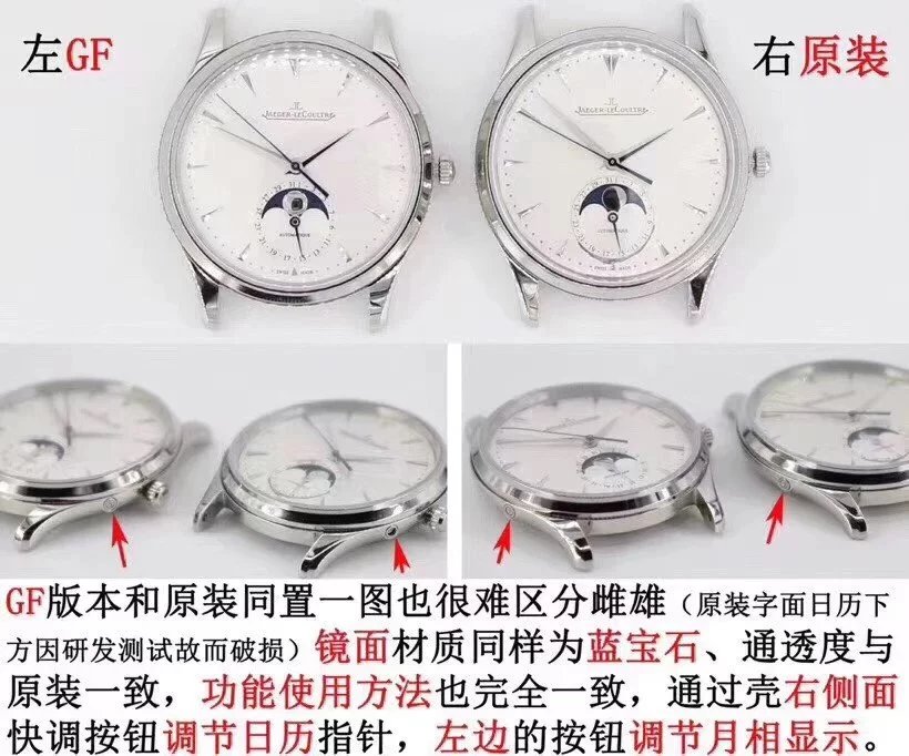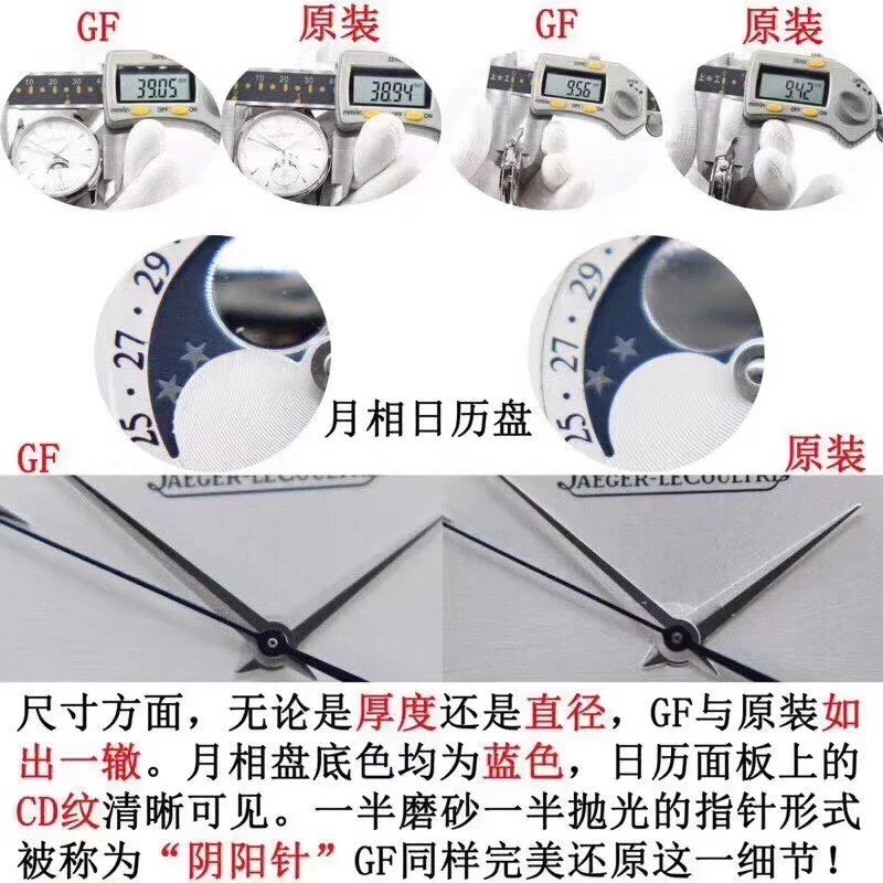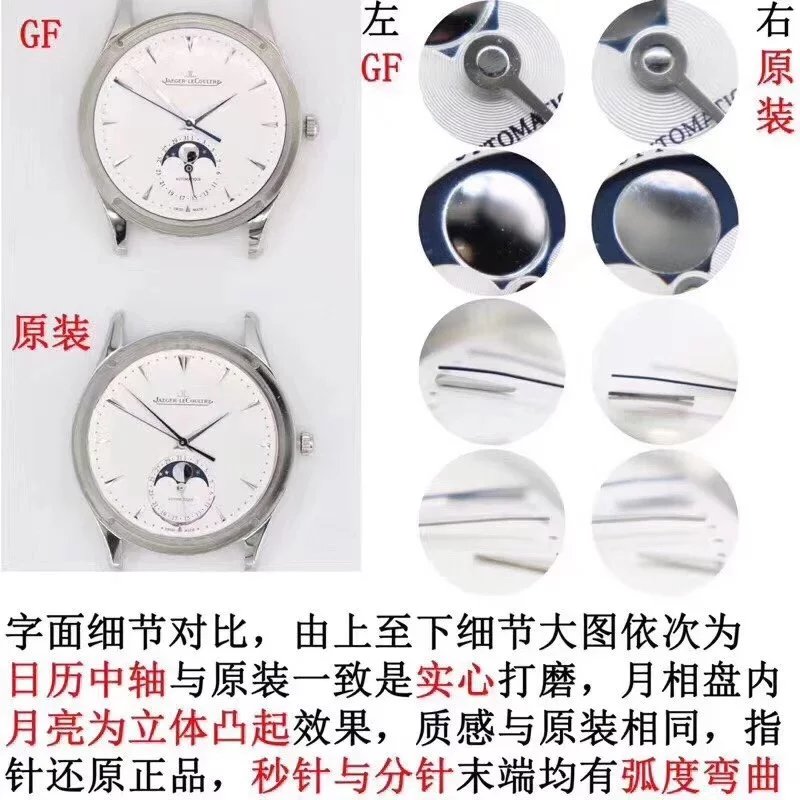GF新品,積家月相大師系列1363540,表殼直徑39mmX9.9mm與原裝同步。六點鐘的子盤擁有陽曆陰曆(月相)雙期顯示,月相一月轉一圈,功能和正品一致。