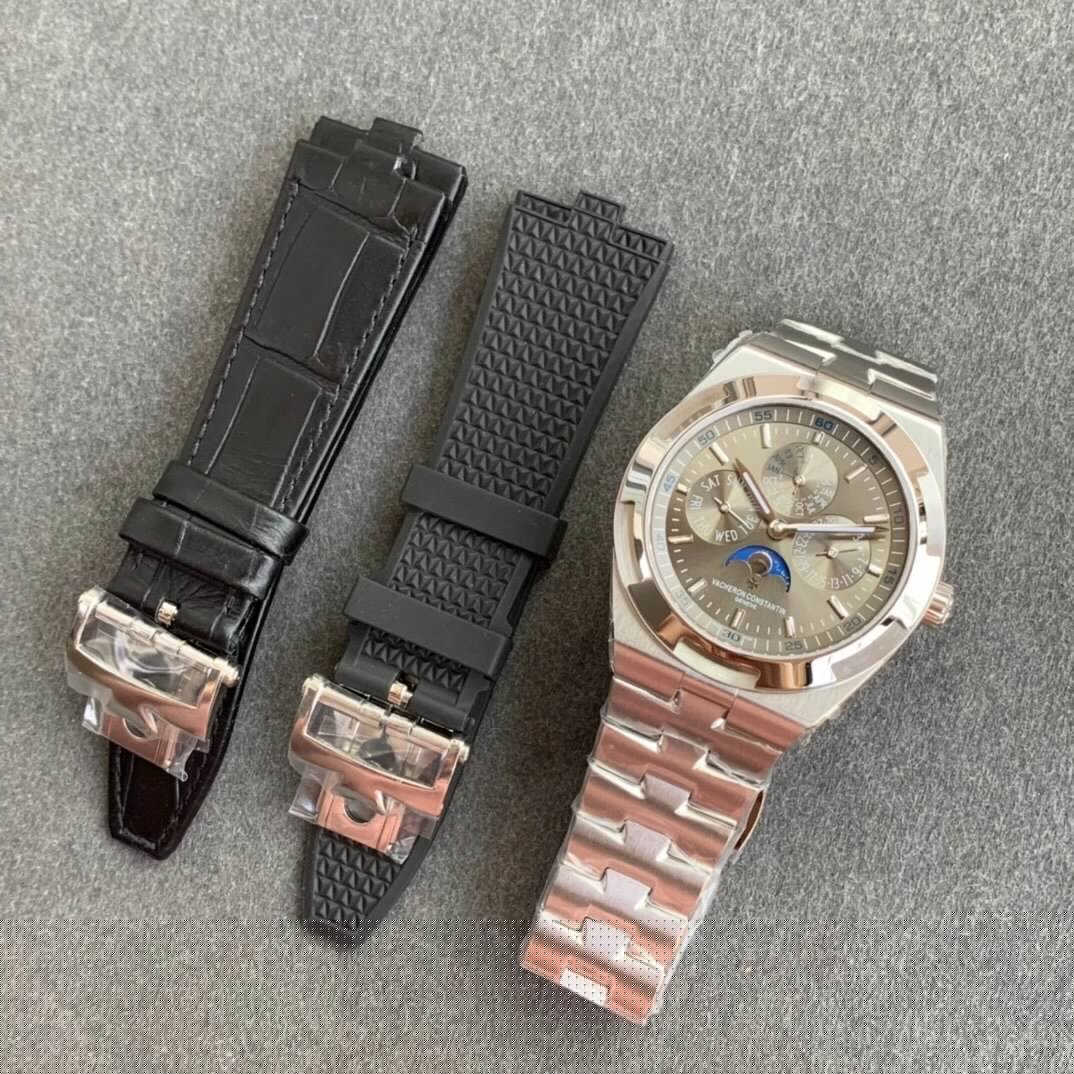 【披星戴月 砥礪前行】8F新品 Overseas縱橫四海4300V系列萬年曆腕表 腕表採用直徑41.5毫米的表殼,搭載自動上鏈機械機芯 1120 QP/1超薄機芯,該機芯配備萬年曆和月相顯示。(9字位星期、3字位日期、12字位月份) 經旭日紋緞面拉絲處理的金質錶盤 以蝸形紋裝飾的小錶盤清晰易讀 搭配造價不菲的指針相得益彰 每一枚腕表都可以配戴一鍵快拆式鋼帶 膠帶 皮帶 歡迎鑒賞