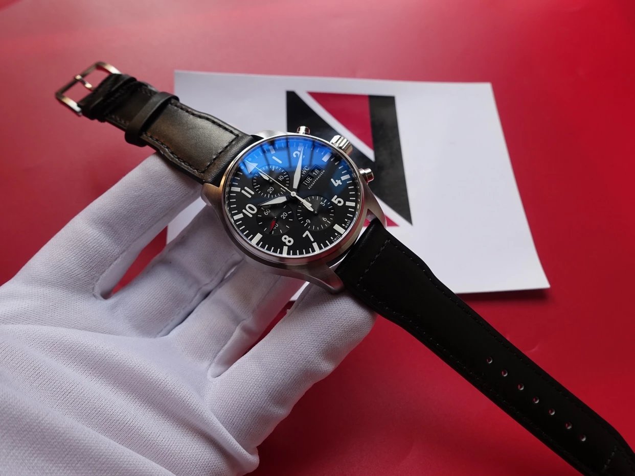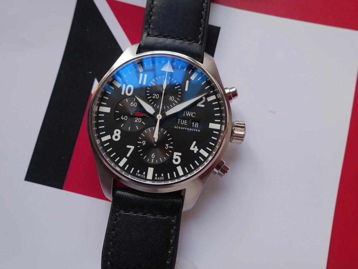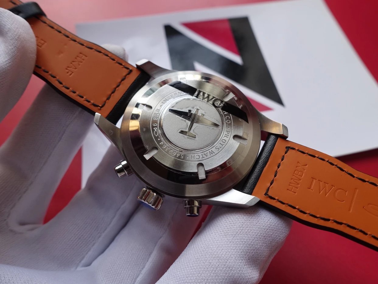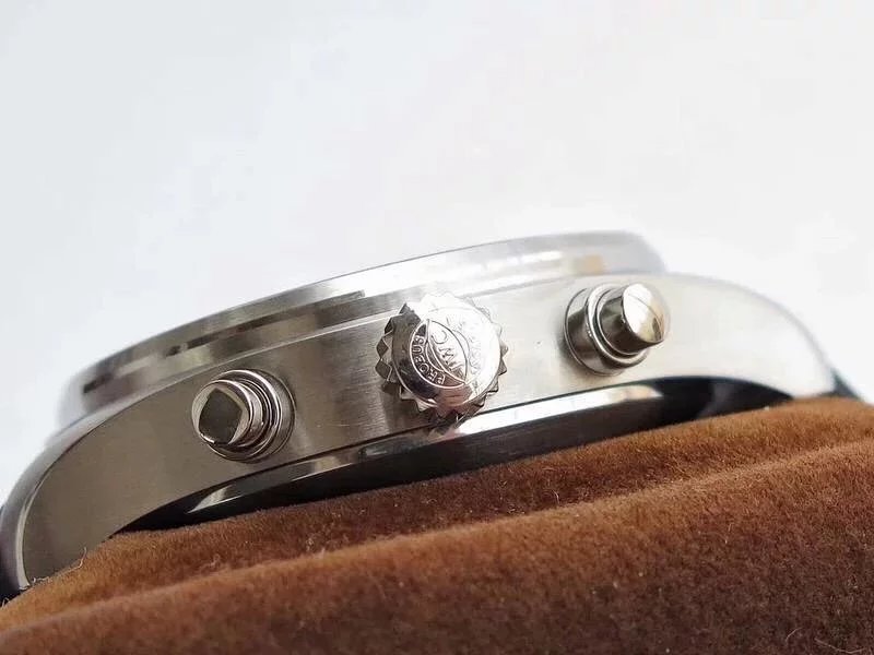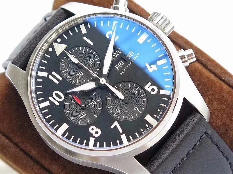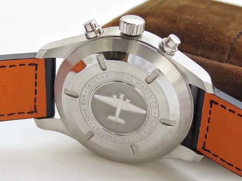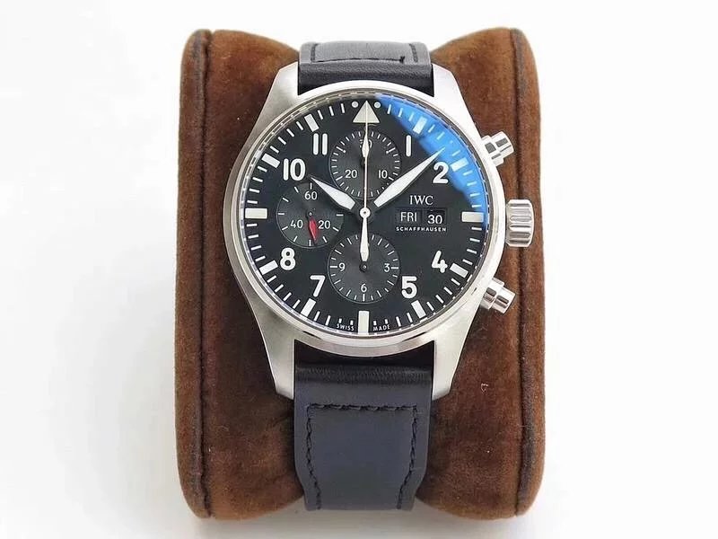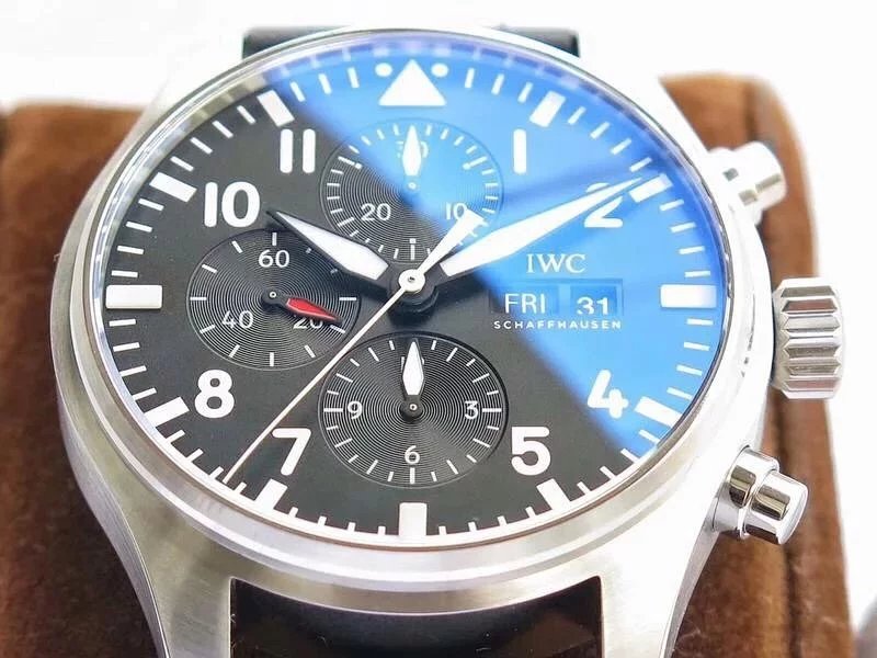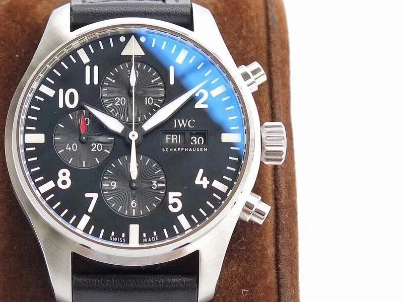ZF萬國飛行員計時IW377713的精鋼表殼側面,拉絲處理細膩,右側把頭的上方時計時開啟暫停按鍵,下方是暫停的按鍵。搭載的是一枚上海7750機芯,很多人覺得它這不耐用,其實大多數情況下是自己使用出問題,比如在手錶7點-3點這個時間段調節星期日曆,導致日曆齒輪斷裂。頻繁開關,導致功能損壞故障。注意了使用方法後,這顆機芯真的是無可厚非,甚至都不亞於海鷗機。棕色的頭層小牛皮錶帶,和煙棕色的錶盤搭配相得益彰,錶帶背面黃色搭配,非常鮮豔,舒適性很不錯。精鋼打磨的針形表扣,經過拉絲處理,上面鐫刻IWC標誌。ZF廠這款表是行業內的常青樹,是計時手錶裏最受歡迎的款式之一。它也必然是你值得去考慮的一個選擇,畢竟每個男人心裏都有一個飛行員的夢。