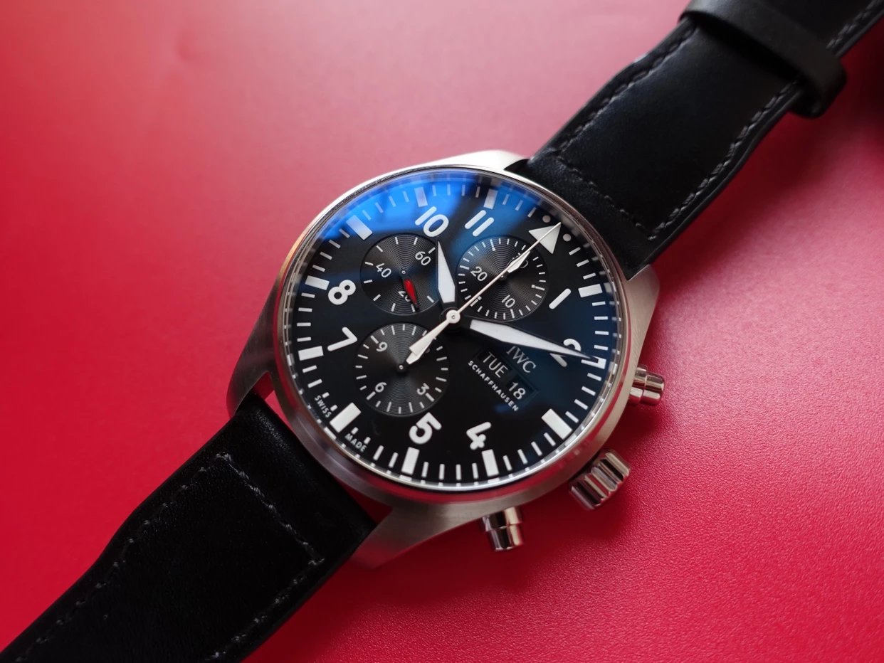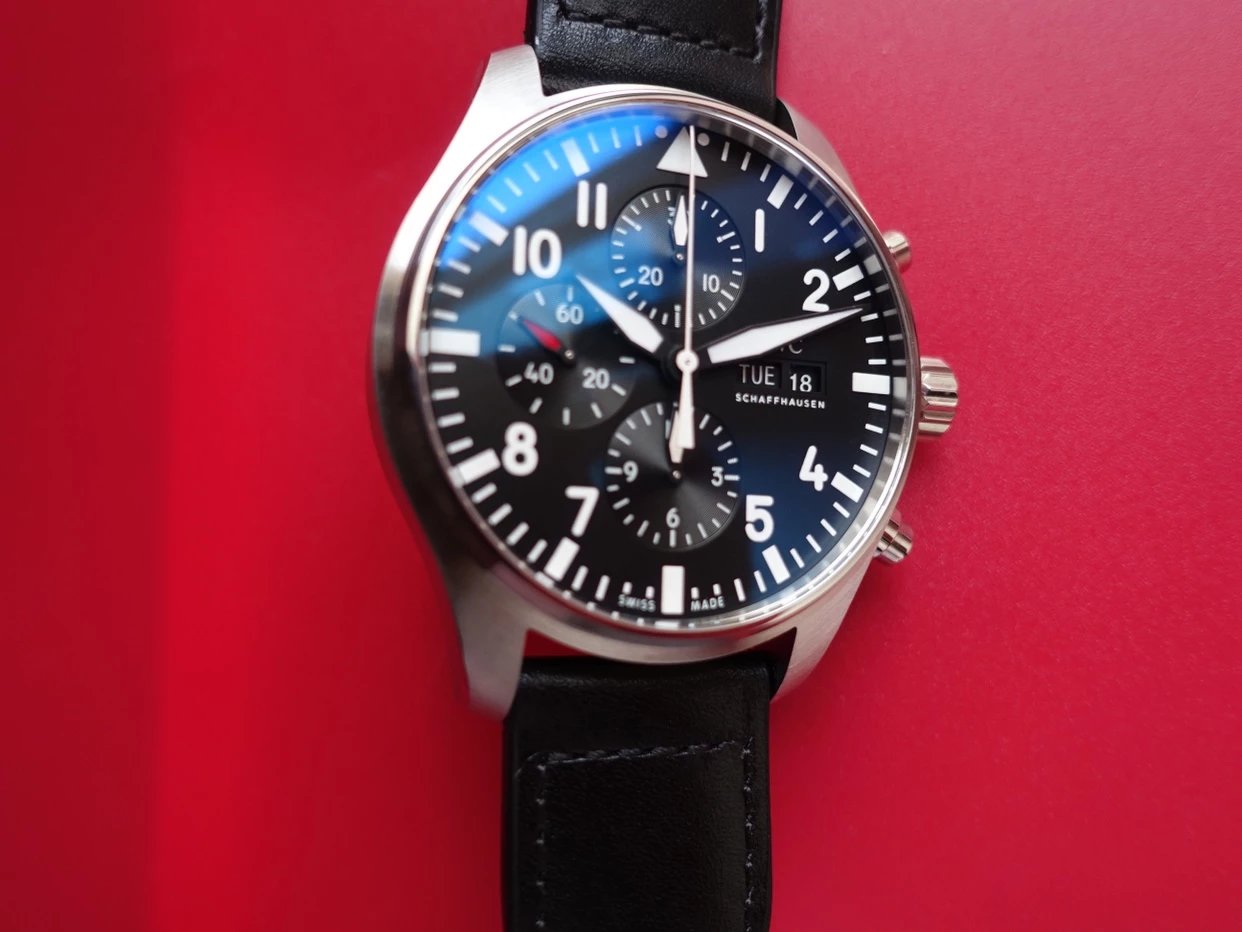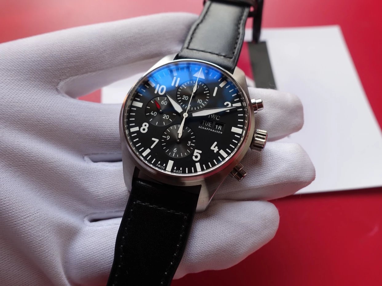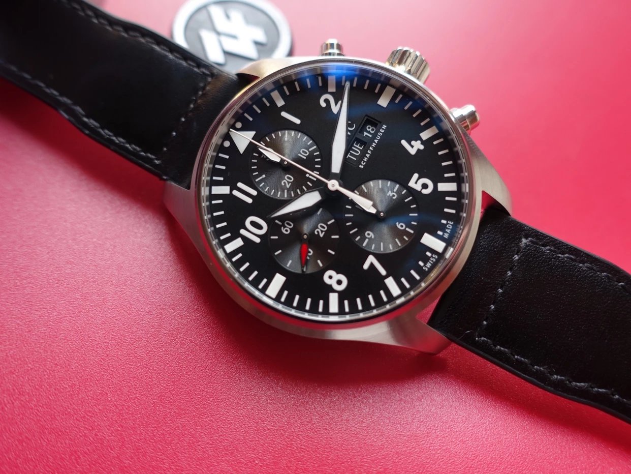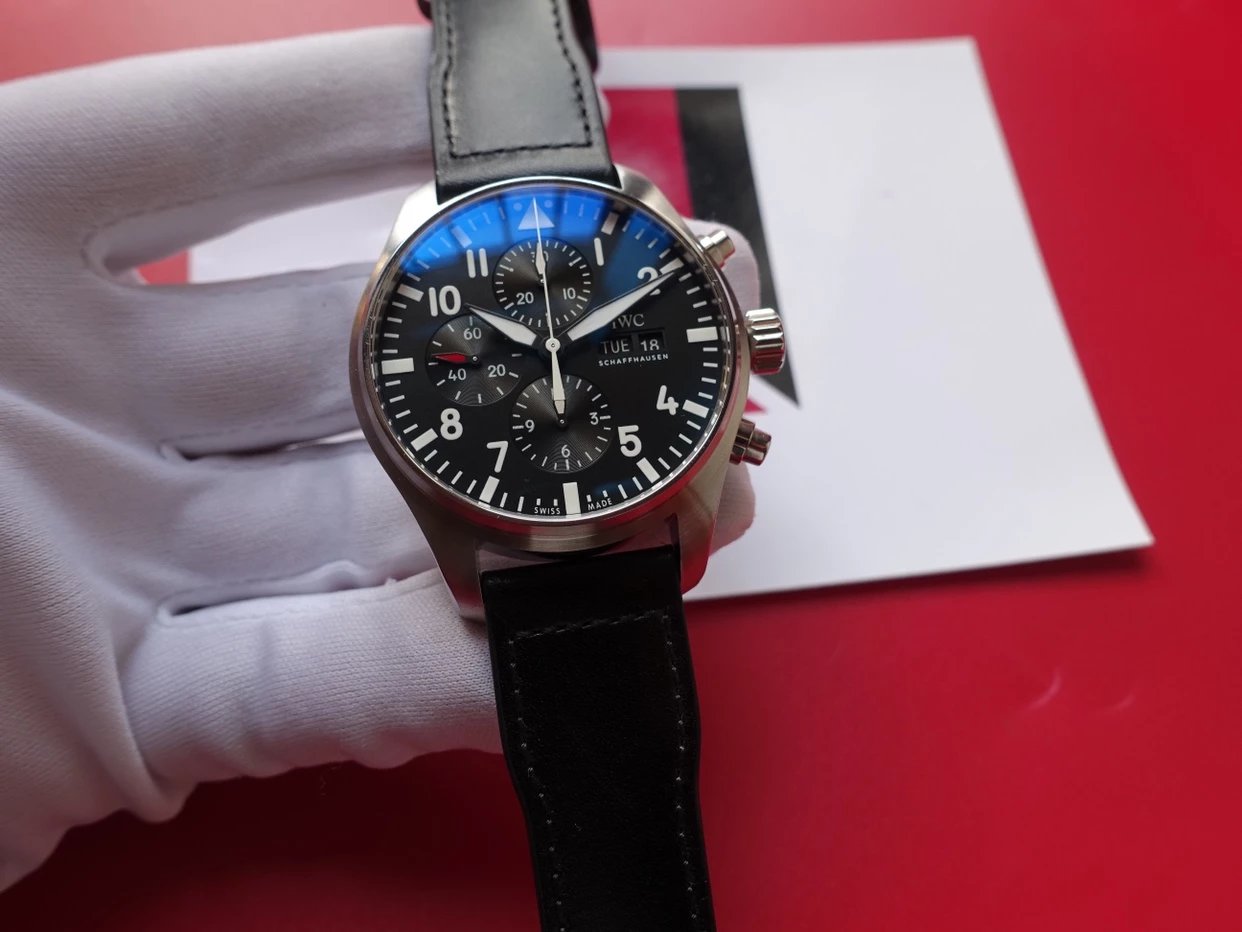ZF萬國飛行員計時IW377713的精鋼表殼側面,拉絲處理細膩,右側把頭的上方時計時開啟暫停按鍵,下方是暫停的按鍵。搭載的是一枚上海7750機芯,很多人覺得它這不耐用,其實大多數情況下是自己使用出問題,比如在手錶7點-3點這個時間段調節星期日曆,導致日曆齒輪斷裂。頻繁開關,導致功能損壞故障。注意了使用方法後,這顆機芯真的是無可厚非,甚至都不亞於海鷗機。棕色的頭層小牛皮錶帶,和煙棕色的錶盤搭配相得益彰,錶帶背面黃色搭配,非常鮮豔,舒適性很不錯。精鋼打磨的針形表扣,經過拉絲處理,上面鐫刻IWC標誌。ZF廠這款表是行業內的常青樹,是計時手錶裏最受歡迎的款式之一。它也必然是你值得去考慮的一個選擇,畢竟每個男人心裏都有一個飛行員的夢。