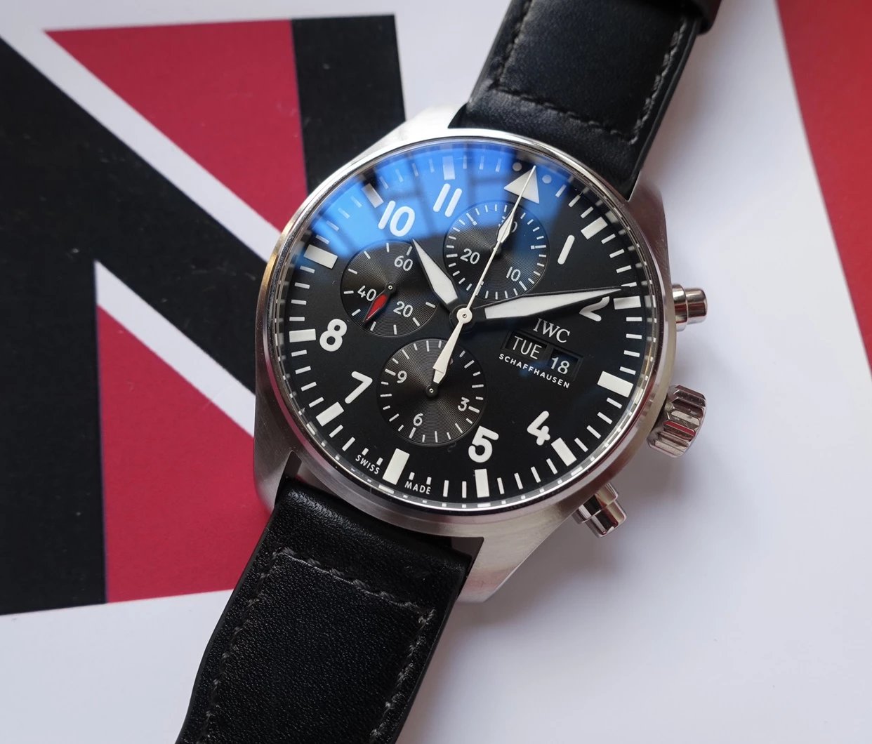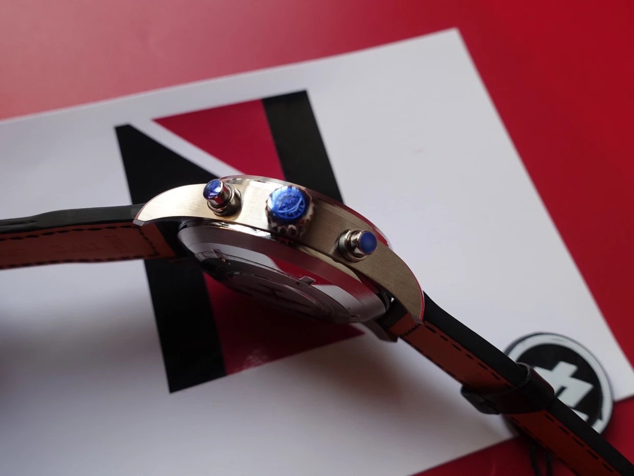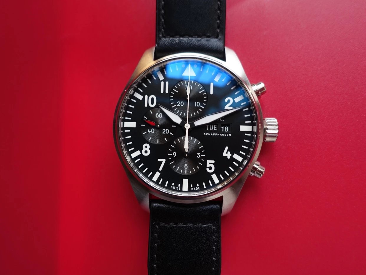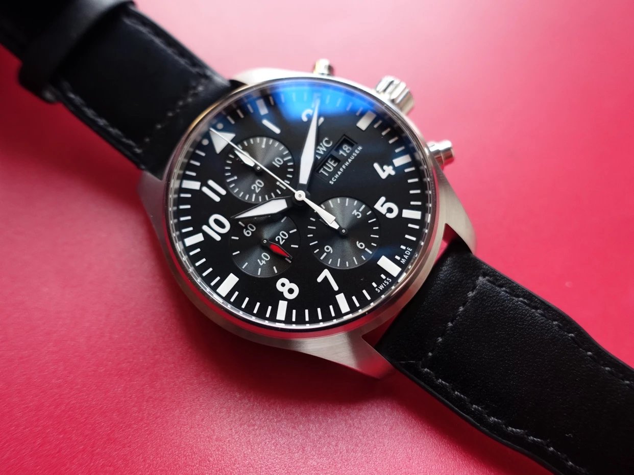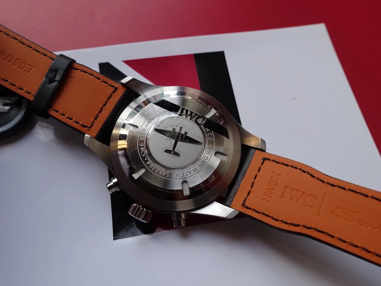 ZF萬國飛行員計時IW377713的精鋼表殼側面,拉絲處理細膩,右側把頭的上方時計時開啟暫停按鍵,下方是暫停的按鍵。搭載的是一枚上海7750機芯,很多人覺得它這不耐用,其實大多數情況下是自己使用出問題,比如在手錶7點-3點這個時間段調節星期日曆,導致日曆齒輪斷裂。頻繁開關,導致功能損壞故障。注意了使用方法後,這顆機芯真的是無可厚非,甚至都不亞於海鷗機。棕色的頭層小牛皮錶帶,和煙棕色的錶盤搭配相得益彰,錶帶背面黃色搭配,非常鮮豔,舒適性很不錯。精鋼打磨的針形表扣,經過拉絲處理,上面鐫刻IWC標誌。ZF廠這款表是行業內的常青樹,是計時手錶裏最受歡迎的款式之一。它也必然是你值得去考慮的一個選擇,畢竟每個男人心裏都有一個飛行員的夢。