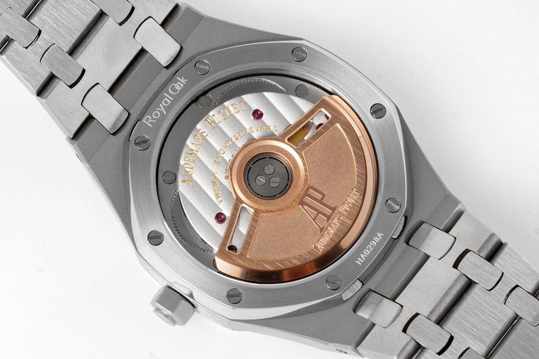 8F新品 直徑34毫米的皇家橡樹系列自動上鏈腕表,以全新表殼尺寸再現這一傳奇系列的前衛風格,並為纖細手腕的佩戴者演繹出別樣的優雅格調。全新腕表均搭載9015改Calibre 5800自動上鏈機芯,採用為該款式特別設計的玫瑰金金自動擺陀。