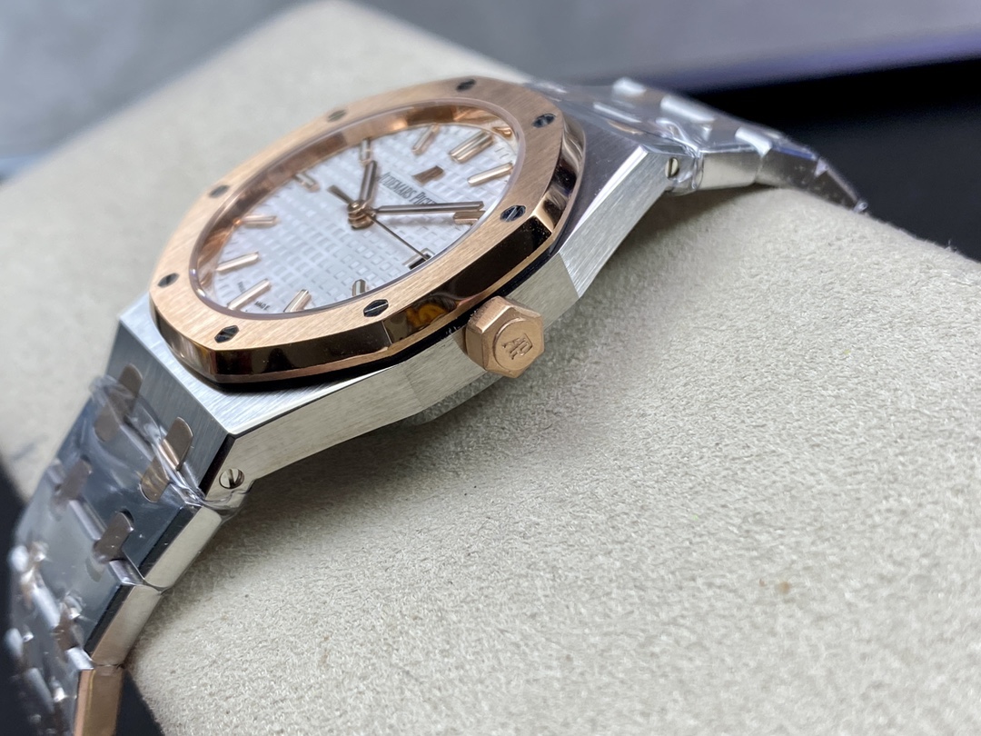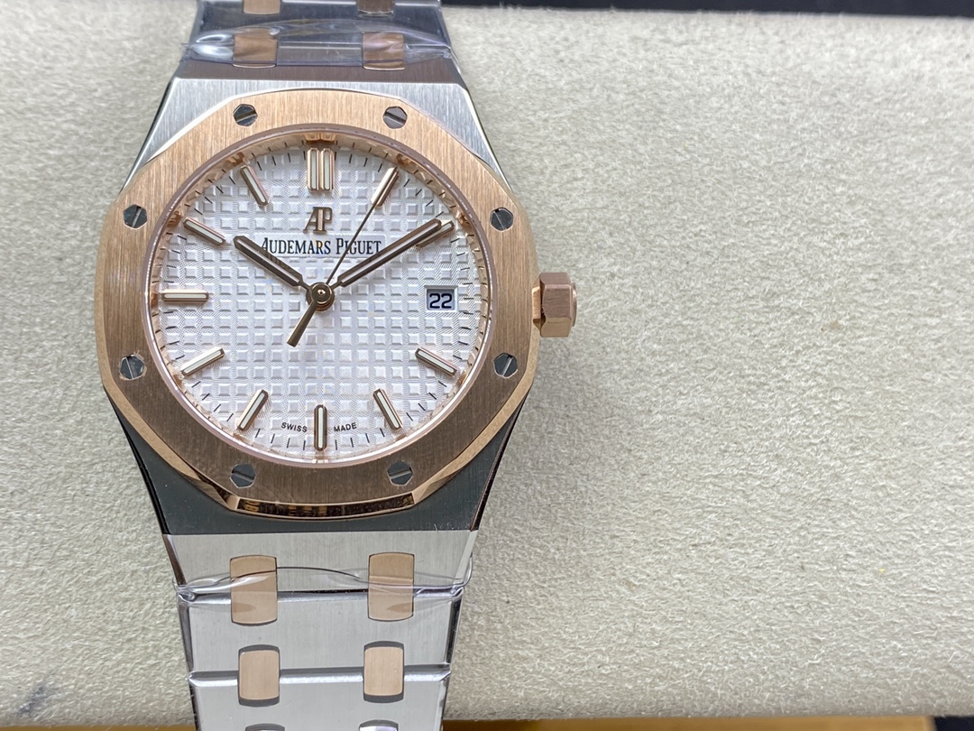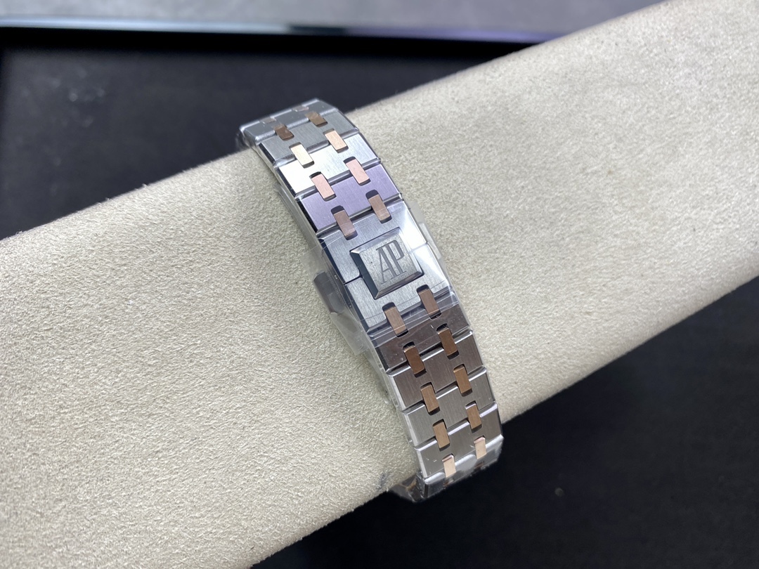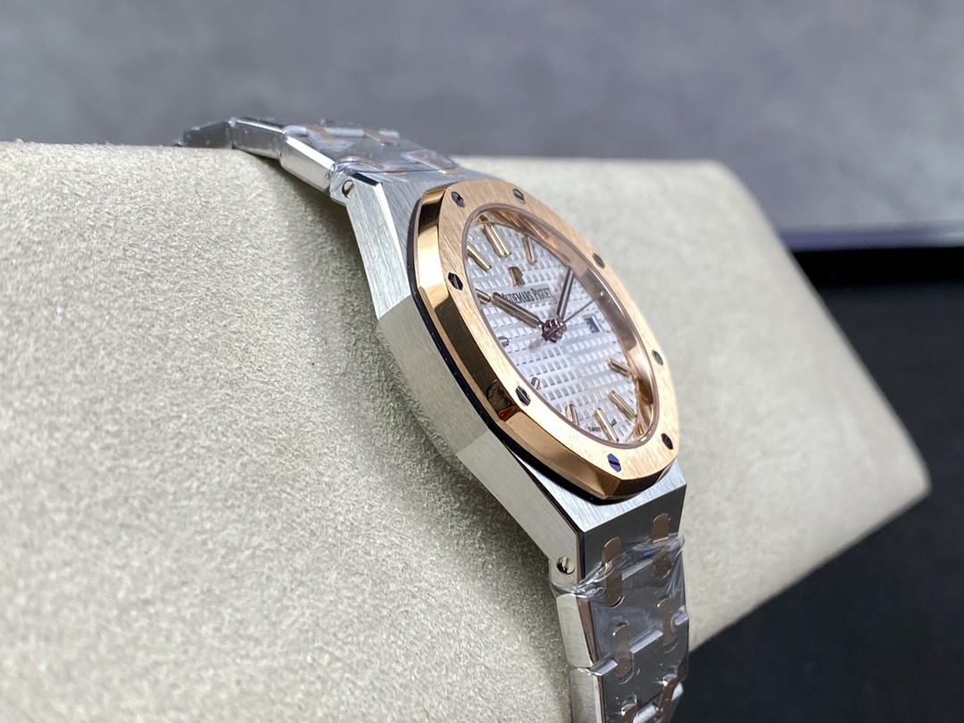 8F愛彼機械女錶77350 77351型號直徑34mm的皇家橡樹系列自動上鏈腕表,以全新錶殼尺寸再現這一傳奇系列的前衛風格,並為纖細手腕的佩戴者演繹出別樣的優雅格調。 全新腕表均搭載9015改Calibre 5800自動上鏈機芯,採用為該款式特別設計的玫瑰金金自動擺陀。